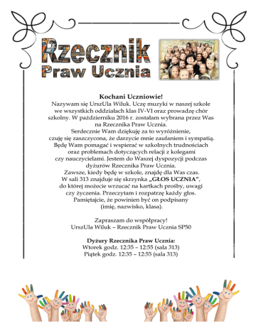 Kochani Uczniowie! Nazywam się UrszUla Wiluk. Uczę muzyki w naszej szkole we wszystkich oddziałach klas IV-VI oraz prowadzę chór szkolny. W październiku 2016 r. zostałam wybrana przez Was na Rzecznika Praw Ucznia. Serdecznie Wam dziękuję za to wyróżnienie, czuję się zaszczycona, że darzycie mnie zaufaniem i sympatią. Będę Wam pomagać i wspierać w szkolnych trudnościach oraz problemach dotyczących relacji z kolegami czy nauczycielami. Jestem do Waszej dyspozycji podczas dyżurów Rzecznika Praw Ucznia. Zawsze, kiedy będę w szkole, znajdę dla Was czas. W sali 313 znajduje się skrzynka „GŁOS UCZNIA”, do której możecie wrzucać na kartkach prośby, uwagi czy życzenia. Przeczytam i rozpatrzę każdy głos. Pamiętajcie, że powinien być on podpisany (imię, nazwisko, klasa). Zapraszam do współpracy! UrszUla Wiluk – Rzecznik Praw Ucznia SP50 Dyżury Rzecznika Praw Ucznia: Wtorek godz. 12:35 – 12:55 (sala 313) Piątek godz. 12:35 – 12:55 (sala 313)