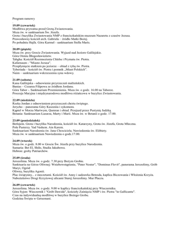 Program ramowy . 19.09 (czwartek) Modlitwa prywatna przed Grotą Zwiastowania. Msza św. w sanktuarium Św. Józefa. Grota i bazylika Zwiastowania NMP z franciszkańskim muzeum Nazaretu z czasów Jezusa. Prawosławny kościół arch. Gabriela – źródło Matki Bożej. Po południu Hajfa. Góra Karmel - sanktuarium Stella Maris. . 20.09 (piątek) Msza św. przy Grocie Zwiastowania. Wyjazd nad Jezioro Galilejskie. Góra Ośmiu Błogosławieństw. Tabgha: Kościół Rozmnożenia Chleba i Prymatu św. Piotra. Kafarnaum - "Miasto Jezusa". Przepłynięcie statkiem po jeziorze – obiad z rybą św. Piotra. Tyberiada – kościół św. Piotra i pomnik „Miast Polskich”. Naim – sanktuarium wskrzeszenia syna wdowy. . 21.09 (sobota) Kana Galilejska - odnowienie przyrzeczeń małżeńskich. Banias – Cezarea Filipowa ze źródłem Jordanu. Góra Tabor -. Sanktuarium Przemienienia. Msza św. o godz. 16.00 na Taborze. Procesja Maryjna i międzynarodowa modlitwa różańcowa w bazylice Zwiastowania. . 22.09 (niedziela) Rzeka Jordan z odnowieniem przyrzeczeń chrztu świętego. Jerycho – panorama Góry Kuszenia i sykomora. Kąpiel w Morzu Martwym, Qumran i obiad. Przejazd przez Pustynię Judzką. Betania: Sanktuarium Łazarza, Marty i Marii. Msza św. w Betanii o godz. 17.00. . 23.09 (poniedziałek) Betlejem. Grota i bazylika Narodzenia, kościół św. Katarzyny, Grota św. Józefa, Grota Mleczna. Pole Pasterzy. Yad Vashem. Ain Karem. Sanktuarium Narodzenia św. Jana Chrzciciela; Nawiedzenia św. Elżbiety. Msza św. w sanktuarium Nawiedzenia o godz.17.00. . 24.09 (wtorek) Msza św. o godz. 8.00 w Grocie Św. Józefa przy bazylice Narodzenia. Samaria: Bet El, Shilo, Studia Jakubowa. Hebron: groby Patriarchów. . 25.09 (środa) Jerozolima. Msza św. o godz. 7.30 przy Bożym Grobie. Sanktuaria na Górze Oliwnej: Wniebowstąpienie, "Pater Noster", "Dominus Flevit", panorama Jerozolimy, Grób Maryi, Ogród Oliwny, bazylika Agonii. Plac świątynny... z meczetami. Kościół św. Anny i sadzawka Betesda, kaplica Biczowania i Włożenia Krzyża. Nabożeństwo Drogi Krzyżowej ulicami Starej Jerozolimy. Mur Płaczu. . 26.09 (czwartek) Jerozolima. Msza św. o godz. 9.00 w kaplicy franciszkańskiej przy Wieczerniku. Góra Syjon: Wieczernik i "Grób Dawida", kościoły Zaśnięcia NMP i św. Piotra "in Gallicantu". Czas na indywidualną modlitwę w bazylice Bożego Grobu. Godzina Święta w Getsemani.