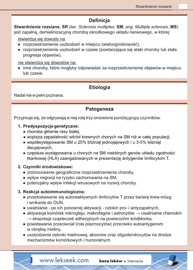 Stwardnienie rozsiane Definicja Stwardnienie rozsiane, SR (łac. Sclerosis multiplex, SM; ang. Multiple sclerosis, MS) jest zapalną, demielinizacyjną chorobą ośrodkowego układu nerwowego, w której: stwierdza się dowody na: rozprzestrzenienie uszkodzeń w miejscu (wieloogniskowość), l rozprzestrzenienie uszkodzeń w czasie (powtarzające się ataki choroby lub stała progresja objawów), l nie stwierdza się dowodów na: inne choroby, które mogłyby odpowiadać za rozprzestrzenienie objawów w miejscu lub czasie. l Etiologia Nadal nie w pełni poznana. Patogeneza Przyjmuje się, że odgrywają w niej rolę trzy omówione poniżej grupy czynników. 2. Czynniki środowiskowe: l zróżnicowanie geograficzne rozprzestrzenienia choroby, l wpływ migracji na ryzyko zachorowania na SM, l potencjalny wpływ infekcji wirusowych na rozwój choroby. 3. Reakcja autoimmunologiczna: l przedostawanie się autoreaktywnych limfocytów T przez barierę krew-mózg i wnikanie do OUN, l uwalnianie - po ich ponownej aktywacji - cytokin pro- i antyzapalnych, l aktywacja komórek mikrogleju, makrofagów i astrocytów → uwalnianie chemokin → ekspresja cząsteczek adhezyjnych na powierzchni śródbłonka, l powstawanie przeciwciał (rola plazmocytów) przeciwko autoantygenom w obrębię mieliny, l uszkodzenie osłonki mielinowej, aksonów oraz oligodendrocytów na drodze mechanizmów komórkowych i humoralnych. Stwardnienie rozsiane Podział kliniczny W zależności od przebiegu SM wyróżnia się następujące 4 postaci choroby: 1. rzutowo-remisyjną: l wyraźnie występujące rzuty z całkowitym lub częściowym powrotem funkcji, l w okresach pomiędzy rzutami - brak progresji choroby; 2. pierwotnie postępującą: l od samego początku - przebieg postępujący, l niekiedy - okresy plateau; 3. wtórnie postępującą: l początkowo - przebieg z rzutami i remisjami, po których dochodzi do progresji, l w okresie progresji mogą okazjonalnie występować rzuty choroby i fazy plateau; 4. postępująca z rzutami: l od początku – przebieg postępujący z wyraźnymi rzutami, l w okresach pomiędzy rzutami - progresja choroby. Rozpoznanie Symtomatologia Objawy początkowe: częste (występowanie >4%): zaburzenia czucia w kończynach, l pogorszenie ostrości wzroku, l stopniowo narastające objawy ruchowe, l podwójne widzenie, l zaburzenia chodu; l mniej częste (występowanie od 1do 4%): l objawy ruchowe o nagłym początku, l objawy czuciowe w zakresie twarzy, l zaburzenia równowagi, l zawroty głowy, l objaw Lhermitte' a, l zaburzenia w oddawaniu moczu, l ataksja kończyn, l objawy ostrego poprzecznego uszkodzenia rdzenia. Najczęstsze objawy w zaawansowanym stwardnieniu rozsianym: l l l l l niedowład spastyczny, objawy móżdżkowe (ataksja, drżenie, dyzartria), zaburzenia funkcji pęcherza moczowego, zaburzenia funkcji jelit (zaparcia), zaburzenia czucia głębokiego, l l l l l zaburzenia ostrości wzroku, oczopląs, zaburzenia poznawcze, depresja, zmęczenie. Stwardnienie rozsiane Diagnostyka Kryteria diagnostyczne 1. Postać z rzutami i remisjami: Liczba rzutów choroby Liczba ognisk Dodatkowe wymagania ---------------- 2 lub więcej 1 1 2 lub więcej zmiany w NMR rozsiane w czasie lub drugi rzut choroby 1 1 ORAZ : Prezentacja kliniczna Progresja objawów neurologicznych sugerująca SM Dodatkowe wymagania Stwardnienie rozsiane Definicje kryteriów diagnostycznych w badaniu NMR Zmiany rozsiane w miejscu: obecne trzy (3) spośród czterech (4) zmian: l 1 ognisko ulegające wzmocnieniu gadolinowemu lub 9 ognisk hiperintensywnych w czasie T2, l przynajmniej 1 ognisko położone podnamiotowo, l przynajmniej 1 ognisko położone podkorowo, l przynajmniej 3 ogniska położone okołokomorowo (1 ognisko w rdzeniu kręgowym odpowiada ognisku podnamiotowemu w mózgu). Zmiany rozsiane w czasie: l obecność ogniska ulegającego wzmocnieniu gadolinowemu w badaniu wykonanym przynajmniej 3 miesiące po rzucie choroby w miejscu innym niż odpowiedzialne za rzut lub l obecność nowego ogniska T2 w badaniu wykonanym przynajmniej 30 dni po rzucie choroby. Pozytywny wynik PMR (badania płynu mózgowo-rdzeniowego) obecność w nim oligoklonalnych immunoglobulin i/lub podwyższony wskaźnik IgG. Pozytywny wynik WPW (wzrokowych potencjałów wywołanych) opóźnionej, lecz dobrze zachowanej fali potencjału wzrokowego. obecność Postępowanie lecznicze Leczenie ostrego rzutu choroby: l metyloprednizolon - dożylnie we wlewie kroplowym 500-1000 mg/dobę przez 3-7 dni; leczenie można uzupełnić podawaniem przez kilka tygodni prednizonu doustnie w dawce początkowej 60 mg/dobę, a następnie stopniowo zmniejszanej, l kortykosteroidy doustnie (w lżejszych rzutach): prednizon względnie metyloprednizolon. Uwaga! W przypadku pozagałkowego zapalenia nerwu wzrokowego - wyraźna przewaga podawanego dożylnie metyloprednizolonu nad doustnie podawanym prednizonem. Leczenie modyfikujące przebieg choroby o postaci z rzutami i remisjami: Stosuje się albo preparaty interferonów (IFN): beta-1a lub -1b, albo octan glatirameru, będący solą sodowa syntetycznych polipeptydów złożonych z 4 naturalnie występujących aminokwasów: L-alaniny, L-kwasu glutaminowego, L-lizyny i L-tyrozyny ( tabela na str. 5). Objawy uboczne przy stosowaniu preparatów interferonu (IFN) beta: gorączka, bóle mięśni, dreszcze (objawy grypopodobne), reakcje skórne w miejscu wstrzyknięcia leku, wzrost miana enzymów wątrobowych (zalecane niewielkie dawki sterydów lub niesteroidowe leki przeciwzapalne). Objawy uboczne przy stosowaniu octanu glatirameru: reakcje miejscowe w miejscu wstrzyknięć leku (zaczerwienienie, ból, obrzęk), reakcje ogólne (ucisk w klatce piersiowej, bicie serca, duszność) u ok. 15% chorych. Stwardnienie rozsiane Tabela porównawcza wyników prób klinicznych* z lekami immunomodulującymi w leczeniu pacjentów z SM o postaci z rzutami i remisjami Próba kliniczna IFN ß-1b (1993) Betaferon ® IFN ß-1a (1996) Av