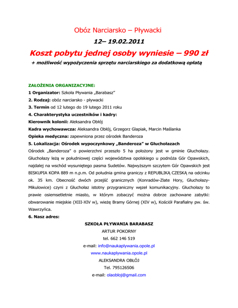 Obóz Narciarsko – Pływacki 12– 19.02.2011 Koszt pobytu jednej osoby wyniesie – 990 zł + możliwość wypożyczenia sprzętu narciarskiego za dodatkową opłatą ZAŁOŻENIA ORGANIZACYJNE: 1 Organizator: Szkoła Pływania „Barabasz” 2. Rodzaj: obóz narciarsko - pływacki 3. Termin od 12 lutego do 19 lutego 2011 roku 4. Charakterystyka uczestników i kadry: Kierownik kolonii: Aleksandra Obłój Kadra wychowawcza: Aleksandra Obłój, Grzegorz Glapiak, Marcin Maślanka Opieka medyczna: zapewniona przez ośrodek Banderoza 5. Lokalizacja: Ośrodek wypoczynkowy „Banderoza” w Głuchołazach Ośrodek „Banderoza” o powierzchni przeszło 5 ha położony jest w gminie Głuchołazy. Głuchołazy leżą w południowej części województwa opolskiego u podnóża Gór Opawskich, najdalej na wschód wysuniętego pasma Sudetów. Najwyższym szczytem Gór Opawskich jest BISKUPIA KOPA 889 m n.p.m. Od południa gmina graniczy z REPUBLIKĄ CZESKĄ na odcinku ok. 35 km. Obecność dwóch przejść granicznych (Konradów-Zlate Hory, GłuchołazyMikulowice) czyni z Głuchołaz istotny przygraniczny węzeł komunikacyjny. Głuchołazy to prawie osiemsetletnie miasto, w którym zobaczyć można dobrze zachowane zabytki: obwarowanie miejskie (XIII-XIV w), wieżę Bramy Górnej (XIV w), Kościół Parafialny pw. św. Wawrzyńca. 6. Nasz adres: SZKOŁA PŁYWANIA BARABASZ ARTUR POKORNY tel. 662 146 519 e-mail: [email protected] www.naukaplywania.opole.pl ALEKSANDRA OBŁÓJ Tel. 795126506 e-mail: [email protected] INFORMACJE OGÓLNE CENA OBEJMUJE: * TRANSPORT grupy z i do Opola. * ZAKWATEROWANIE. * WYŻYWIENIE cztery posiłki dziennie (wyżywienie pełnokaloryczne, bez ograniczeń). * PIĘĆ WYJAZDÓW na NARTY (stok Miroslav w Czechach!). * DWA WYJAZDY na BASEN KRYTY * KORZYSTANIE Z SIŁOWNI, SAUNY i SALI SPORTOWEJ. * OPIEKĘ MEDYCZNĄ (24 h/db). * OPIEKĘ KADRY: WYCHOWAWCY, KIEROWNIK, INSTRUKOTRZY NARCIARSTWA I PŁYWANIA * SESJĘ W JASKINI SOLNEJ – 3 razy. * KORZYSTANIE Z URZĄDZEŃ OŚRODKA (sprzętu sportowego, rowerów, sprzętu multimedialnego, KAWIARENKI INTERNETOWEJ i innych). * ZIMOWE OGNISKO, KARAOKE, Codziennie DYSKOTEKĘ. * OPIEKĘ KOORDYNATORA, INTERNET BEZPRZEWODOWY. II. ZAŁOŻENIA WYCHOWAWCZE: Obóz ma służyć wypoczynkowi dzieci w sposób czynny i ciekawy; Zamierzenia wychowawcze: Integracja dzieci poprzez pracę w zespole Rozwijanie poczucia odpowiedzialności i samodzielności; Pobudzanie potrzeby współdziałania Inicjowanie współzawodnictwa; Wzbudzanie inwencji twórczej; Założenia programowe: Podczas obozu uczestnicy będą brali udział w zajęciach głównie w zajęciach sportowych. Największy nacisk będziemy zwracali na aktywność ruchową tzn. pływanie i narciarstwo. Nauka jazdy na nartach bądź możliwość doskonalenia swoich umiejętności pod okiem doświadczonych instruktorów. Mając do dyspozycji świetlicę, salę do mini kina, miejsce na ogniska, mini disco, pole do siatkówki, koszykówki, piłki nożnej itp. uczestniczy obozu będą mieli okazję do rozwijania swoich zainteresowań zdolności na wielu obszarach. RAMOWY PLAN DNIA: 8: 30 – pobudka 8: 30- 9: 00 poranna toaleta 9: 00 - 9: 30 - śniadanie 10: 00 – 14:30 – narty 15:00 – 15:45 - obiad 15:45 – 16:30 odpoczynek poobiedni 16:30 – 18:00 – zajęcia specjalne 18.00 - 18.30 przygotowanie do kolacji 18.30 - 19.00 uczta wieczorna 19.00 - 21.15 ogniska, zabawy twórcze, zabawy integracyjne, itp. 21.15 - 21.45 toaleta wieczorna 21.45 - 22.00 przygotowanie do snu 22.00 - 8.30 cisza nocna Dzień pierwszy przyjazd do ośrodka obiad rozlokowanie uczestników w pokojach zajęcia organizacyjne zabawy integracyjne Dzień drugi wyjazd z ośrodka na narty zajęcia na stoku wyjście do jaskini solnej gry i zabawy dyskoteka Dzień trzeci wyjazd na narty zajęcia na stoku zajęcia na krytym basenie mini kino Dzień czwarty wyjazd na narty zajęcia na stoku gry i zabawy na hali sportowej ognisko dyskoteka Dzień piąty wyjazd na narty zajęcia na stoku zajęcia na basenie gry i zabawy dyskoteka wieczorny marsz z pochodniami Dzień szósty wyjazd na narty zajęcia na stoku zawody sportowe na hali Dzień siódmy pakowanie i wyjazd z ośrodka przyjazd do Opola *Organizator zastrzega sobie prawo do zmiany programu, uwzględniając warunki pogodowe i inne