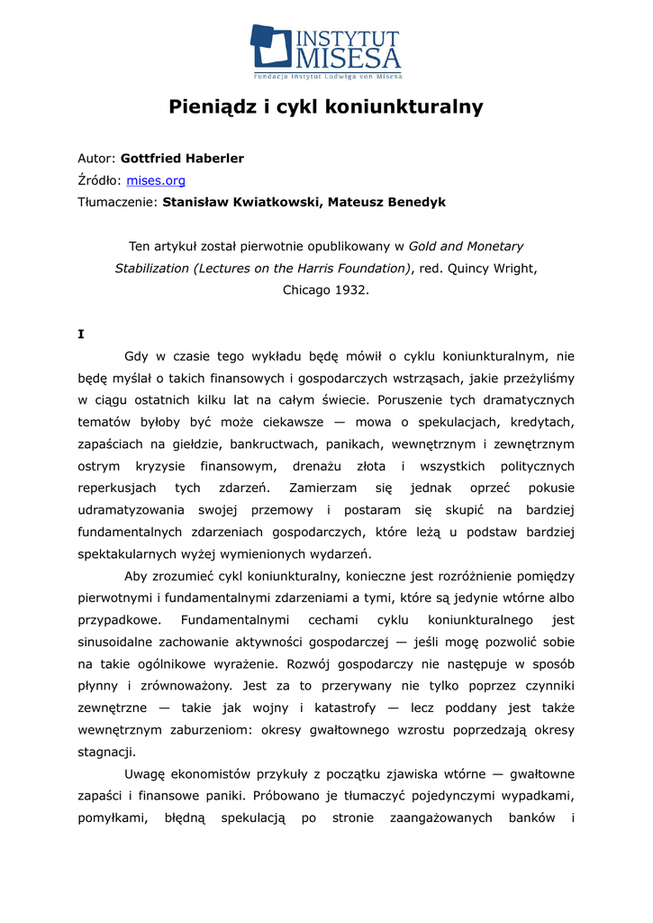 Pieniądz i cykl koniunkturalny Autor: Gottfried Haberler Źródło: mises.org Tłumaczenie: Stanisław Kwiatkowski, Mateusz Benedyk Ten artykuł został pierwotnie opublikowany w Gold and Monetary Stabilization (Lectures on the Harris Foundation), red. Quincy Wright, Chicago 1932. I Gdy w czasie tego wykładu będę mówił o cyklu koniunkturalnym, nie będę myślał o takich finansowych i gospodarczych wstrząsach, jakie przeżyliśmy w ciągu ostatnich kilku lat na całym świecie. Poruszenie tych dramatycznych tematów byłoby być może ciekawsze — mowa o spekulacjach, kredytach, zapaściach na giełdzie, bankructwach, panikach, wewnętrznym i zewnętrznym ostrym kryzysie reperkusjach finansowym, tych udramatyzowania zdarzeń. swojej drenażu złota Zamierzam przemowy i i się postaram wszystkich jednak się politycznych oprzeć skupić na pokusie bardziej fundamentalnych zdarzeniach gospodarczych, które leżą u podstaw bardziej spektakularnych wyżej wymienionych wydarzeń. Aby zrozumieć cykl koniunkturalny, konieczne jest rozróżnienie pomiędzy pierwotnymi i fundamentalnymi zdarzeniami a tymi, które są jedynie wtórne albo przypadkowe. Fundamentalnymi cechami cyklu koniunkturalnego jest sinusoidalne zachowanie aktywności gospodarczej — jeśli mogę pozwolić sobie na takie ogólnikowe wyrażenie. Rozwój gospodarczy nie następuje w sposób płynny i zrównoważony. Jest za to przerywany nie tylko poprzez czynniki zewnętrzne — takie jak wojny i katastrofy — lecz poddany jest także wewnętrznym zaburzeniom: okresy gwałtownego wzrostu poprzedzają okresy stagnacji. Uwagę ekonomistów przykuły z początku zjawiska wtórne — gwałtowne zapaści i finansowe paniki. Próbowano je tłumaczyć pojedynczymi wypadkami, pomyłkami, błędną spekulacją po stronie zaangażowanych banków i przedsiębiorców. Jednak ich regularne nawroty w XIX w. skłoniły ekonomistów do uznania, że nie mają do czynienia z odizolowanymi przypadkami, lecz z objawami choroby toczącej całą gospodarkę. W drugiej połowie XIX w. wydawało się, że problemy te ulegają złagodzeniu. Szczególnie te bardziej rzucające się w oczy zjawiska, takie jak gwałtowne zapaście, bankructwa i paniki, stały się rzadsze, a zdarzały się nawet cykle koniunkturalne całkowicie ich pozbawione. Przed wojną zapanował konsensus, że tendencja ta się utrzyma i dramatyczne wydarzenia, których świadkiem był wiek XIX, należą do przeszłości. Obecny kryzys wskazuje, że nasza radość była przedwczesna, ponieważ plagi te dalej gnębią system kapitalistyczny. Z doświadczeń przeszłości możemy się nauczyć jednej rzeczy: zrozumienie mechanizmu, który wywołuje cykle w systemie kapitalistycznym, wymaga zajęcia się zjawiskami fundamentalnymi oraz abstrahowania od czynników wtórnych, które mogą, lecz nie muszą występować. Jeżeli odsuniemy na bok zjawiska wtórne, cykl koniunkturalny przedstawia się jako okresowe fluktuacje aktywności przedsiębiorców, lub — by ująć to precyzyjniej — produkcji. Wzrost produkcji nie następuje w sposób ciągły i nieprzerwany; cechuje go oscylowanie wokół rocznej średniej. Nie ma większego znaczenia, czy oscylacje te polegają na zmniejszeniu produkcji w wymiarze absolutnym, czy tylko wpływają na spadek stopy wzrostu. W tym wykładzie nie jestem zainteresowany pomysłowymi narzędziami, które statystycy konstruują, aby odizolować cykliczne wahania koniunktury od innych okresowych i chaotycznych ruchów, na które się nakładają, lub które są nakładane na nie. Zakładam na potrzeby analizy, że istnieje coś takiego jak cykl koniunkturalny, który nie jest tożsamy z cyklem sezonowym w każdym roku ani z chaotycznymi ruchami wywołanymi przez wojny czy okresy gwałtownej, państwowej inflacji. Warto to podkreślić, ponieważ zdarzało się, że samo istnienie takiego oddzielnego typu fluktuacji było podważane. Następnie założę, że jesteśmy w stanie statystycznie wyizolować te wahania. Naszym głównym zadaniem będzie wyjaśnienie tych ruchów w kontekście roli, jaką w nich odgrywa pieniądz rozumiany w najszerszym sensie, zawierającym kredyt i pieniądz bankowy. II Nie istnieje zbyt wiele wyjaśnień cyklu koniunkturalnego — celowo nie używam terminu „teorii cyklu koniunkturalnego”, ponieważ wiele osób uprzedzonych jest do tego terminu — w których znaczącej roli nie odgrywałby pieniądz. Następujące rozważania mają na celu wyjaśnić, dlaczego każde takie wyjaśnienie powinno przypisywać centralną rolę pieniądzu. Abstrahując od wymienionych wcześniej zjawisk wtórnych, jednym z najwyraźniejszych symptomów cyklu koniunkturalnego jest wzrost cen w czasie prosperity i ich spadek w czasie depresji. Z drugiej zaś strony odnotowuje się wzrost produkcji w pierwszej fazie i jej spadek w drugiej. Jednak poza zwiększoną ilością wyprodukowanych i sprzedanych dóbr, mamy też do czynienia ze wzrostem aktywności w innych działach gospodarki, gdzie również występuje przyrost ilości transakcji — jak na przykład na giełdzie papierów wartościowych. Można więc bezpiecznie powiedzieć, że w pierwszej fazie cyklu występuje wzrost w ilości dokonywanych transakcji, podczas gdy w drugiej następuje jej spadek. Powinno być jasne, że w celu obsłużenia tej dodatkowej ilości płatności, konieczna jest zmiana w cyrkulacji środków płatniczych w najszerszym sensie. Musi nastąpić jedna z następujących rzeczy: (a) przyrost ilości złota i legalnego środka płatniczego; (b) przyrost ilości banknotów; (c) przyrost ilości depozytów bankowych i kredytu; (d) przyrost ilości czeków, weksli czy innych środków płatniczych służących częściej lub rzadziej jako substytuty pieniądza; (e) przyrost szybkości cyrkulacji w przynajmniej jednym z wymienionych środków płatności. Nie twierdzę, że lista ta jest wyczerpująca. Jest raczej wyrazem terminologicznej wygody w tym, j