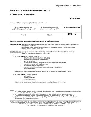 WĘDLINIARZ 751107 – CZELADNIK STANDARD WYMAGAŃ EGZAMINACYJNYCH - CZELADNIK w zawodzie: WĘDLINIARZ Na bazie podstawy programowej kształcenia w zawodzie (* Kod z klasyfikacji zawodów i specjalności dla potrzeb rynku pracy (** Kod z klasyfikacji zawodów szkolnictwa zawodowego (*** 751107 751107 NUMER STANDARDU 127/cz Egzamin CZELADNICZY przeprowadzany jest w dwóch etapach: etap praktyczny: polega na samodzielnym wykonaniu przez kandydata zadań egzaminacyjnych sprawdzających umiejętności praktyczne. Czas trwania etapu praktycznego nie może być krótszy niż 120 min i nie dłuższy niż 24 godziny, łącznie w ciągu trzech dni. etap teoretyczny: polega na udzieleniu odpowiedzi na pytania zestawione w dwóch częściach; pisemnej i ustnej, sprawdzających wiedzę teoretyczną: 1. w części pisemnej z zakresu tematów: rachunkowość zawodowa wraz z kalkulacją dokumentacja działalności gospodarczej rysunek zawodowy zasady bezpieczeństwa i higieny pracy oraz ochrony przeciwpożarowej podstawowe zasady ochrony środowiska podstawowe przepisy prawa pracy podstawowa problematyka prawa gospodarczego i zarządzania przedsiębiorstwem Czas trwania części pisemnej nie może być krótszy niż 45 minut i nie dłuższy niż 210 minut. 2. w części ustnej z zakresu tematów: technologia maszynoznawstwo materiałoznawstwo Czas trwania części ustnej etapu teoretycznego nie może być dłuższy niż 30 minut. UWAGI 1. 2. 3. (* - Rozporządzenie Ministra Edukacji Narodowej z dnia 7 lutego 2012 r. w sprawie podstawy programowej kształcenia w zawodach (Dz. U. Nr 62, poz. 439) (** - Rozporządzenie Ministra Pracy i Polityki Społecznej z dnia 27 kwietnia 2010r. w sprawie klasyfikacji zawodów i specjalności na potrzeby rynku pracy oraz zakresu jej stosowania (Dz. U. Nr 82, poz. 537 ze zm.) (***- Rozporządzenie Ministra Edukacji Narodowej z 23 grudnia 2011 r. w sprawie klasyfikacji zawodów szkolnictwa zawodowego (Dz. U. z 2012 r. Nr 2, poz. 7) Zadania do etapu praktycznego i pytania do etapu teoretycznego przygotowywane są na bazie podstawy programowej kształcenia w zawodzie ustalonej przez ministra właściwego ds. edukacji(Ustawa o rzemiośle z dnia 22 marca 1989, tekst jednolity: Dz. U. Z 2002r Nr 112, poz. 979, z późn. zm. Dz. U. z 2003 Nr 137, poz. 1304, Dz. U. z 2009 Nr 6, poz.33, Dz. U. z 2011 Nr 207, poz. 1230, Dz. U. z 2011 Nr 205, poz. 1206) 1 WĘDLINIARZ 751107 – CZELADNIK W efekcie pozytywnie zdanego egzaminu CZELADNICZEGO izba rzemieślnicza wystawia ŚWIADECTWO CZELADNICZE, które jest formalnym potwierdzeniem kwalifikacji zawodowych, uzyskanych w różnych ścieżkach edukacji oraz w procesie pracy. 1. PROFIL UMIEJĘTNOŚCI CZELADNIKA ZWIĄZANY Z ZAWODEM Czeladnik (posiadacz świadectwa czeladniczego) w zawodzie wędliniarz potrafi: − posługiwać się normami technologicznymi, instrukcjami i recepturami stosowanymi w przetwórstwie mięsa, − użytkować podstawowe maszyny, posługiwać się sprzętem i aparaturą kontrolno-pomiarową stosowaną w przetwórstwie mięsa, − wykrawać i klasyfikować mięso, − dobierać surowce do przerobu, substancje pomagające w przetwarzaniu oraz dozwolone substancje dodatkowe, − produkować wędzonki, kiełbasy, konserwy, wędliny i wyroby podrobowe, tłuszcze topione, wyroby uszlachetnione zgodnie z normami i systemami zapewnienia jakości, − stosować metody utrwalania i przechowywania mięsa i przetworów mięsnych, − nadzorować transport mięsa i przetworów mięsnych, − przestrzegać przepisów bezpieczeństwa i higieny pracy, ochrony przeciwpożarowej, ochrony środowiska oraz bezpieczeństwa zdrowotnego żywności podczas wykonywania zadań zawodowych, - udzielać pierwszej pomocy poszkodowanym w wypadkach przy pracy Czeladnik w zawodzie wędliniarz jest przygotowany do wykonywania następujących zadań zawodowych: 1) magazynowania i przygotowywania mięsa do dystrybucji; 2) obsługiwania maszyn i urządzeń stosowanych w przetwórstwie mięsa; 3) wykonywania prac związanych z produkcją przetworów mięsnych i tłuszczowych; 4) magazynowania i przygotowywania przetworów mięsnych i tłuszczowych do dystrybucji. 2.WIEDZA I UMIEJĘTNOŚCI ZWIĄZANE Z WYKONYWANIEM WYŻEJ WYMIENIONYCH ZADAŃ ZAWODOWYCH Z ZAKRESU: 2.1. Bezpieczeństwo i higiena pracy Czeladnik: 1) rozróżnia pojęcia związane z bezpieczeństwem i higieną pracy, ochroną przeciwpożarową, ochroną środowiska i ergonomią; 2) rozróżnia zadania i uprawnienia instytucji oraz służb działających w zakresie ochrony pracy i ochrony środowiska w Polsce; 3) określa prawa i obowiązki pracownika oraz pracodawcy w zakresie bezpieczeństwa i higieny pracy; 4) przewiduje zagrożenia dla zdrowia i życia człowieka oraz mienia i środowiska związane z wykonywaniem zadań zawodowych; 5) określa zagrożenia związane z występowaniem szkodliwych czynników w środowisku pracy; 6) określa skutki oddziaływania czynników szkodliwych na organizm człowieka; 7) organizuje stanowisko pracy zgodnie z obowiązującymi wymaganiami ergonomii, przepisami bezpieczeństwa i higieny pracy, ochrony przeciwpożarowej i ochrony środowiska; 8) stosuje środki ochrony indywidualnej i zbiorowej podczas wykonywania zadań zawodowych; 9) przestrzega zasad bezpieczeństwa i higieny pracy oraz stosuje przepisy prawa dotyczące ochrony przeciwpożarowej i ochrony środowiska; 10) udziela pierwszej pomocy poszkodowanym w wypadkach przy pracy oraz w stanach zagrożenia zdrowia i życia. 2.2.Podejmowanie i prowadzenie działalności gospodarczej Czeladnik: 1) stosuje pojęcia z obszaru funkcjonowania gospodarki rynkowej; 2) stosuje przepisy prawa pracy, przepisy prawa dotyczące ochrony danych osobowych oraz przepisy prawa podatkowego i prawa autorskiego; 3) stosuje przepisy prawa dotyczące prowadzenia działalności gospodarczej; 4) rozróżnia przedsiębiorstwa i instytucje występujące w branży i powiązania między nimi; 5) analizuje działania prowadzone 
