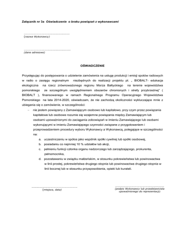 Załącznik nr 3a Oświadczenie o braku powiązań z wykonawcami …………………………………………………… (nazwa Wykonawcy) ……………………………………………………. (dane adresowe) OŚWIADCZENIE Przystępując do postępowania o udzielenie zamówienia na usługę produkcji i emisji spotów radiowych w radio o zasięgu regionalnym ekologiczna niezbędnych do realizacji projektu pt. „ BIOBALT- edukacja na rzecz zrównoważonego regionu Morza Bałtyckiego pomorskiego na terenie województwa ze szczególnym uwzględnieniem obszarów chronionych i strefy przybrzeżnej” ( BIOBALT ), finansowanego w ramach Regionalnego Programu Operacyjnego Województwa Pomorskiego na lata 2014-2020, oświadczam, że nie zachodzą okoliczności wykluczające mnie z ubiegania się o zamówienie, w szczególności: − nie jestem powiązany z Zamawiającym osobowo lub kapitałowo, przy czym przez powiązania kapitałowe lub osobowe rozumie się wzajemne powiązania między Zamawiającym lub osobami upoważnionymi do zaciągania zobowiązań w imieniu Zamawiającego lub osobami wykonującymi w imieniu Zamawiającego czynności związane z przygotowaniem i przeprowadzeniem procedury wyboru Wykonawcy a Wykonawcą, polegające w szczególności na: a. uczestniczeniu w spółce jako wspólnik spółki cywilnej lub spółki osobowej, b. posiadaniu co najmniej 10 % udziałów lub akcji, c. pełnieniu funkcji członka organu nadzorczego lub zarządzającego, prokurenta, pełnomocnika, d. pozostawaniu w związku małżeńskim, w stosunku pokrewieństwa lub powinowactwa w linii prostej, pokrewieństwa drugiego stopnia lub powinowactwa drugiego stopnia w linii bocznej lub w stosunku przysposobienia, opieki lub kurateli. …………………………………………………… (miejsce, data) ………………………………………………………. (podpis Wykonawcy lub przedstawiciela upoważnionego do reprezentacji)