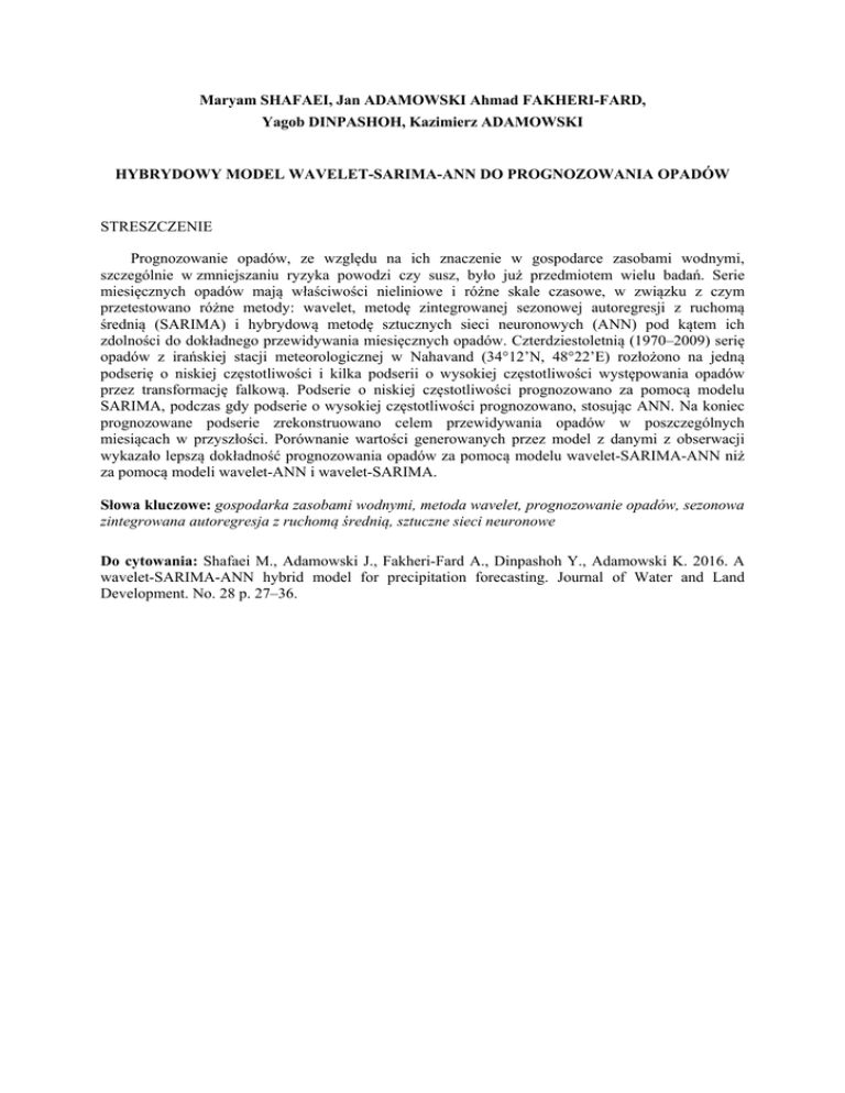 Maryam SHAFAEI, Jan ADAMOWSKI Ahmad FAKHERI-FARD, Yagob DINPASHOH, Kazimierz ADAMOWSKI HYBRYDOWY MODEL WAVELET-SARIMA-ANN DO PROGNOZOWANIA OPADÓW STRESZCZENIE Prognozowanie opadów, ze względu na ich znaczenie w gospodarce zasobami wodnymi, szczególnie w zmniejszaniu ryzyka powodzi czy susz, było już przedmiotem wielu badań. Serie miesięcznych opadów mają właściwości nieliniowe i różne skale czasowe, w związku z czym przetestowano różne metody: wavelet, metodę zintegrowanej sezonowej autoregresji z ruchomą średnią (SARIMA) i hybrydową metodę sztucznych sieci neuronowych (ANN) pod kątem ich zdolności do dokładnego przewidywania miesięcznych opadów. Czterdziestoletnią (1970–2009) serię opadów z irańskiej stacji meteorologicznej w Nahavand (34°12’N, 48°22’E) rozłożono na jedną podserię o niskiej częstotliwości i kilka podserii o wysokiej częstotliwości występowania opadów przez transformację falkową. Podserie o niskiej częstotliwości prognozowano za pomocą modelu SARIMA, podczas gdy podserie o wysokiej częstotliwości prognozowano, stosując ANN. Na koniec prognozowane podserie zrekonstruowano celem przewidywania opadów w poszczególnych miesiącach w przyszłości. Porównanie wartości generowanych przez model z danymi z obserwacji wykazało lepszą dokładność prognozowania opadów za pomocą modelu wavelet-SARIMA-ANN niż za pomocą modeli wavelet-ANN i wavelet-SARIMA. Słowa kluczowe: gospodarka zasobami wodnymi, metoda wavelet, prognozowanie opadów, sezonowa zintegrowana autoregresja z ruchomą średnią, sztuczne sieci neuronowe Do cytowania: Shafaei M., Adamowski J., Fakheri-Fard A., Dinpashoh Y., Adamowski K. 2016. A wavelet-SARIMA-ANN hybrid model for precipitation forecasting. Journal of Water and Land Development. No. 28 p. 27–36.