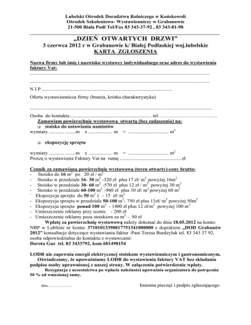 Lubelski Ośrodek Doradztwa Rolniczego w Końskowoli Ośrodek Szkoleniowo- Wystawienniczy w Grabanowie 21-500 Biała Podl Tel/Fax 83 343-37-92 , 83 343-81-98 ___________________________________________________________________________ „DZIEŃ OTWARTYCH DRZWI” 3 czerwca 2012 r w Grabanowie k/ Białej Podlaskiej woj.lubelskie KARTA ZGŁOSZENIA Nazwa firmy lub imię i nazwisko wystawcy indywidualnego oraz adres do wystawienia faktury Vat: .............................................................................................................................................. .............................................................................................................................................. N I P ....................................................................................................... Oferta wystawiennicza firmy (branża, krótka charakterystyka) ................................................................................................................................................ Osoba do kontaktu................................................................. tel. ……………………………. Zamawiam powierzchnię wystawową otwartą (bez zadaszenia) na: stoisko do ustawiania namiotów wymiary ............ ........m x ................... m = ................................ m2 ekspozycję sprzętu wymiary ............ ........m x ................... m = ................................ m2 Proszę o wystawienie Faktury Vat na sumę .................................................zł Cennik za zamawianą powierzchnię wystawową (teren otwarty)-ceny brutto: - Stoisko do 16 m2 po 20 zł / m2 - Stoisko w przedziale 16- 30 m2 -320 zł plus 17 zł/ m2 powyżej 16m2 - Stoisko w przedziale 30- 60 m2 -570 zł plus 12 zł / m2 powyżej 30 m2 - Stoisko w przedziale 60-100 m2 -960 zł plus 10 zł/ m2 powyżej 60 m2 Ekspozycja sprzętu do 50 m2 ) - 15 zł/ m2 - Ekspozycja sprzętu w przedziale 50-100 m2- 750 zł plus 13zł/ m2 powyżej 50m2 - Ekspozycja sprzętu ponad 100 m2 - 1400 zł plus 12 zł/m2 powyżej 100 m2 - Umieszczenie reklamy przy scenie - 200 zł - Umieszczenie reklamy poza stoiskiem za m2 - 50 zł Wpłatę za powierzchnię wystawową należy dokonać do dnia 18.05.2012 na konto: NBP w Lublinie nr konta: 37101013390017751341000000 z dopiskiem „DOD Grabanów 2012” konsultacje dotyczące wystawiania faktur -Pani Teresa Burdzyluk tel. 83 343 37 92, osoba odpowiedzialna do kontaktu z wystawcami: Dorota Guz tel. 83 3433792, kom 601498154 LODR nie zapewnia energii elektrycznej stoiskom wystawienniczym i gastronomicznym. Oświadczamy, że upoważniamy LODR do wystawienia faktury VAT bez składania podpisu osoby uprawnionej z naszej strony. W załączeniu potwierdzenie wpłaty. Rezygnacja z uczestnictwa po wpłacie należności upoważnia organizatora do potrącenia 50 % od wniesionej sumy. data.......................... Imienna pieczęć i podpis zgłaszającego