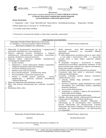 KONTRAKT DOTYCZĄCY ZASAD UCZESTNICTWA W CYKLU EDUKACYJNYM: „Centrum Aktywności Lokalnej jako metoda integracji i przeciwdziałania wykluczeniu społecznemu” Strony Kontraktu: 1. Organizator cyklu: Urząd Marszałkowski Województwa Zachodniopomorskiego – Regionalny Ośrodek Polityki Społecznej, ul. Korsarzy 34, 70-540 Szczecin 2. Uczestnik cyklu (dane ośrodka): …………..………………………………………………………………………………........................................... 3. Pracownicy wyznaczeni do udziału w cyklu (imię i nazwisko, stanowisko): ……………………………………………………………………………………………………………………… Zobowiązania stron kontraktu: Regionalny Ośrodek Polityki Społecznej w Szczecinie we współpracy z Stowarzyszeniem Centrum Wspierania Ośrodek Pomocy Społecznej Aktywności Lokalnej CAL z Warszawy 1. Odpowiada za przygotowanie merytoryczne i organizacyjne warsztatów szkoleniowych i wizyt studyjnych. 2. Pokrywa większość kosztów uczestnictwa w blokach szkoleniowych (zakwaterowanie uczestników, wyŜywienie, materiały szkoleniowe, honoraria trenerów) 3. Zapewnia siedem 3-dniowych modułów szkoleniowych o następujących zagadnieniach: • Ja jako animator; • Organizacja i rozwój społeczności lokalnej; rozpoznanie i diagnoza potencjału środowiska lokalnego; • Tworzenie lokalnego partnerstwa; • Mobilizowanie ludzi do działania; • Praca metodą projektów – projektowanie zmian; • Przeciwdziałanie wykluczeniu społecznemu; • Zmiana w ośrodku pomocy społecznej – rozwój organizacyjny i społeczny instytucji, komunikacja i edukacja społeczna. 4. Zapewnia organizację indywidualnego wsparcia. 5. SłuŜy stałą pomocą konsultacyjną przy realizacji wszystkich zadań. 6. Monitoruje efekty cyklu. 1. 2. 3. 4. 5. 6. 7. 8. Osoby zgłoszone przez OPS zobowiązują się do aktywnego uczestnictwa we wszystkich blokach szkoleniowych. W cyklu edukacyjnym uczestniczą zawsze te same osoby – w tym jedna z kierownictwa OPS - u i pracownik socjalny, który w pracy będzie realizował zadania animatora. W przypadku rezygnacji z uczestnictwa w module szkoleniowym powiadomi organizatora minimum 10 dni przed terminem jego realizacji oraz zapewni uczestnictwo innego pracownika w zastępstwie. Uczestnicy pokrywają koszty przejazdu na szkolenia. Uczestniczy będą brali udział w szkoleniach według ustalonego harmonogramu. Uczestnicy wykonują ustalone podczas warsztatów zadania domowe, m.in.: • opracują lokalną mapę problemów i zasobów społecznych, • utworzą co najmniej 1 grupę samopomocową, grupę obywatelską oraz nieformalną koalicję angaŜującą partnerów lokalnych, • utworzą Klub Wolontariusza, • zorganizują co najmniej 1 imprezę dla mieszkańców danej społeczności lokalnej, • opracują koncepcję projektu społecznego. Ośrodek utrzymuje kontakt informacyjno-konsultacyjny z Regionalnym Ośrodkiem Polityki Społecznej. Uczestnicy otrzymują materiały edukacyjne i zobowiązują się do przestrzegania praw autorskich, których właścicielem jest Stowarzyszenie Centrum Wspierania Aktywności Lokalnej. Zobowiązują się do nie powielania, nie rozpowszechniania i nie przetwarzania w/w materiałów. Regionalny Ośrodek Polityki Społecznej Ośrodek Pomocy Społecznej Dyrektor Dyrektor/Kierownik Stowarzyszenie Centrum Wspierania Aktywności Lokalnej CAL Prezes Projekt Profesjonalne kadry – lepsze jutro jest współfinansowany ze środków Unii Europejskiej w ramach Europejskiego Funduszu Społecznego