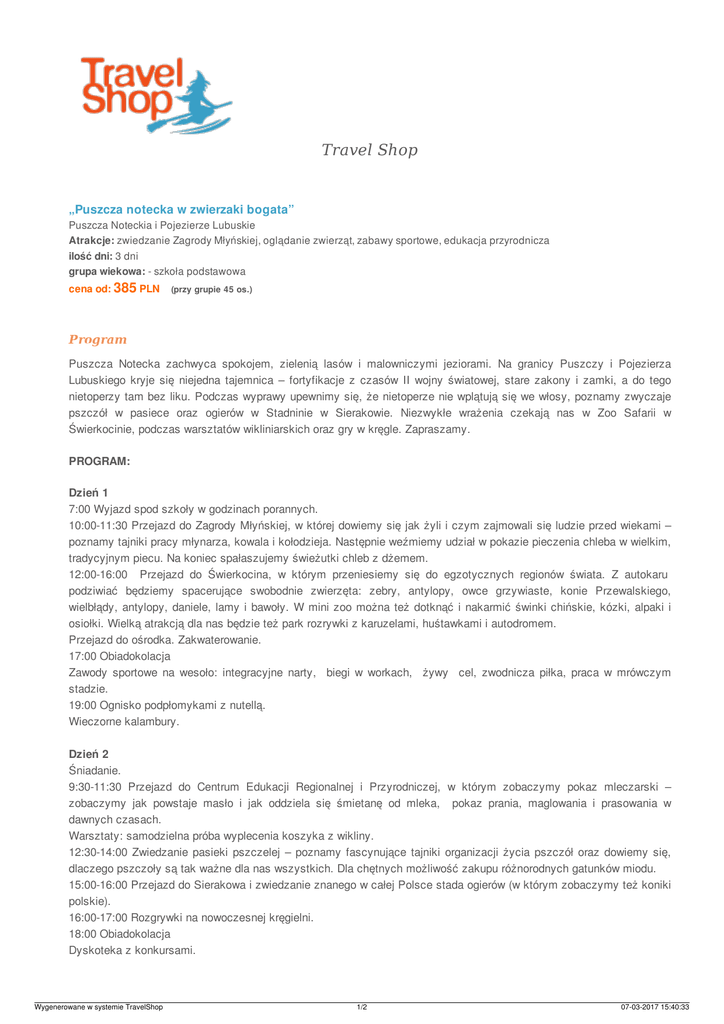 Travel Shop „Puszcza notecka w zwierzaki bogata” Puszcza Noteckia i Pojezierze Lubuskie Atrakcje: zwiedzanie Zagrody Młyńskiej, oglądanie zwierząt, zabawy sportowe, edukacja przyrodnicza ilość dni: 3 dni grupa wiekowa: - szkoła podstawowa cena od: 385 PLN (przy grupie 45 os.) Program Puszcza Notecka zachwyca spokojem, zielenią lasów i malowniczymi jeziorami. Na granicy Puszczy i Pojezierza Lubuskiego kryje się niejedna tajemnica – fortyfikacje z czasów II wojny światowej, stare zakony i zamki, a do tego nietoperzy tam bez liku. Podczas wyprawy upewnimy się, że nietoperze nie wplątują się we włosy, poznamy zwyczaje pszczół w pasiece oraz ogierów w Stadninie w Sierakowie. Niezwykłe wrażenia czekają nas w Zoo Safarii w Świerkocinie, podczas warsztatów wikliniarskich oraz gry w kręgle. Zapraszamy. PROGRAM: Dzień 1 7:00 Wyjazd spod szkoły w godzinach porannych. 10:00-11:30 Przejazd do Zagrody Młyńskiej, w której dowiemy się jak żyli i czym zajmowali się ludzie przed wiekami – poznamy tajniki pracy młynarza, kowala i kołodzieja. Następnie weźmiemy udział w pokazie pieczenia chleba w wielkim, tradycyjnym piecu. Na koniec spałaszujemy świeżutki chleb z dżemem. 12:00-16:00 Przejazd do Świerkocina, w którym przeniesiemy się do egzotycznych regionów świata. Z autokaru podziwiać będziemy spacerujące swobodnie zwierzęta: zebry, antylopy, owce grzywiaste, konie Przewalskiego, wielbłądy, antylopy, daniele, lamy i bawoły. W mini zoo można też dotknąć i nakarmić świnki chińskie, kózki, alpaki i osiołki. Wielką atrakcją dla nas będzie też park rozrywki z karuzelami, huśtawkami i autodromem. Przejazd do ośrodka. Zakwaterowanie. 17:00 Obiadokolacja Zawody sportowe na wesoło: integracyjne narty, biegi w workach, żywy cel, zwodnicza piłka, praca w mrówczym stadzie. 19:00 Ognisko podpłomykami z nutellą. Wieczorne kalambury. Dzień 2 Śniadanie. 9:30-11:30 Przejazd do Centrum Edukacji Regionalnej i Przyrodniczej, w którym zobaczymy pokaz mleczarski – zobaczymy jak powstaje masło i jak oddziela się śmietanę od mleka, pokaz prania, maglowania i prasowania w dawnych czasach. Warsztaty: samodzielna próba wyplecenia koszyka z wikliny. 12:30-14:00 Zwiedzanie pasieki pszczelej – poznamy fascynujące tajniki organizacji życia pszczół oraz dowiemy się, dlaczego pszczoły są tak ważne dla nas wszystkich. Dla chętnych możliwość zakupu różnorodnych gatunków miodu. 15:00-16:00 Przejazd do Sierakowa i zwiedzanie znanego w całej Polsce stada ogierów (w którym zobaczymy też koniki polskie). 16:00-17:00 Rozgrywki na nowoczesnej kręgielni. 18:00 Obiadokolacja Dyskoteka z konkursami. Wygenerowane w systemie TravelShop 1/2 07-03-2017 15:40:33 Dzień 3 Śniadanie. Wykwaterowanie. Eko-zabawy na świeżym powietrzu. 10:00 Przyjazd do Międzyrzecza, zwiedzanie ruin Zamku w Międzyrzeczu. 11:00 -13:30 Przejazd do Pniewa – zejście z przewodnikiem do podziemnych korytarzy MRU – odkrywanie mrocznych tajemnic oraz rozszyfrowanie zagadek rejonu umocnionego. Przejazd podziemną drezyną, a już na powierzchni ognisko z kiełbaskami. 14:00-15:00 Odwiedziny u Cystersów w Gościkowie. Istnieje możliwość zamówienia 2-daniowego obiadu (+20 PLN/os.) Wyjazd do Szczecina. Planowany powrót około godziny 18:00/19:00 Cena zawiera Transport, 2 noclegi, 2 śniadania, 2 obiadokolacje, realizację programu , bilety wstępu do atrakcji wymienionych w programie, realizację zajęć edukacyjnych, wikt na ognisko, niezbędne materiały opiekę i komentarz pilota Travel Shop, miejsca gratis dla 4 Opiekunów (przy 45 uczestnikach), ubezpieczenie NNW, podatek VAT. CENA NIE ZAWIERA: Ewentualnego obiadu w drodze powrotnej +20 PLN/os. Dodatkowe informacje UWAGI: *Cena zostały ustalona dla grup liczących co najmniej 45 pełnopłatnych uczestników, **Cena dla grupy wyjeżdżającej ze Szczecina, ***Kolejność zwiedzania może ulec zmianie – wszelkie potencjalne zmiany wprowadzone będą po konsultacji z grupą; Treść oferty nie stanowi oferty handlowej w rozumieniu art 66 § 1 kodeksu cywilnego oraz innych właściwych przepisów prawnych. Wygenerowane w systemie TravelShop 2/2 07-03-2017 15:40:33