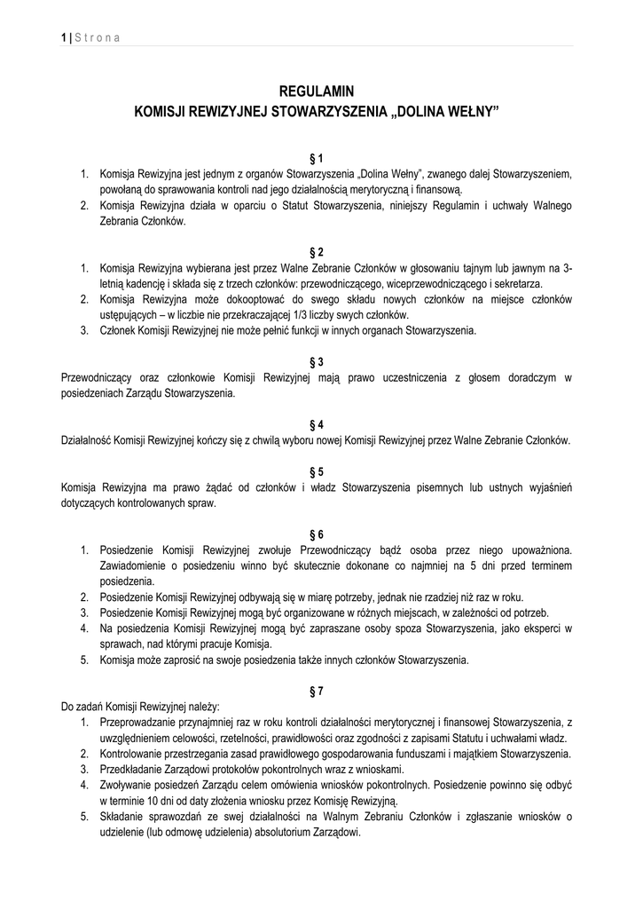 1|Strona REGULAMIN KOMISJI REWIZYJNEJ STOWARZYSZENIA „DOLINA WEŁNY” §1 1. Komisja Rewizyjna jest jednym z organów Stowarzyszenia „Dolina Wełny”, zwanego dalej Stowarzyszeniem, powołaną do sprawowania kontroli nad jego działalnością merytoryczną i finansową. 2. Komisja Rewizyjna działa w oparciu o Statut Stowarzyszenia, niniejszy Regulamin i uchwały Walnego Zebrania Członków. §2 1. Komisja Rewizyjna wybierana jest przez Walne Zebranie Członków w głosowaniu tajnym lub jawnym na 3letnią kadencję i składa się z trzech członków: przewodniczącego, wiceprzewodniczącego i sekretarza. 2. Komisja Rewizyjna może dokooptować do swego składu nowych członków na miejsce członków ustępujących – w liczbie nie przekraczającej 1/3 liczby swych członków. 3. Członek Komisji Rewizyjnej nie może pełnić funkcji w innych organach Stowarzyszenia. §3 Przewodniczący oraz członkowie Komisji Rewizyjnej mają prawo uczestniczenia z głosem doradczym w posiedzeniach Zarządu Stowarzyszenia. §4 Działalność Komisji Rewizyjnej kończy się z chwilą wyboru nowej Komisji Rewizyjnej przez Walne Zebranie Członków. §5 Komisja Rewizyjna ma prawo żądać od członków i władz Stowarzyszenia pisemnych lub ustnych wyjaśnień dotyczących kontrolowanych spraw. 1. 2. 3. 4. 5. §6 Posiedzenie Komisji Rewizyjnej zwołuje Przewodniczący bądź osoba przez niego upoważniona. Zawiadomienie o posiedzeniu winno być skutecznie dokonane co najmniej na 5 dni przed terminem posiedzenia. Posiedzenie Komisji Rewizyjnej odbywają się w miarę potrzeby, jednak nie rzadziej niż raz w roku. Posiedzenie Komisji Rewizyjnej mogą być organizowane w różnych miejscach, w zależności od potrzeb. Na posiedzenia Komisji Rewizyjnej mogą być zapraszane osoby spoza Stowarzyszenia, jako eksperci w sprawach, nad którymi pracuje Komisja. Komisja może zaprosić na swoje posiedzenia także innych członków Stowarzyszenia. §7 Do zadań Komisji Rewizyjnej należy: 1. Przeprowadzanie przynajmniej raz w roku kontroli działalności merytorycznej i finansowej Stowarzyszenia, z uwzględnieniem celowości, rzetelności, prawidłowości oraz zgodności z zapisami Statutu i uchwałami władz. 2. Kontrolowanie przestrzegania zasad prawidłowego gospodarowania funduszami i majątkiem Stowarzyszenia. 3. Przedkładanie Zarządowi protokołów pokontrolnych wraz z wnioskami. 4. Zwoływanie posiedzeń Zarządu celem omówienia wniosków pokontrolnych. Posiedzenie powinno się odbyć w terminie 10 dni od daty złożenia wniosku przez Komisję Rewizyjną. 5. Składanie sprawozdań ze swej działalności na Walnym Zebraniu Członków i zgłaszanie wniosków o udzielenie (lub odmowę udzielenia) absolutorium Zarządowi. 2|Strona 6. Występowanie z żądaniem zwołania Nadzwyczajnego Walnego Zebrania Członków w razie stwierdzenia nie wywiązywania się przez Zarząd z jego statutowych obowiązków, a także prawo zwołania posiedzenia Zarządu w sprawach nie cierpiących zwłoki. §8 1. Uchwały Komisji Rewizyjnej zapadają większością 2/3 głosów jej składu, w głosowaniu jawnym. 2. Sprawy personalne oraz wnioski o absolutorium dla Zarządu wymagają głosowania tajnego. 3. W uzasadnionych, nie cierpiących zwłoki przypadkach, głosowanie może odbyć się w drodze ustalenia telefonicznego bądź korespondencyjnego za pomocą poczty elektronicznej, z wyłączeniem głosowania o udzielenie absolutorium. 1. 2. 3. 4. 5. §9 Z posiedzeń Komisji Rewizyjnej sporządzany jest protokół. Komisja Rewizyjna prowadzi rejestr swoich uchwał i wniosków. Za prawidłowość dokumentacji odpowiada Sekretarz Komisji Rewizyjnej. Materiały niezbędne do pracy Komisji Rewizyjnej zapewnia Biuro Stowarzyszenia. Dokumentacja Komisji Rewizyjnej przechowywana jest w Biurze Stowarzyszenia. § 10 Członkowie Komisji Rewizyjnej mogą wnioskować o zwrot kosztów podróży służbowych, noclegów, a także wydatków poniesionych w związku z realizacją wyznaczonych zadań. § 11 Regulamin wchodzi z życie z dniem uchwalenia przez Walne Zebranie Członków.