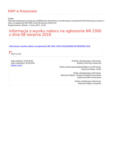 KWP w Rzeszowie Źródło: http://bip.podkarpacka.policja.gov.pl/KPR/wolne-stanowiska-w-sc/informacja-o-wynikach/23754,Informacja-o-wyniku-n aboru-na-ogloszenie-NR-2300-z-dnia-08-sierpnia-2016.html Wygenerowano: Wtorek, 7 marca 2017, 15:40 Informacja o wyniku naboru na ogłoszenie NR 2300 z dnia 08 sierpnia 2016 Informacja o wyniku naboru na ogłoszenie NR 2300 DATA OGŁOSZENIA 08 SIERPNIA 2016 Metryczka Data publikacji 19.09.2016 Data modyfikacji 19.09.2016 Rejestr zmian Podmiot udostępniający informację: Biuletyn Informacji Publicznej Osoba wytwarzająca/odpowiadająca za informację: Katarzyna Walas- Pondo Osoba udostępniająca informację: Katarzyna Etgens- Stryjecka Wydział Komunikacji Społecznej KWP w Rzeszowie Osoba modyfikująca informację: Katarzyna Etgens- Stryjecka