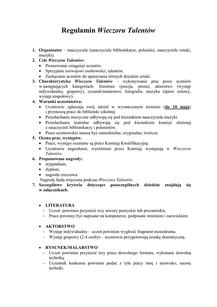 Regulamin Wieczoru Talentów 1. Organizator – nauczyciele (nauczyciele bibliotekarze, poloniści, nauczyciele sztuki, muzyki). 2. Cele Wieczoru Talentów: Promowanie osiągnięć uczniów. Sprzyjanie rozwojowi osobowości, talentów. Zachęcanie uczniów do uprawiania różnych dziedzin sztuki. 3. Charakterystyka Wieczoru Talentów – wykonywanie prac przez uczniów w następujących kategoriach: literatura (poezja, proza), aktorstwo (występ indywidualny, grupowy), rysunek/malarstwo, fotografia, muzyka (śpiew solowy, występ zespołowy). 4. Warunki uczestnictwa: Uczniowie zgłaszają swój udział w wyznaczonym terminie (do 10 maja) i przynoszą prace do biblioteki szkolnej Przesłuchania muzyczne odbywają się pod kierunkiem nauczyciela muzyki. Przesłuchania teatralne odbywają się pod kierunkiem komisji złożonej z nauczycieli bibliotekarzy i polonistów. Prace uczniowskie muszą być samodzielne, oryginalne, twórcze. 5. Ocena prac, występów. Prace, występy oceniane są przez Komisję Kwalifikacyjną. Uczniowie nagrodzeni, wyróżnieni przez Komisję występują w Wieczorze Talentów. 6. Proponowane nagrody: stypendium, dyplom, nagroda rzeczowa. Nagrody będą wręczone podczas Wieczoru Talentów. 7. Szczegółowe kryteria dotyczące poszczególnych dziedzin znajdują się w załącznikach. LITERATURA Uczeń powinien przynieść trzy utwory poetyckie lub prozatorskie. Prace powinny być napisane na komputerze, podpisane imieniem i nazwiskiem. AKTORSTWO Występ indywidualny – uczeń powinien wygłosić fragment monodramu. Występ grupowy (2-4 osoby) – uczniowie przygotowują scenkę dramatyczną. RYSUNEK/MALARSTWO Uczeń powinien przynieść trzy prace dowolnego formatu, wykonane dowolną techniką. Uczestnik konkursu powinien podać z tyłu pracy imię i nazwisko, nazwę techniki. FOTOGRAFIA Uczeń powinien przynieść 7 fotografii formatu 13/18 lub 20/30 oraz w formie elektronicznej. Tematyka zdjęć powinna się mieścić w następujących kategoriach: człowiek, krajobraz, zwierzęta, architektura. Uczestnik konkursu powinien podpisać zdjęcia imieniem i nazwiskiem. MUZYKA Występ wokalny lub instrumentalny – uczeń powinien przygotować podkład muzyczny. Występ zespołu – zespół powinien składać się z 2 - 4 osób.