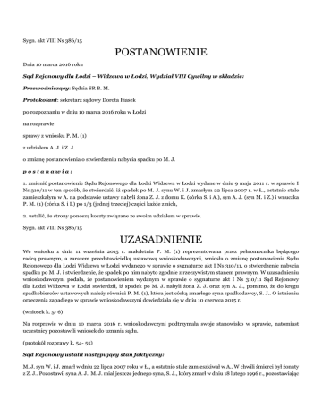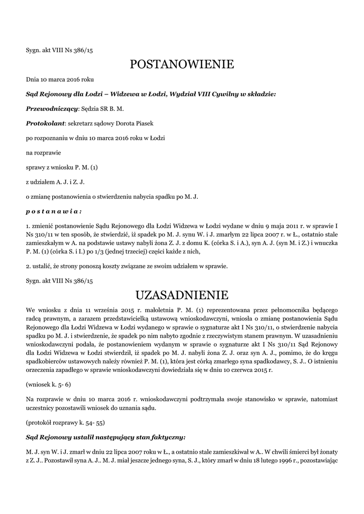 Sygn. akt VIII Ns 386/15 POSTANOWIENIE Dnia 10 marca 2016 roku Sąd Rejonowy dla Łodzi – Widzewa w Łodzi, Wydział VIII Cywilny w składzie: Przewodniczący: Sędzia SR B. M. Protokolant: sekretarz sądowy Dorota Piasek po rozpoznaniu w dniu 10 marca 2016 roku w Łodzi na rozprawie sprawy z wniosku P. M. (1) z udziałem A. J. i Z. J. o zmianę postanowienia o stwierdzeniu nabycia spadku po M. J. postanawia: 1. zmienić postanowienie Sądu Rejonowego dla Łodzi Widzewa w Łodzi wydane w dniu 9 maja 2011 r. w sprawie I Ns 310/11 w ten sposób, że stwierdzić, iż spadek po M. J. synu W. i J. zmarłym 22 lipca 2007 r. w Ł., ostatnio stale zamieszkałym w A. na podstawie ustawy nabyli żona Z. J. z domu K. (córka S. i A.), syn A. J. (syn M. i Z.) i wnuczka P. M. (1) (córka S. i I.) po 1/3 (jednej trzeciej) części każde z nich, 2. ustalić, że strony ponoszą koszty związane ze swoim udziałem w sprawie. Sygn. akt VIII Ns 386/15 UZASADNIENIE We wniosku z dnia 11 września 2015 r. małoletnia P. M. (1) reprezentowana przez pełnomocnika będącego radcą prawnym, a zarazem przedstawicielką ustawową wnioskodawczyni, wniosła o zmianę postanowienia Sądu Rejonowego dla Łodzi Widzewa w Łodzi wydanego w sprawie o sygnaturze akt I Ns 310/11, o stwierdzenie nabycia spadku po M. J. i stwierdzenie, że spadek po nim nabyto zgodnie z rzeczywistym stanem prawnym. W uzasadnieniu wnioskodawczyni podała, że postanowieniem wydanym w sprawie o sygnaturze akt I Ns 310/11 Sąd Rejonowy dla Łodzi Widzewa w Łodzi stwierdził, iż spadek po M. J. nabyli żona Z. J. oraz syn A. J., pomimo, że do kręgu spadkobierców ustawowych należy również P. M. (1), która jest córką zmarłego syna spadkodawcy, S. J.. O istnieniu orzeczenia zapadłego w sprawie wnioskodawczyni dowiedziała się w dniu 10 czerwca 2015 r. (wniosek k. 5- 6) Na rozprawie w dniu 10 marca 2016 r. wnioskodawczyni podtrzymała swoje stanowisko w sprawie, natomiast uczestnicy pozostawili wniosek do uznania sądu. (protokół rozprawy k. 54- 55) Sąd Rejonowy ustalił następujący stan faktyczny: M. J. syn W. i J. zmarł w dniu 22 lipca 2007 roku w Ł., a ostatnio stale zamieszkiwał w A.. W chwili śmierci był żonaty z Z. J.. Pozostawił syna A. J.. M. J. miał jeszcze jednego syna, S. J., który zmarł w dniu 18 lutego 1996 r., pozostawiając jedno dziecko, córkę P. M. (1). Spadkodawca innych dzieci nie posiadał, w tym przysposobionych ani pozamałżeńskich. M. J. nie sporządził też testamentu. (dowód: zapewnienie spadkowe k. 54, odpis skrócony aktu zgonu spadkodawcy k. 8, odpis skrócony aktu urodzenia P. M. (1) k. 7, odpis skrócony aktu zgonu S. J. k. 9, odpis skrócony aktu urodzenia A. J. k. 4 akt sprawy I Ns 310/11, odpis skrócony aktu małżeństwa k. 4 akt sprawy I Ns 310/11) Prawomocnym postanowieniem z dnia 9 maja 2011 roku wydanym w sprawie o sygnaturze akt I Ns 310/11 Sąd Rejonowy dla Łodzi Widzewa w Łodzi I Wydział Cywilny stwierdził, że spadek po M. J. synu W. i J. zmarłym w dniu 22 lipca 2007 roku w Ł., a ostatnio stale zamieszkałym w A. nabyli na podstawie ustawy żona Z. J. oraz syn A. J. po 1/2 części każde z nich. (postanowienie k. 11 akt sprawy I Ns 310/11) Powyższy stan faktyczny został ustalony na podstawie powołanych wyżej dowodów w postaci dokumentów w postaci odpisów aktów stanu cywilnego oraz zapewnienia spadkowego złożonego przez wnioskodawczynię. Sąd Rejonowy zważył co następuje: Stosownie do treści art. 679 k.p.c. dowód, że osoba, która uzyskała stwierdzenie nabycia spadku, nie jest spadkobiercą lub że jej udział w spadku jest inny niż stwierdzony, może być przeprowadzony tylko w postępowaniu o uchylenie lub zmianę stwierdzenia nabycia spadku. Wniosek o wszczęcie takiego postępowania może zgłosić każdy zainteresowany, jeżeli jednak brał udział w postępowaniu o stwierdzeniu nabycia spadku może żądać zmiany postanowienia tylko wówczas, gdy opiera je na podstawie, której nie mógł powołać w tym postępowaniu, ograniczony jest również rocznym terminem do wystąpienia z wnioskiem liczonym od dnia, w którym uzyskał tę możliwość. W razie przeprowadzenia dowodu, że spadek w całości lub w części nabyła inna osoba niż wskazana w prawomocnym postanowieniu o stwierdzeniu nabycia spadku, sąd spadku, zmieniając to postanowienie, stwierdzi nabycie spadku zgodnie z rzeczywistym stanem prawnym. (679 § 3 k.p.c.) Wzruszenie prawomocnego postanowienia o stwierdzeniu nabycia spadku może nastąpić przez jego zmianę albo uchylenie. Nie jest też dopuszczalna - oparta na podstawie określonej w art. 403 § 2 k.p.c. skarga o wznowienie postępowania zakończonego prawomocnym postanowieniem oddalającym wniosek o zmianę postanowienia o stwierdzenie nabycia spadku (post. SN z 11.7.2002 r., IV CO 7/02, OSN 2003, Nr 10, poz. 139). Wniosek o wszczęcie postępowania może zgłosić każdy zainteresowany, a więc osoba, której praw dotyczy wynik postępowania. Jednakże w sytuacji, gdy istnieje już prawomocne orzeczenie stwierdzające nabycie spadku, zainteresowanym jego zmianą będzie tylko osoba mająca interes prawny w prawidłowym wykazaniu następstwa po spadkodawcy. W niniejszej sprawie złożenie wniosku inicjującego postępowanie na podstawie art. 679 k.p.c. nie było ograniczone w czasie, gdyż wnioskodawczyni oraz jej przedstawicielka ustawowa nie były uczestniczkami postępowania w sprawie I Ns 310/11 zakończonego prawomocnym postanowieniem o stwierdzeniu nabycia spadku. Przez uczestnictwo w postępowaniu o stwierdzenie nabycia spadku - w rozumieniu art. 679 k.p.c. - należy rozumieć formalny udział w postępowaniu, a nie stopień aktywności, bierność, czy nawet całkowitą bezczynność zainteresowanego występującego w sprawie (post. SN z 4.2.2000 r., II CKN 740/98, niepubl., cytowane za J. Gudowskim, tamże, s. 679/4). Nawet zatem wówczas, gdy uczestnik postępowania o stwierdzenie nabycia spadku, z różny