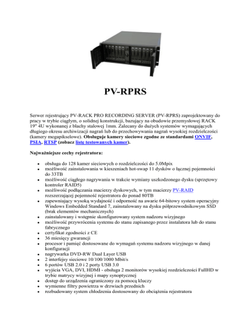 PV-RPRS Serwer rejestrujący PV-RACK PRO RECORDING SERVER (PV-RPRS) zaprojektowany do pracy w trybie ciągłym, o solidnej konstrukcji, bazujący na obudowie przemysłowej RACK 19" 4U wykonanej z blachy stalowej 1mm. Zalecany do dużych systemów wymagających długiego okresu archiwizacji nagrań lub do przechowywania nagrań wysokiej rozdzielczości (kamery megapikselowe). Obsługuje kamery sieciowe zgodne ze standardami ONVIF, PSIA, RTSP (zobacz listę testowanych kamer). Najważniejsze cechy rejestratora: obsługa do 128 kamer sieciowych o rozdzielczości do 5.0Mpix możliwość zainstalowania w kieszeniach hot-swap 11 dysków o łącznej pojemności do 33TB możliwość ciągłego nagrywania w trakcie wymiany uszkodzonego dysku (sprzętowy kontroler RAID5) możliwość podłączania macierzy dyskowych, w tym macierzy PV-RAID rozszerzającej pojemność rejestratora do ponad 80TB zapewniający wysoką wydajność i odporność na awarie 64-bitowy system operacyjny Windows Embedded Standard 7, zainstalowany na dysku półprzewodnikowym SSD (brak elementów mechanicznych) zainstalowany i wstępnie skonfigurowany system nadzoru wizyjnego możliwość przywrócenia systemu do stanu zapisanego przez instalatora lub do stanu fabrycznego certyfikat zgodności z CE 36 miesięcy gwarancji procesor i pamięć dostosowane do wymagań systemu nadzoru wizyjnego w danej konfiguracji nagrywarka DVD-RW Dual Layer USB 2 interfejsy sieciowe 10/100/1000 Mbit/s 6 portów USB 2.0 i 2 porty USB 3.0 wyjścia VGA, DVI, HDMI - obsługa 2 monitorów wysokiej rozdzielczości FullHD w trybie matrycy wizyjnej i mapy synoptycznej dostęp do urządzenia ograniczony za pomocą kluczy wymienne filtry powietrza w drzwiach przednich rozbudowany system chłodzenia dostosowany do obciążenia rejestratora wymiary 528,3mm x 482,6mm x 177,8 mm (dług. x szer. x wys.) waga z pustymi kieszeniami ok. 21 kg, z dyskami ok. 28kg waga jednego dysku bez kieszeni ok. 650g zasilanie 230VAC (z włączonymi 5 dyskami 150W, start 220W, z 11 dyskami 200W, start 390W) zasilanie jednego dysku 12VDC + 5VDC (8W, start 13W) zakres temperatur pracy od 0 do +45 stopni C. Najważniejsze funkcje rejestratora: obsługa wielu modeli kamer sieciowych (zobacz listę) możliwość zwielakratniania strumieni wideo IP do 300 połączeń (tzw. bramka wideo) możliwość zdalnego sterowania rejestratorem przez sieć IP szybkie zapisywanie i odtwarzanie konfiguracji, również na innym rejestratorze archiwizacja nagrań przez sieć IP w trybie ciągłym, detekcji ruchu (tylko dla kamer z serii GV i PV), sygnałów we/wy lub zgodnie z harmonogramem na dowolne dyski lokalne i sieciowe oznaczone literami przez system Windows archiwizacja danych w popularnych formatach graficznych (AVI, JPG, itd) i w plikach wykonywalnych (EXE), możliwych do odtworzenia na dowolnym PC obsługa macierzy iSCSI do zapisu nagrań możliwość przydzielenia niezależnego miejsca na archiwum nagrań dla wybranej kamery lub grupy kamer możliwość zablokowania wybranych zarejestrowanych zdarzeń przed automatycznym nadpisaniem w razie zapełnienia dysków otwarta architektura umożliwiająca integrację programistyczną z innymi systemami (np. fiskalne, wagowe, drogowe), m.in. dostępność pakietu SDK do celów programistycznych powiadamianie na e-mail dwukierunkowa komunikacja audio mapy synoptyczne (elektroniczna E-Mapa) podgląd i odtwarzanie nagrań przez sieć IP dowolną przeglądarką WWW lub dołączonymi aplikacjami dedykowanymi MultiView i Remote Viewlog opcjonalna rozbudowa systemu o zaawansowane stacje operatorskie GV-Control Center z możliwością podglądu wielu matryc wizyjnych IP (tzw. ściany TV) monitorowanie wykorzystania pasma sieciowego oprogramowanie w języku polskim