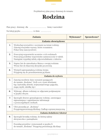 ANEKS Przykładowy plan pracy dziennej do tematu: Rodzina Plan pracy dziennej dla ……………………………………… (imię i nazwisko) Na lekcji języka …………………………… w dniu ………………………. Zadania Wykonane? Zadania obowiązkowe 1. Wysłuchaj wywiadów z uczniami na temat rodziny. Zanotuj wszystkie wyrazy, które rozumiesz. Pokaż listę nauczycielowi. 2. Przeczytaj wypowiedzi uczniów o ich rodzinach. Przeczytaj podobne wypowiedzi zamieszczone w tabeli. Następnie wypełnij tabelę odpowiednikami z tekstów. 3. Napisz list do mieszkańca Marsa o swojej rodzinie. Wrzuć list do klasowej skrzynki pocztowej. 4. Wymyśl najwspanialszą rodzinę świata. Przygotuj się do przedstawienia jej klasie. Zadania do wyboru 5. Zanotuj możliwie dużo wyrażeń pasujących do tematu „Rodzina”. Zrób coś z tymi słówkami (np. kartotekę słówek, trójwymiarowego pajączka, mapę myśli, tabelkę itp.). 6. Wykonaj album rodzinny ze zdjęciami podpisanymi w języku obcym. 7. Sporządź drzewo genealogiczne rodziny, zawierające najważniejsze i najciekawsze informacje o poszczególnych osobach. 8. Ułóż piosenkę pt. „Rodzina”. Przygotuj prezentację dla klasy. Zadbaj o oprawę muzyczną. Zadania dodatkowe (ekstra) 9. Sporządź kronikę rodziny, do której należy skrzyneczka z pamiątkami. Poszukaj przysłów i rymowanek w języku X do tematu „Rodzina”. Przygotuj prezentację dla klasy. Sprawdzone?