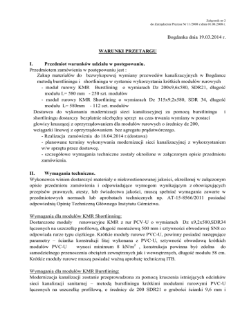 Załącznik nr 2 do Zarządzenia Prezesa Nr 11/2008 z dnia 01.08.2008 r. Bogdanka dnia 19.03.2014 r. WARUNKI PRZETARGU I. Przedmiot warunków udziału w postępowaniu. Przedmiotem zamówienia w postępowaniu jest : Zakup materiałów do bezwykopowej wymiany przewodów kanalizacyjnych w Bogdance metodą burstliningu i shortliningu w systemie wykorzystania krótkich modułów rurowych - moduł rurowy KMR Burstlining o wymiarach Dz 200x9,6x580, SDR21, długość modułu L= 580 mm - 250 szt. modułów - moduł rurowy KMR Shortlining o wymiarach Dz 315x9,2x580, SDR 34, długość modułu L= 580mm - 112 szt. modułów Dostawca do wykonania modernizacji sieci kanalizacyjnej za pomocą burstliningu i shortliningu dostarczy bezpłatnie niezbędny sprzęt na czas trwania wymiany w postaci głowicy kruszącej z oprzyrządowaniem dla modułów rurowych o średnicy dz 200, wciągarki linowej z oprzyrządowaniem bez agregatu prądotwórczego. - Realizacja zamówienia do 18.04.2014 r.(dostawa) - planowane terminy wykonywania modernizacji sieci kanalizacyjnej z wykorzystaniem w/w sprzętu przez dostawcę. - szczegółowe wymagania techniczne zostały określone w załączonym opisie przedmiotu zamówienia. II. Wymagania techniczne. Wykonawca winien dostarczyć materiały o niekwestionowanej jakości, określonej w załączonym opisie przedmiotu zamówienia i odpowiadające wymogom wynikającym z obowiązujących przepisów prawnych, atesty, lub świadectwa jakości, muszą spełniać wymagania zawarte w przedmiotowych normach lub aprobatach technicznych np. AT-15-8566/2011 posiadać odpowiednią Opinię Techniczną Głównego Instytutu Górnictwa. Wymagania dla modułów KMR Shortlinning: Dostarczone moduły renowacyjne KMR z rur PCV-U o wymiarach Dz x9,2x580,SDR34 łączonych na uszczelkę profilową, długość montażową 500 mm i sztywności obwodowej SN8 co odpowiada rurze typu ciężkiego. Krótkie moduły rurowe PVC-U, powinny posiadać następujące parametry – ścianka konstrukcji litej wykonana z PVC-U, sztywność obwodową krótkich modułów PVC-U wynosi minimum 8 kN/m2 , konstrukcja powinna być zdolna do samodzielnego przenoszenia obciążeń zewnętrznych jak i wewnętrznych, długość modułu 58 cm. Krótkie moduły rurowe muszą posiadać ważną aprobatę techniczną ITB. Wymagania dla modułów KMR Burstlining: Modernizacja kanalizacji zostanie przeprowadzona za pomocą kruszenia istniejących odcinków sieci kanalizacji sanitarnej – metodą burstliningu krótkimi modułami rurowymi PVC-U łączonych na uszczelkę profilową, o średnicy dz 200 SDR21 o grubości ścianki 9,6 mm i długości montażowej 53 cm (całkowitej długości 58 cm) i sztywności obwodowej SN 32, aprobatę techniczną ITB. III. Sposób składania oferty. Oferta powinna być złożona w zalakowanych lub opieczętowanych kopertach w terminie do 07.04.2014 r. do godz.12 w siedzibie Spółki opisanych w następujący sposób: Nazwa firmy/pieczęć/aktualny telefon, fax, e-mail Przetarg na dostawę modułów rurowych KMR Shortining i modułów KMR Burstlining W skład oferty winny wchodzić : Odpis z KRS, Koszt realizacji zamówienia Oświadczenie, że koszt określony w ofercie może podlegać/nie podlega negocjacjom w trakcie postępowania i nie ulegnie w czasie obowiązywania umowy. Termin (ilość dni od daty otrzymania faktury) i sposób płatności. Termin dostawy Określenie czasu obowiązywania oferty od dnia jej złożenia, Warunki gwarancyjne Oświadczenie Wykonawcy, że akceptuje warunki zawarte we wzorze umowy i przystępuje do postępowania na warunkach opisanych w opisie przedmiotu zamówienia, w miejscu i terminie wyznaczonym przez zamawiającego. Oświadczenie dostawcy, że znajduje się w sytuacji finansowej zapewniającej wykonanie zadania. IV. Wymagania pozostałe 1. Oferty powinny być podpisane przez osoby uprawnione do reprezentowania oferenta, tj.: a) osoby wchodzące w skład organu zarządzającego, wymienione w rejestrze handlowym dla danego rodzaju osób prawnych, b) właściciela firmy wymienionego w zaświadczeniu o wpisie do ewidencji działalności gospodarczej (osoby fizyczne) lub wszystkich właścicieli (spółki cywilne), c) osoby upoważnione przez w/w organy lub właścicieli, d) wszystkie dokumenty i oświadczenia winny zostać złożone przez oferenta w formie oryginału lub kserokopii poświadczonej za zgodność przez osoby upoważnione do reprezentowania oferenta zgodnie z zasadami reprezentacji Uwaga: Podpisy powinny być złożone w kolorze innym niż czarny. 2. Oferta musi być sporządzona w języku polskim, ewentualne dokumenty sporządzone w innym języku wymagają załączeniu również ich tłumaczenia. 3. Oferta nie podlega zwrotowi. 4. Nie przewidujemy informowania wszystkich oferentów o wynikach postępowania, tylko wybrany oferent umówiony zostanie na podpisanie umowy na realizację prac. V. Ramowy projekt umowy. Projekt umowy w załączeniu, szczegóły i ewentualne drobne zmiany do uzgodnienia w trakcie negocjacji. VI. Spółka zastrzega sobie prawo swobodnego wyboru oferty, jak też zamknięcia przetargu be z wybrania którejkolwiek z ofert, bez podania przyczyn.