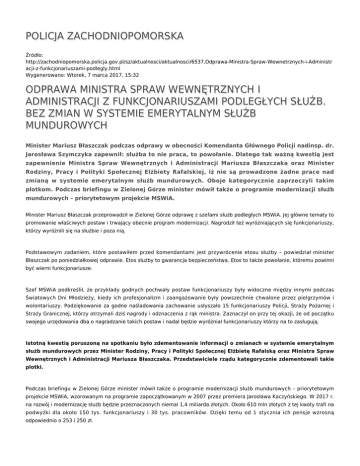 POLICJA ZACHODNIOPOMORSKA Źródło: http://zachodniopomorska.policja.gov.pl/sz/aktualnosci/aktualnosci/6537,Odprawa-Ministra-Spraw-Wewnetrznych-i-Administr acji-z-funkcjonariuszami-podlegly.html Wygenerowano: Wtorek, 7 marca 2017, 15:32 ODPRAWA MINISTRA SPRAW WEWNĘTRZNYCH I ADMINISTRACJI Z FUNKCJONARIUSZAMI PODLEGŁYCH SŁUŻB. BEZ ZMIAN W SYSTEMIE EMERYTALNYM SŁUŻB MUNDUROWYCH Minister Mariusz Błaszczak podczas odprawy w obecności Komendanta Głównego Policji nadinsp. dr. Jarosława Szymczyka zapewnił: służba to nie praca, to powołanie. Dlatego tak ważną kwestią jest zapewnienie Ministra Spraw Wewnętrznych i Administracji Mariusza Błaszczaka oraz Minister Rodziny, Pracy i Polityki Społecznej Elżbiety Rafalskiej, iż nie są prowadzone żadne prace nad zmianą w systemie emerytalnym służb mundurowych. Oboje kategorycznie zaprzeczyli takim plotkom. Podczas briefingu w Zielonej Górze minister mówił także o programie modernizacji służb mundurowych – priorytetowym projekcie MSWiA. Minister Mariusz Błaszczak przeprowadził w Zielonej Górze odprawę z szefami służb podległych MSWiA. Jej główne tematy to promowanie właściwych postaw i trwający obecnie program modernizacji. Nagrodził też wyróżniających się funkcjonariuszy, którzy wyróżnili się na służbie i poza nią. Podstawowym zadaniem, które postawiłem przed komendantami jest przywrócenie etosu służby – powiedział minister Błaszczak po poniedziałkowej odprawie. Etos służby to gwarancja bezpieczeństwa. Etos to także powołanie, któremu powinni być wierni funkcjonariusze. Szef MSWiA podkreślił, że przykłady godnych pochwały postaw funkcjonariuszy były widoczne między innymi podczas Światowych Dni Młodzieży, kiedy ich profesjonalizm i zaangażowanie były powszechnie chwalone przez pielgrzymów i wolontariuszy. Podziękowanie za godne naśladowania zachowanie usłyszało 15 funkcjonariuszy Policji, Straży Pożarnej i Straży Granicznej, którzy otrzymali dziś nagrody i odznaczenia z rąk ministra. Zaznaczył on przy tej okazji, że od początku swojego urzędowania dba o nagradzanie takich postaw i nadal będzie wyróżniał funkcjonariuszy którzy na to zasługują. Istotną kwestią poruszoną na spotkaniu było zdementowanie informacji o zmianach w systemie emerytalnym służb mundurowych przez Minister Rodziny, Pracy i Polityki Społecznej Elżbietę Rafalską oraz Ministra Spraw Wewnętrznych i Administracji Mariusza Błaszczaka. Przedstawiciele rządu kategorycznie zdementowali takie plotki. Podczas briefingu w Zielonej Górze minister mówił także o programie modernizacji służb mundurowych – priorytetowym projekcie MSWiA, wzorowanym na programie zapoczątkowanym w 2007 przez premiera Jarosława Kaczyńskiego. W 2017 r. na rozwój i modernizację służb będzie przeznaczonych niemal 1,4 miliarda złotych. Około 610 mln złotych z tej kwoty trafi na podwyżki dla około 150 tys. funkcjonariuszy i 30 tys. pracowników. Dzięki temu od 1 stycznia ich pensje wzrosną odpowiednio o 253 i 250 zł. Jak zaznaczył Komendant Główny Policji nadinsp. Jarosław Szymczyk, niezwykle pomoże ona w realizacji zadań, z których wywiązują się policjanci. Podwyżki dla policjantów i pracowników policji, doposażenie w profesjonalny sprzęt aby jeszcze skuteczniej zapewniać bezpieczeństwo obywatelom. Szef Policji zaakcentował na konieczność odbiurokratyzowania pracy dzielnicowego, przywracanie wygaszanych wcześniej Posterunków Policji oraz funkcjonowanie Krajowej Mapy Zagrożeń Bezpieczeństwa. Wszystko to ma stanowić podstawowy filar zbliżania Policji do społeczeństwa oraz wychodzenie naprzeciw potrzebom i oczekiwaniom obywateli. Program modernizacji składa się z trzech głównych komponentów. Oprócz wzrostu płac, przewiduje też inwestycje w wyposażenie i infrastrukturę służb. Moim zadaniem jest zapewnienie warunków, aby Wasza służba mogła przebiegać we właściwy sposób. W tym celu przygotowałem program modernizacji. Jego efektem ma być wzrastający z roku na rok poziom bezpieczeństwa – powiedział minister. Odprawa Ministra Spraw Wewnętrznych i Administracji z funkcjonariuszami podległych służb Odprawa Ministra Spraw Wewnętrznych i Administracji z funkcjonariuszami podległych służb Odprawa Ministra Spraw Wewnętrznych i Administracji z funkcjonariuszami podległych służb Odprawa Ministra Spraw Wewnętrznych i Administracji z funkcjonariuszami podległych służb Odprawa Ministra Spraw Wewnętrznych i Administracji z funkcjonariuszami podległych służb Odprawa Ministra Spraw Wewnętrznych i Administracji z funkcjonariuszami podległych służb Odprawa Ministra Spraw Wewnętrznych i Administracji z funkcjonariuszami podległych służb Odprawa Ministra Spraw Wewnętrznych i Administracji z funkcjonariuszami podległych służb Odprawa Ministra Spraw Wewnętrznych i Administracji z funkcjonariuszami podległych służb Odprawa Ministra Spraw Wewnętrznych i Administracji z funkcjonariuszami podległych służb Odprawa Ministra Spraw Wewnętrznych i Administracji z funkcjonariuszami podległych służb Odprawa Ministra Spraw Wewnętrznych i Administracji z funkcjonariuszami podległych służb Odprawa Ministra Spraw Wewnętrznych i Administracji z funkcjonariuszami podległych służb Odprawa Ministra Spraw Wewnętrznych i Administracji z funkcjonariuszami podległych służb Odprawa Ministra Spraw Wewnętrznych i Administracji z funkcjonariuszami podległych służb Odprawa Ministra Spraw Wewnętrznych i Administracji z funkcjonariuszami podległych służb Odprawa Ministra Spraw Wewnętrznych i Administracji z funkcjonariuszami podległych służb Ocena: 1/5 (3) Tweetnij