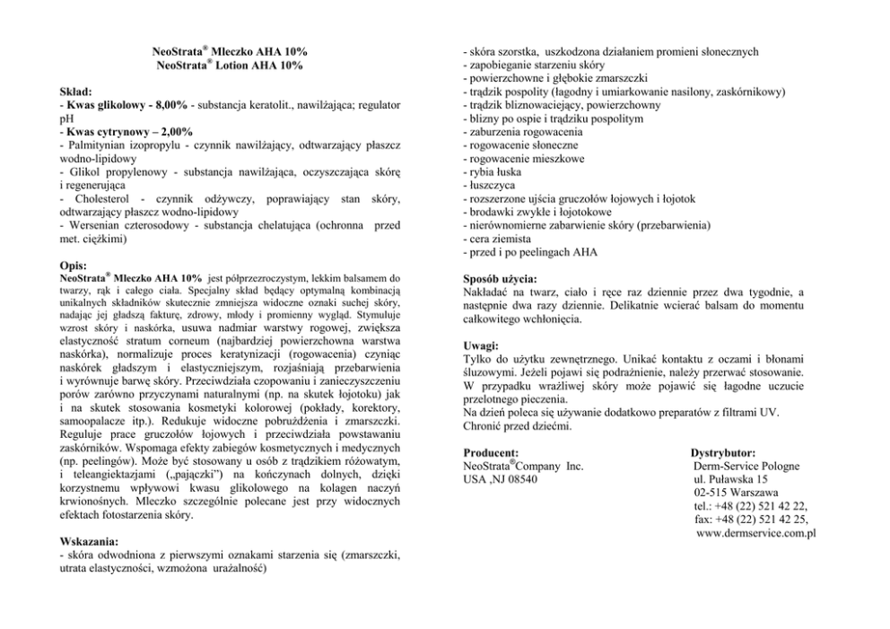 NeoStrata® Mleczko AHA 10% NeoStrata® Lotion AHA 10% Skład: - Kwas glikolowy - 8,00% - substancja keratolit., nawilżająca; regulator pH - Kwas cytrynowy – 2,00% - Palmitynian izopropylu - czynnik nawilżający, odtwarzający płaszcz wodno-lipidowy - Glikol propylenowy - substancja nawilżająca, oczyszczająca skórę i regenerująca - Cholesterol - czynnik odżywczy, poprawiający stan skóry, odtwarzający płaszcz wodno-lipidowy - Wersenian czterosodowy - substancja chelatująca (ochronna przed met. ciężkimi) - skóra szorstka, uszkodzona działaniem promieni słonecznych - zapobieganie starzeniu skóry - powierzchowne i głębokie zmarszczki - trądzik pospolity (łagodny i umiarkowanie nasilony, zaskórnikowy) - trądzik bliznowaciejący, powierzchowny - blizny po ospie i trądziku pospolitym - zaburzenia rogowacenia - rogowacenie słoneczne - rogowacenie mieszkowe - rybia łuska - łuszczyca - rozszerzone ujścia gruczołów łojowych i łojotok - brodawki zwykłe i łojotokowe - nierównomierne zabarwienie skóry (przebarwienia) - cera ziemista - przed i po peelingach AHA Opis: NeoStrata® Mleczko AHA 10% jest półprzezroczystym, lekkim balsamem do twarzy, rąk i całego ciała. Specjalny skład będący optymalną kombinacją unikalnych składników skutecznie zmniejsza widoczne oznaki suchej skóry, nadając jej gładszą fakturę, zdrowy, młody i promienny wygląd. Stymuluje wzrost skóry i naskórka, usuwa nadmiar warstwy rogowej, zwiększa Sposób użycia: Nakładać na twarz, ciało i ręce raz dziennie przez dwa tygodnie, a następnie dwa razy dziennie. Delikatnie wcierać balsam do momentu całkowitego wchłonięcia. elastyczność stratum corneum (najbardziej powierzchowna warstwa naskórka), normalizuje proces keratynizacji (rogowacenia) czyniąc naskórek gładszym i elastyczniejszym, rozjaśniają przebarwienia i wyrównuje barwę skóry. Przeciwdziała czopowaniu i zanieczyszczeniu porów zarówno przyczynami naturalnymi (np. na skutek łojotoku) jak i na skutek stosowania kosmetyki kolorowej (pokłady, korektory, samoopalacze itp.). Redukuje widoczne pobrużdżenia i zmarszczki. Reguluje prace gruczołów łojowych i przeciwdziała powstawaniu zaskórników. Wspomaga efekty zabiegów kosmetycznych i medycznych (np. peelingów). Może być stosowany u osób z trądzikiem różowatym, i teleangiektazjami („pajączki”) na kończynach dolnych, dzięki korzystnemu wpływowi kwasu glikolowego na kolagen naczyń krwionośnych. Mleczko szczególnie polecane jest przy widocznych efektach fotostarzenia skóry. Uwagi: Tylko do użytku zewnętrznego. Unikać kontaktu z oczami i błonami śluzowymi. Jeżeli pojawi się podrażnienie, należy przerwać stosowanie. W przypadku wrażliwej skóry może pojawić się łagodne uczucie przelotnego pieczenia. Na dzień poleca się używanie dodatkowo preparatów z filtrami UV. Chronić przed dziećmi. Wskazania: - skóra odwodniona z pierwszymi oznakami starzenia się (zmarszczki, utrata elastyczności, wzmożona urażalność) Producent: NeoStrata®Company Inc. USA ,NJ 08540 Dystrybutor: Derm-Service Pologne ul. Puławska 15 02-515 Warszawa tel.: +48 (22) 521 42 22, fax: +48 (22) 521 42 25, www.dermservice.com.pl