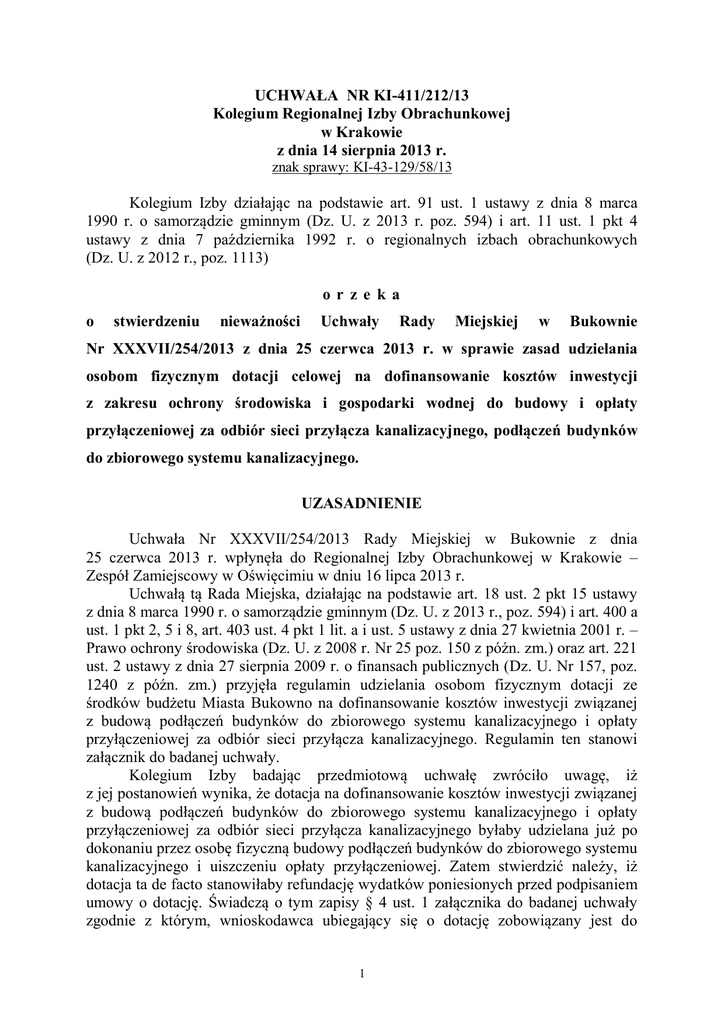 UCHWAŁA NR KI-411/212/13 Kolegium Regionalnej Izby Obrachunkowej w Krakowie z dnia 14 sierpnia 2013 r. znak sprawy: KI-43-129/58/13 Kolegium Izby działając na podstawie art. 91 ust. 1 ustawy z dnia 8 marca 1990 r. o samorządzie gminnym (Dz. U. z 2013 r. poz. 594) i art. 11 ust. 1 pkt 4 ustawy z dnia 7 października 1992 r. o regionalnych izbach obrachunkowych (Dz. U. z 2012 r., poz. 1113) or ze ka o stwierdzeniu nieważności Uchwały Rady Miejskiej w Bukownie Nr XXXVII/254/2013 z dnia 25 czerwca 2013 r. w sprawie zasad udzielania osobom fizycznym dotacji celowej na dofinansowanie kosztów inwestycji z zakresu ochrony środowiska i gospodarki wodnej do budowy i opłaty przyłączeniowej za odbiór sieci przyłącza kanalizacyjnego, podłączeń budynków do zbiorowego systemu kanalizacyjnego. UZASADNIENIE Uchwała Nr XXXVII/254/2013 Rady Miejskiej w Bukownie z dnia 25 czerwca 2013 r. wpłynęła do Regionalnej Izby Obrachunkowej w Krakowie – Zespół Zamiejscowy w Oświęcimiu w dniu 16 lipca 2013 r. Uchwałą tą Rada Miejska, działając na podstawie art. 18 ust. 2 pkt 15 ustawy z dnia 8 marca 1990 r. o samorządzie gminnym (Dz. U. z 2013 r., poz. 594) i art. 400 a ust. 1 pkt 2, 5 i 8, art. 403 ust. 4 pkt 1 lit. a i ust. 5 ustawy z dnia 27 kwietnia 2001 r. – Prawo ochrony środowiska (Dz. U. z 2008 r. Nr 25 poz. 150 z późn. zm.) oraz art. 221 ust. 2 ustawy z dnia 27 sierpnia 2009 r. o finansach publicznych (Dz. U. Nr 157, poz. 1240 z późn. zm.) przyjęła regulamin udzielania osobom fizycznym dotacji ze środków budżetu Miasta Bukowno na dofinansowanie kosztów inwestycji związanej z budową podłączeń budynków do zbiorowego systemu kanalizacyjnego i opłaty przyłączeniowej za odbiór sieci przyłącza kanalizacyjnego. Regulamin ten stanowi załącznik do badanej uchwały. Kolegium Izby badając przedmiotową uchwałę zwróciło uwagę, iż z jej postanowień wynika, że dotacja na dofinansowanie kosztów inwestycji związanej z budową podłączeń budynków do zbiorowego systemu kanalizacyjnego i opłaty przyłączeniowej za odbiór sieci przyłącza kanalizacyjnego byłaby udzielana już po dokonaniu przez osobę fizyczną budowy podłączeń budynków do zbiorowego systemu kanalizacyjnego i uiszczeniu opłaty przyłączeniowej. Zatem stwierdzić należy, iż dotacja ta de facto stanowiłaby refundację wydatków poniesionych przed podpisaniem umowy o dotację. Świadczą o tym zapisy § 4 ust. 1 załącznika do badanej uchwały zgodnie z którym, wnioskodawca ubiegający się o dotację zobowiązany jest do 1 złożenia w siedzibie Urzędu Miejskiego w Bukownie wniosku wraz z wszystkimi wymaganymi załącznikami, tj. między innymi oryginalnymi rachunkami lub fakturami VAT obejmującymi koszty kwalifikowane oraz protokołem odbioru stanu technicznego podłączenia budynku do zbiorowego systemu kanalizacyjnego, sporządzonym przez odbiorcę ścieków. Jak wynika z postanowienia § 2 pkt 7 załącznika do uchwały kosztami kwalifikowanymi są koszty faktycznie poniesione przez wnioskodawcę na budowę podłączenia budynków do zbiorowego systemu kanalizacyjnego i opłaty przyłączeniowej za odbiór przyłącza kanalizacyjnego – potwierdzone rachunkami bądź fakturami VAT wystawionymi w tym okresie na Wnioskodawcę, podatek od towarów i usług (VAT) stanowi koszt kwalifikowany. Jak wynika z § 4 ust. 3 i 4 załącznika do badanej uchwały na podstawie załączonych do wniosku dokumentów, upoważniony pracownik Urzędu Miejskiego w Bukownie dokona wyliczenia przysługującego dofinansowania określonego w § 3 ust. 3 regulaminu (§ 4 ust. 3), a kompletny wniosek zostanie zarejestrowany na liście wniosków o dotację według kolejności wpływu do Urzędu Miejskiego w Bukownie, a Wnioskodawca zostanie powiadomiony pisemnie o terminie i miejscu popisania umowy o udzieleniu dotacji, albo o odmowie jej udzielenia (§ 4 ust. 4). Odnosząc się do powyższego Kolegium Izby ustaliło, iż Rada Miejska w Bukownie w sposób istotny wykroczyła poza zakres upoważnienia z art. 403 ust. 5 ustawy z dnia 27 kwietnia 2001 r. Prawo ochrony środowiska w związku z art. 126 i 127 ust. 1 ustawy z dnia 27 sierpnia 2009 roku o finansach publicznych (t.j. Dz. U. z 2013 r., poz. 885). Zgodnie z dyspozycją art. 403 ust. 4, 5 i 6 ustawy z dnia 27 kwietnia 2001 r. Prawo ochrony środowiska, finansowanie ochrony środowiska i gospodarki wodnej może polegać na udzielaniu dotacji celowej w rozumieniu przepisów ustawy z dnia 27 sierpnia 2009 r. o finansach publicznych z budżetu gminy lub budżetu powiatu na finansowanie lub dofinansowanie kosztów inwestycji: 1) podmiotów niezaliczonych do sektora finansów publicznych, w szczególności: a) osób fizycznych, b) wspólnot mieszkaniowych, c) osób prawnych, d) przedsiębiorców; 2) jednostek sektora finansów publicznych będących gminnymi lub powiatowymi osobami prawnymi. Zasady udzielania dotacji celowej, obejmujące w szczególności kryteria wyboru inwestycji do finansowania lub dofinansowania oraz tryb postępowania w sprawie udzielania dotacji i sposób jej rozliczania określa odpowiednio rada gminy albo rada powiatu w drodze uchwały. Udzielenie dotacji celowej, o której mowa w ust. 4 następuje na podstawie umowy zawartej przez gminę z podmiotami określonymi w ust. 4. Natomiast jak wynika z art. 126 ustawy o finansach publicznych: „Dotacje są to podlegające szczególnym zasadom rozliczania środki z budżetu państwa, budżetu jednostek samorządu terytorialnego oraz państwowych funduszy celowych przeznaczone na podstawie niniejszej ustawy, odrębnych ustaw lub umów międzynarodowych, na finasowanie lub dofinansowanie realizacji zadań publicznych. Z kolei art. 127 ust. 1 pkt 1 lit. f ustawy o finansach publicznych stanowi, iż: „Dotacje 2 celowe są to środki przeznaczone na finansowanie lub dofinansowanie kosztów realizacji inwestycji”. Z istoty dotacji celowej wynika, iż może ona być wykorzystana pr