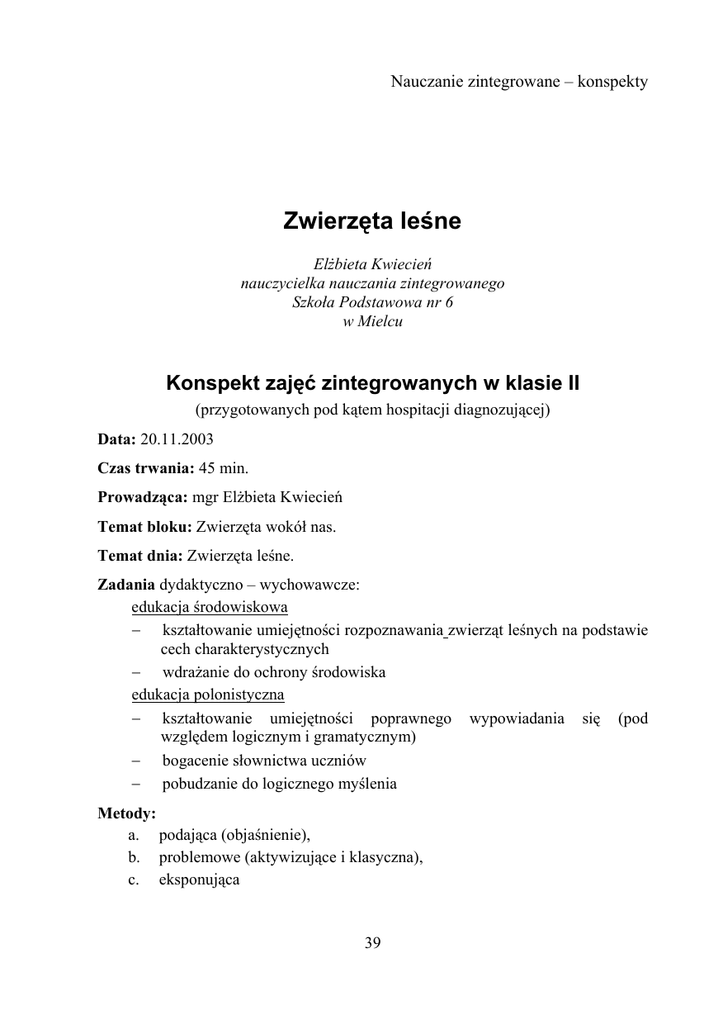 Nauczanie zintegrowane – konspekty Zwierzęta leśne Elżbieta Kwiecień nauczycielka nauczania zintegrowanego Szkoła Podstawowa nr 6 w Mielcu Konspekt zajęć zintegrowanych w klasie II (przygotowanych pod kątem hospitacji diagnozującej) Data: 20.11.2003 Czas trwania: 45 min. Prowadząca: mgr Elżbieta Kwiecień Temat bloku: Zwierzęta wokół nas. Temat dnia: Zwierzęta leśne. Zadania dydaktyczno – wychowawcze: edukacja środowiskowa − kształtowanie umiejętności rozpoznawania zwierząt leśnych na podstawie cech charakterystycznych − wdrażanie do ochrony środowiska edukacja polonistyczna − kształtowanie umiejętności poprawnego wypowiadania się (pod względem logicznym i gramatycznym) − bogacenie słownictwa uczniów − pobudzanie do logicznego myślenia Metody: a. podająca (objaśnienie), b. problemowe (aktywizujące i klasyczna), c. eksponująca 39 Elżbieta Kwiecień – Zwierzęta leśne, konspekt zajęć zintegrowanych w klasie II. Formy: zbiorowa, indywidualna Środki dydaktyczne: 1. ilustracje przedstawiające zwierzęta leśne 2. duża ilustracja „Przygotowania zwierząt do zimy” 3. rozsypanka zdaniowa 4. obrazek do ułożenia 5. kartoniki z napisami „tak” i „nie” Przebieg zajęć 1. Powitanie. 2. Wypowiedzi nt. zmian zachodzących w przyrodzie późną jesienią. 3. Ułożenie obrazka i odczytanie tematu (obrazek pocięty na 5 części przedstawia zwierzęta przy paśniku, sylaby na dole obrazka ułożą hasło „Zwierzęta leśne”). 4. Wypowiedzi dotyczące tekstu „Co słychać w lesie?” (tekst opracowany poprzedniego dnia). 5. Rozwiązywanie zagadek o zwierzętach leśnych, wskazywanie zwierząt na ilustracji. 6. Utrwalenie różnic pomiędzy ptakami i ssakami. 7. Układanie pytań na podstawie ilustracji (uczniowie uważnie obserwują przypiętą na tablicy ilustrację „Przygotowania zwierząt do zimy” a następnie sami układają do niej pytania i zadają swoim kolegom). 8. Rozmowa z uczniami o przygotowaniach zwierząt do zimy (które zwierzęta gromadzą zapasy, które zasypiają, którym najtrudniej będzie przetrwać zimę, jak możemy im pomagać). 9. Układanie kilkuzdaniowych wypowiedzi o wybranych zwierzętach leśnych (uczniowie przedstawiają się jako zwierzęta – mówią o swoim wyglądzie, trybie życia). 10. Porządkowanie zdań rozsypanki (rozsypanka na kolorowych paskach, ułatwiających sprawdzenie poprawności wykonanej pracy). Nadeszła późna jesień. Zwierzęta leśne przygotowują się do zimy. Jedne gromadzą zapasy a inne zapadają w sen. Najbiedniejsze będą zimą zające, sarny i dziki. To właśnie im ludzie muszą pomagać. 11. Kończenie zdań rozpoczętych przez nauczyciela. 12. Zabawa utrwalająca wiadomości (nauczyciel podaje w formie zdań oznajmujących prawdziwe i fałszywe informacje o zwierzętach leśnych, uczniowie reagują podniesieniem kartoników z napisem „tak” lub „nie”). 40 CKPiDN w Mielcu – Zeszyty nauczycielskie – Nr3/2005 EWALUACJA (dotycząca zajęć przeprowadzonych w klasie II w dniu 20.11.2003 r. przez nauczycielkę nauczania zintegrowanego Elżbietę Kwiecień) Oceń w skali od 1 do 6: 1. Przygotowanie uczącej do przeprowadzonych zajęć 1 2. 5 6 2 3 4 5 6 2 3 4 5 6 Budowę arkusza hospitacji diagnozującej 1 5. 4 Przydatność wybranych wskaźników do możliwości oceny umiejętności wypowiadania się uczniów . 1 4. 3 Dobór metod i form pracy do standardu określonego w arkuszu hospitacji diagnozującej 1 3. 2 2 3 4 5 6 Przydatność hospitowanych zajęć dla Pani pracy zawodowej 1 2 3 4 5 6 Literatura: 1. M. Durda - „Hospitacja diagnozująca”, „Nowe w szkole” 3/2002 2. J. Hanisz - „Program wczesnoszkolnej zintegrowanej edukacji XXI wieku klasy I-III”, nr DKW – 4014-267/99 41