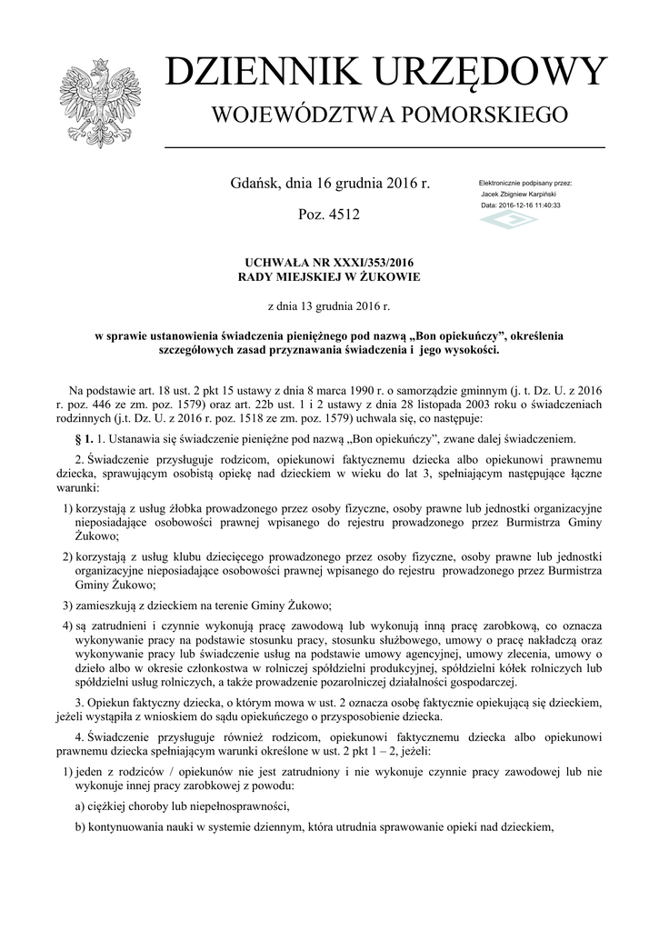 DZIENNIK URZĘDOWY WOJEWÓDZTWA POMORSKIEGO Gdańsk, dnia 16 grudnia 2016 r. Elektronicznie podpisany przez: Jacek Zbigniew Karpiński Poz. 4512 Data: 2016-12-16 11:40:33 UCHWAŁA NR XXXI/353/2016 RADY MIEJSKIEJ W ŻUKOWIE z dnia 13 grudnia 2016 r. w sprawie ustanowienia świadczenia pieniężnego pod nazwą „Bon opiekuńczy”, określenia szczegółowych zasad przyznawania świadczenia i jego wysokości. Na podstawie art. 18 ust. 2 pkt 15 ustawy z dnia 8 marca 1990 r. o samorządzie gminnym (j. t. Dz. U. z 2016 r. poz. 446 ze zm. poz. 1579) oraz art. 22b ust. 1 i 2 ustawy z dnia 28 listopada 2003 roku o świadczeniach rodzinnych (j.t. Dz. U. z 2016 r. poz. 1518 ze zm. poz. 1579) uchwala się, co następuje: § 1. 1. Ustanawia się świadczenie pieniężne pod nazwą „Bon opiekuńczy”, zwane dalej świadczeniem. 2. Świadczenie przysługuje rodzicom, opiekunowi faktycznemu dziecka albo opiekunowi prawnemu dziecka, sprawującym osobistą opiekę nad dzieckiem w wieku do lat 3, spełniającym następujące łączne warunki: 1) korzystają z usług żłobka prowadzonego przez osoby fizyczne, osoby prawne lub jednostki organizacyjne nieposiadające osobowości prawnej wpisanego do rejestru prowadzonego przez Burmistrza Gminy Żukowo; 2) korzystają z usług klubu dziecięcego prowadzonego przez osoby fizyczne, osoby prawne lub jednostki organizacyjne nieposiadające osobowości prawnej wpisanego do rejestru prowadzonego przez Burmistrza Gminy Żukowo; 3) zamieszkują z dzieckiem na terenie Gminy Żukowo; 4) są zatrudnieni i czynnie wykonują pracę zawodową lub wykonują inną pracę zarobkową, co oznacza wykonywanie pracy na podstawie stosunku pracy, stosunku służbowego, umowy o pracę nakładczą oraz wykonywanie pracy lub świadczenie usług na podstawie umowy agencyjnej, umowy zlecenia, umowy o dzieło albo w okresie członkostwa w rolniczej spółdzielni produkcyjnej, spółdzielni kółek rolniczych lub spółdzielni usług rolniczych, a także prowadzenie pozarolniczej działalności gospodarczej. 3. Opiekun faktyczny dziecka, o którym mowa w ust. 2 oznacza osobę faktycznie opiekującą się dzieckiem, jeżeli wystąpiła z wnioskiem do sądu opiekuńczego o przysposobienie dziecka. 4. Świadczenie przysługuje również rodzicom, opiekunowi faktycznemu dziecka albo opiekunowi prawnemu dziecka spełniającym warunki określone w ust. 2 pkt 1 – 2, jeżeli: 1) jeden z rodziców / opiekunów nie jest zatrudniony i nie wykonuje czynnie pracy zawodowej lub nie wykonuje innej pracy zarobkowej z powodu: a) ciężkiej choroby lub niepełnosprawności, b) kontynuowania nauki w systemie dziennym, która utrudnia sprawowanie opieki nad dzieckiem, Dziennik Urzędowy Województwa Pomorskiego –2– Poz. 4512 c) odbywania stażu, brania udziału w przygotowaniu zawodowym dla dorosłych, uczestnictwa w szkoleniach zawodowych, programach mających na celu aktywizację zawodową organizowanych przez urząd pracy lub inne podmioty, d) przebywania w areszcie śledczym lub zakładzie karnym. 2) oboje rodzice/ opiekunowie nie są zatrudnieni i nie wykonują czynnej pracy zawodowej lub innej pracy zarobkowej z powodu: a) ciężkiej choroby lub niepełnosprawności, b) kontynuowania nauki w systemie dziennym, która utrudnia sprawowanie opieki nad dzieckiem, c) odbywania stażu, brania udziału w przygotowaniu zawodowym dla dorosłych, uczestnictwa w szkoleniach zawodowych, programach mających na celu aktywizację zawodową organizowanych przez urząd pracy lub inne podmioty. 5. Świadczenie przysługuje również osobie samotnie wychowującej dziecko w rozumieniu art. 3 pkt 17a ustawy z dnia 28 listopada 2003 r. o świadczeniach rodzinnych. 6. Świadczenie nie przysługuje jeżeli: 1) wnioskodawca nie sprawuje osobistej opieki nad dzieckiem, 2) wnioskodawca korzysta z dofinansowania kosztów opieki nad dzieckiem z innych źródeł. § 2. 1. Świadczenie jest finansowane z budżetu Gminy Żukowo. 2. Świadczenie przysługuje na każde dziecko w wieku do lat 3, z zastrzeżeniem ust.3. 3. Za miesiąc, w którym dziecko kończy 3 lata, przysługuje świadczenie w pełnej wysokości. § 3. 1. Miesięczna wysokość świadczenia wynosi: 1) 200 zł na każde uprawnione dziecko uczęszczające do placówki, o której mowa w § 1 ust. 2 pkt 1, nie więcej jednak niż koszt sprawowania opieki nad dzieckiem wynikający z umowy zawartej z podmiotem prowadzącym tę placówkę, albo 2) 100 zł na każde uprawnione dziecko, uczęszczające do placówki, o której mowa w § 1 ust. 2 pkt 2, nie więcej jednak niż koszt sprawowania opieki nad dzieckiem wynikający z umowy zawartej z podmiotem prowadzącym tę placówkę. 2. Świadczenie przyznawane jest na okres sprawowania opieki nad dzieckiem przez placówki, o których mowa w § 1 ust. 2 pkt 1 i 2, nie dłużej jednak niż do końca 2017 roku. 3. Świadczenie przysługuje za miesiąc kalendarzowy, nie wcześniej niż od następnego miesiąca, w którym został złożony prawidłowo wypełniony i kompletny wniosek. 4. Świadczenie wypłacane jest z dołu za okres 3 miesięcy. 5. Świadczenie przekazywane jest na wskazany we wniosku rachunek bankowy. 6. Utrata zatrudnienia lub innej pracy zarobkowej przez rodziców w trakcie pobierania świadczenia nie powoduje utraty prawa do świadczenia przez jeden miesiąc, licząc od dnia ustania zatrudnienia lub zaprzestania innej pracy zarobkowej. § 4. 1. Ustalenie prawa do świadczenia oraz jego wypłata następują odpowiednio na wniosek rodzica, opiekuna faktycznego dziecka albo opiekuna prawnego dziecka. 2. W przypadku zbiegu prawa rodziców, opiekunów prawnych dziecka lub opiekunów faktycznych dziecka do świadczenia, świadczenie wypłaca się temu z rodziców, opiekunów prawnych dziecka lub opiekunów faktycznych dziecka, który faktycznie sprawuje opiekę nad dzieckiem. Jeżeli opieka nad dzieckiem sprawowana jest równocześnie przez oboje rodziców, opiekunów prawnych dziecka lub opiekunów faktycz