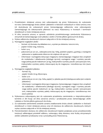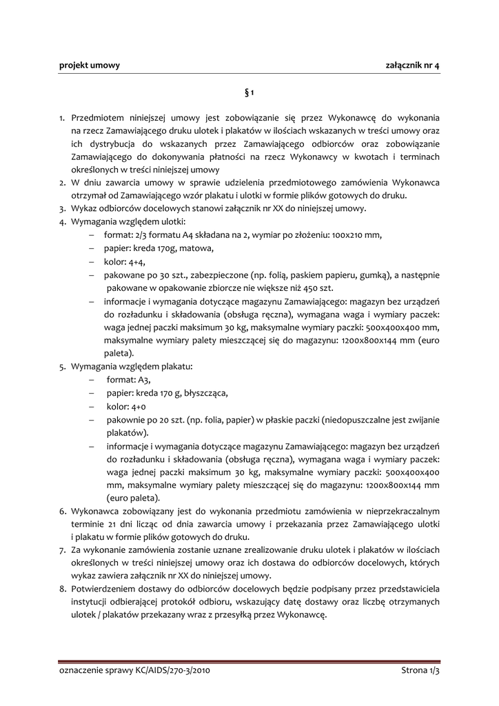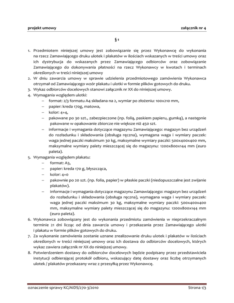 projekt umowy załącznik nr 4 §1 1. Przedmiotem niniejszej umowy jest zobowiązanie się przez Wykonawcę do wykonania na rzecz Zamawiającego druku ulotek i plakatów w ilościach wskazanych w treści umowy oraz ich dystrybucja do wskazanych przez Zamawiającego odbiorców oraz zobowiązanie Zamawiającego do dokonywania płatności na rzecz Wykonawcy w kwotach i terminach określonych w treści niniejszej umowy 2. W dniu zawarcia umowy w sprawie udzielenia przedmiotowego zamówienia Wykonawca otrzymał od Zamawiającego wzór plakatu i ulotki w formie plików gotowych do druku. 3. Wykaz odbiorców docelowych stanowi załącznik nr XX do niniejszej umowy. 4. Wymagania względem ulotki: − format: 2/3 formatu A4 składana na 2, wymiar po złożeniu: 100x210 mm, − papier: kreda 170g, matowa, − kolor: 4+4, − pakowane po 30 szt., zabezpieczone (np. folią, paskiem papieru, gumką), a następnie pakowane w opakowanie zbiorcze nie większe niż 450 szt. − informacje i wymagania dotyczące magazynu Zamawiającego: magazyn bez urządzeń do rozładunku i składowania (obsługa ręczna), wymagana waga i wymiary paczek: waga jednej paczki maksimum 30 kg, maksymalne wymiary paczki: 500x400x400 mm, maksymalne wymiary palety mieszczącej się do magazynu: 1200x800x144 mm (euro paleta). 5. Wymagania względem plakatu: − format: A3, − papier: kreda 170 g, błyszcząca, − kolor: 4+0 − pakownie po 20 szt. (np. folia, papier) w płaskie paczki (niedopuszczalne jest zwijanie plakatów). − informacje i wymagania dotyczące magazynu Zamawiającego: magazyn bez urządzeń do rozładunku i składowania (obsługa ręczna), wymagana waga i wymiary paczek: waga jednej paczki maksimum 30 kg, maksymalne wymiary paczki: 500x400x400 mm, maksymalne wymiary palety mieszczącej się do magazynu: 1200x800x144 mm (euro paleta). 6. Wykonawca zobowiązany jest do wykonania przedmiotu zamówienia w nieprzekraczalnym terminie 21 dni licząc od dnia zawarcia umowy i przekazania przez Zamawiającego ulotki i plakatu w formie plików gotowych do druku. 7. Za wykonanie zamówienia zostanie uznane zrealizowanie druku ulotek i plakatów w ilościach określonych w treści niniejszej umowy oraz ich dostawa do odbiorców docelowych, których wykaz zawiera załącznik nr XX do niniejszej umowy. 8. Potwierdzeniem dostawy do odbiorców docelowych będzie podpisany przez przedstawiciela instytucji odbierającej protokół odbioru, wskazujący datę dostawy oraz liczbę otrzymanych ulotek / plakatów przekazany wraz z przesyłką przez Wykonawcę. oznaczenie sprawy KC/AIDS/270-3/2010 Strona 1/3 §2 1. Strony uzgadniają, że wartość umowy wynosi ______________ zł. brutto. 2. Cena jednostkowa 1 szt. ulotki / plakatu wynosi ______________ zł. brutto. 3. Wykonawca zobowiązuje się do wykonaniu druku i dostawy _______ egzemplarzy ulotek / plakatów. 4. Wskazana w ust. 1 i 2 wartość umowy wynika z treści formularza Oferta złożonego w toku postępowania o udzielenie zamówienia publicznego i zawiera łączną kwotę zobowiązania w okresie jej wykonywania. 5. W wartości brutto wskazanej w ust. 1 zawierają się wszelkie koszty poniesione przez Wykonawcę w związku z wykonaniem niniejszej umowy, w szczególności koszt druku oraz dostawy do odbiorców docelowych, koszt ubezpieczenia na czas transportu, a także należne zgodnie z przepisami prawa obciążenia fiskalne. 6. Wykonawca zobowiązany jest do umieszczenia na fakturze numeru niniejszej umowy. 7. Należność będzie przekazana przelewem w terminie do 30 dni od dnia wykonania zamówienia oraz otrzymania przez Zamawiającego potwierdzeń wykonania dostawy i prawidłowo wystawionej faktury. 8. Za datę zapłaty przyjmuje się datę przyjęcia przez bank Zamawiającego dyspozycji przelewu do natychmiastowej realizacji. §3 1. Strony uzgadniają, że w przypadku, gdy Wykonawca opóźni się z przyczyn leżących po jego stronie, z wykonaniem przedmiotu umowy w terminach określonych w § 1 ust. 6, Zamawiający ma prawo żądać kary umownej w wysokości 0,5 % wartości niedostarczonej dostawy za każdy dzień zwłoki. 2. Zamawiający ma prawo żądać od Wykonawcy odszkodowania na zasadach ogólnych, jeżeli Wykonawca nie wykonuje, bądź nienależycie wykonuje zobowiązania wynikające z umowy, a powstała z tego tytułu szkoda przekracza wysokość zastrzeżonych kar umownych. 3. W przypadku nie uregulowania przez Zamawiającego płatności w terminach określonych w § 2 ust. 7, Wykonawcy przysługuje prawo naliczenia odsetek w wysokości ustawowej od wartości niezapłaconej faktury. 4. Kary umowne, o których mowa w ust. 1 będą, na zasadzie kompensacji należności, odliczone od wartości faktury wystawionej przez Wykonawcę. §4 1. Niniejsza umowa zostaje zawarta na czas oznaczony, tj. od dnia jej zawarcia do dnia _________________ . §5 1. Nadzór nad realizacją umowy ze strony Zamawiającego _____________________ , nr tel. ____________________. oznaczenie sprawy KC/AIDS/270-3/2010 sprawował/a będzie Strona 2/3 2. Nadzór nad realizacją umowy ze strony Wykonawcy _____________________ , nr tel. ____________________. sprawował/a będzie §6 1. Wykonawca zobowiązuje się do dostarczenia przedmiotu zamówienia zgodnego z wymaganiami Zamawiającego określonymi w § 1 ust. 4 / 5, w stanie nieuszkodzonym. 2. W przypadku, gdy dostarczony przedmiot umowy okaże się niezgodny z wymaganiami Zamawiającego, o których mowa w ust. 1 lub uszkodzony, Wykonawca zobowiązany jest do jego wymiany w nieprzekraczalnym terminie 7 dni od dnia zgłoszenia nieprawidłowości przez upoważnionego przedstawiciela Zamawiającego. 3. W przypadku niedokonania wymiany w terminie określonym w ust. 2, Zamawiający ma prawo do obciążenia Wykonawcy karami umownymi w wysokości 0,5 % wartości towaru podlegającego wymianie za każdy dzień zwłoki. 4. Kary umowne, o których mowa w ust. 3 będą, na zasadzie kompensacji należności, odliczone od wartości faktury wystawi