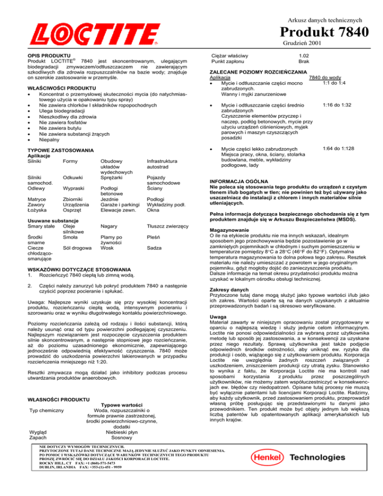 Arkusz danych technicznych Produkt 7840 Grudzień 2001 OPIS PRODUKTU ® 7840 jest skoncentrowanym, ulegającym Produkt LOCTITE biodegradacji zmywaczem/odtłuszczaczem nie zawierającym szkodliwych dla zdrowia rozpuszczalników na bazie wody; znajduje on szerokie zastosowanie w przemyśle. WŁAŚCIWOŚCI PRODUKTU • Koncentrat o przemysłowej skuteczności mycia (do natychmiastowego użycia w opakowaniu typu spray) • Nie zawiera chlorków I składników ropopochodnych • Ulega biodegradacji • Nieszkodliwy dla zdrowia • Nie zawiera fosfatów • Nie zawiera butylu • Nie zawiera substancji żrących • Niepalny TYPOWE ZASTOSOWANIA Aplikacje Silniki Formy Silniki samochod. Odlewy Odkuwki Matryce Zawory Łożyska Zbiorniki Urządzenia Osprzęt Wypraski Usuwane substancje Smary stałe Oleje silnikowe Środki Smoła smarne Sól drogowa Ciecze chłodzącosmarujące Obudowy układów wydechowych Sprężarki Infrastruktura autostrad Pojazdy samochodowe Ściany Podłogi betonowe Jezdnie Garaże i parkingi Elewacje zewn. Podłogi Wykładziny podł. Okna Nagary Tłuszcz zwierzęcy Plamy po żywności Wosk Pleśń Sadza WSKAZÓWKI DOTYCZĄCE STOSOWANIA 1. Rozcieńczyć 7840 ciepłą lub zimną wodą. 2. Ciężar właściwy Punkt zapłonu 1.02 Brak ZALECANE POZIOMY ROZCIEŃCZANIA 7840 do wody Aplikacja 1:1 do 1:4 • Mycie i odtłuszczanie części mocno zabrudzonych. Wanny i myjki zanurzeniowe • Mycie i odtłuszczanie części średnio zabrudzonych Czyszczenie elementów przyczep i naczep, podłóg betonowych, mycie przy użyciu urządzeń ciśnieniowych, myjek parowych i maszyn czyszczących posadzki 1:16 do 1:32 • Mycie części lekko zabrudzonych Miejsca pracy, okna, ściany, stolarka budowlana, meble, wykładziny podłogowe, lady 1:64 do 1:128 INFORMACJA OGÓLNA Nie poleca się stosowania tego produktu do urządzeń z czystym tlenem i/lub bogatych w tlen; nie powinien też być używany jako uszczelniacz do instalacji z chlorem i innych materiałów silnie utleniających. Pełna informacja dotycząca bezpiecznego obchodzenia się z tym produktem znajduje się w Arkuszu Bezpieczeństwa (MSDS). Magazynowanie O ile na etykiecie produktu nie ma innych wskazań, idealnym sposobem jego przechowywania będzie pozostawienie go w zamkniętych pojemnikach w chłodnym i suchym pomieszczeniu w temperaturze pomiędzy 8°C a 28°C (46°F do 82°F). Optymalna temperatura magazynowania to dolna połowa tego zakresu. Resztek materiału nie należy umieszczać z powrotem w jego oryginalnym pojemniku, gdyż mogłoby dojść do zanieczyszczenia produktu. Dalsze informacje na temat okresu przydatności produktu można uzyskać w lokalnym ośrodku obsługi technicznej. , Części należy zanurzyć lub pokryć produktem 7840 a następnie czyścić poprzez pocieranie i spłukać. Uwaga: Najlepsze wyniki uzyskuje się przy wysokiej koncentracji produktu, rozcieńczaniu ciepłą wodą, intensywnym pocieraniu i szorowaniu oraz w wyniku długotrwałego kontaktu powierzchniowego. Poziomy rozcieńczania zależą od rodzaju i ilości substancji, którą należy usunąć oraz od typu powierzchni podlegającej czyszczeniu. Najlepszym rozwiązaniem jest rozpoczęcie czyszczenia produktem silnie skoncentrowanym, a następnie stopniowe jego rozcieńczanie, aż do poziomu uzasadnionego ekonomicznie, zapewniającego jednocześnie odpowiednią efektywność czyszczenia. 7840 może prowadzić do uszkodzenia powierzchni lakierowanych w przypadku rozcieńczenia mniejszego niż 1:20. Resztki zmywacza mogą działać jako inhibitory podczas procesu utwardzania produktów anaerobowych. WŁASNOŚCI PRODUKTU Typ chemiczny Wygląd Zapach Typowe wartości Woda, rozpuszczalniki o formule prawnie zastrzeżonej, środki powierzchniowo-czynne, dodatki Niebieski płyn Sosnowy Zakresy danych Przytoczone tutaj dane mogą służyć jako typowe wartości i/lub jako ich zakres. Wartości oparte są na danych uzyskanych z aktualnie przeprowadzonych badań i są okresowo weryfikowane. Uwaga Materiał zawarty w niniejszym opracowaniu został przygotowany w oparciu o najlepszą wiedzę i służy jedynie celom informacyjnym. Loctite nie ponosi odpowiedzialności za wybraną przez użytkownika metodę lub sposób jej zastosowania, a w konsekwencji za uzyskane przez niego rezultaty. Sprawą użytkownika jest także podjęcie odpowiednich środków ostrożności, aby uniknąć ew. ryzyka dla produkcji i osób, wiążącego się z użytkowaniem produktu. Korporacja Loctite nie uwzględnia żadnych roszczeń związanych z uszkodzeniem, zniszczeniem produkcji czy utratą zysku. Stanowisko to wynika z faktu, że Korporacja Loctite nie ma kontroli nad sposobami korzystania z produktu przez poszczególnych użytkowników, nie możemy zatem współuczestniczyć w konsekwencjach ew. błędów czy niedopatrzeń. Opisane tutaj procesy nie muszą być wyłącznie patentami lub licencjami Korporacji Loctite. Radzimy, aby każdy użytkownik, przed zastosowaniem produktu, przeprowadził własną próbę posługując się przedstawionymi tu danymi jako przewodnikiem. Ten produkt może być objęty jednym lub większą liczbą patentów lub opatentowanych aplikacji amerykańskich lub innych krajów. NIE DOTYCZY WYMOGÓW TECHNICZNYCH. PRZYTOCZONE TUTAJ DANE TECHNICZNE MAJĄ JEDYNIE SŁUŻYĆ JAKO PUNKTY ODNIESIENIA. PO POMOC I WSKAZÓWKI DOTYCZĄCE WARUNKÓW TECHNICZNYCH TEGO PRODUKTU PROSZĘ ZWRÓCIĆ SIĘ DO DZIAŁU JAKOŚCI KORPORACJI LOCTITE. ROCKY HILL, CT FAX: +1 (860)-571-5473 DUBLIN, IRLANDIA FAX: +353-(1)-451 - 9959