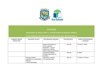 PLAN DZIAŁAŃ REALIZOWANY W ZESPOLE SZKÓŁ im. PIASTÓW ŚLĄSKICH W ŁAZISKACH GÓRNYCH W CELU UBIEGANIA SIĘ O CERTYFIKAT ZIELONEJ FLAGI W ROKU SZKOLNYM 2015/16 WYBRANY OBSZAR TEMATYCZNY ZAŁOZONY CEL/CELE Promocja działań i współpraca ze środowiskiem lokalnym ( stronę odwiedzają ZAPLANOWANE DZIAŁANIA Gazetki informacyjne na temat programu EKOSZKOŁY i naszych działań do certyfikatu Zielona Flaga na korytarzach Prezentacja Kodeksu Ekologicznego Szkoły na korytarzu Informacje na stronie internetowej szkoły CZAS REALIZACJI OSOBY ODPOWIEDZIALNE /FUNKCJA/ Cały rok W. Gasz, Z. Liczba Cały rok A. Malik Cały rok Z. Liczba, G. Fortuna nauczyciele łaziskich szkół, rodzice) Promocja działań, współpraca ze środowiskiem lokalnym Przypomnienie , upowszechnienie znajomości Kodeksu Ekologicznego BIORÓŻNORODNOŚĆ Obserwacja bioróżnorodności Obserwacja bioróżnorodności Poznanie zagadnienia bioróżnorodności, jej znaczenia , zagrożeń i sposobów ochrony Chronimy bioróżnorodność Poznanie zagadnienia bioróżnorodności, Artykuły w prasie lokalnej na temat realizacji programu EKOSZKOŁY Zapoznanie z audytem początkowym szkoły, prezentacja Kodeksu Ekologicznego Szkoły podczas l. wychowawczychpoprzez zabawę w kalambury Wycieczki uczniów umożliwiające poznawanie bioróżnorodności w najbliższej okolicy np. lasu, łąki, pola. Zwrócenie uwagi na obserwację bioróżnorodności zwiedzanej okolicy podczas wycieczek klasowych Uwzględnienie zagadnienia bioróżnorodność i jej zagrożenia podczas lekcji wszystkich przedmiotów Zbiórka kasztanów- paszy dla zwierząt leśnych Udział w konkursach organizowanych przez inne szkoły pogłębiających wiedzę uczniów na temat bioróżnorodności X, VI Z. Liczba, W. Gasz I -II Wychowawcy , przedstawiciele KL w każdej klasie Cały rok Wychowawcy klas I-III SP, nauczyciele przyrody , biologii Cały rok Wychowawcy , Cały rok Nauczyciele przedmiotów X, XI A. Malik Cały rok Z. Liczba Chronimy bioróżnorodność, Uczymy szanować bioróżnorodność poznajemy bioróżnorodność Poznajemy jakie znaczenie ma dla nas bioróżnorodność Chronimy bioróżnorodność, Uczymy szanować bioróżnorodność Święto drzewa X A.Jaroszek , Z. Liczba Spotkanie z organizatorem dogoterapii Zbiórka karmy i przedmiotów dla zwierząt ze Schroniska i kotów dziko żyjących w Łaziskach Górnych Rozprowadzanie kalendarzy, z których dochód jest przeznaczony dla schroniska dla zwierząt Akcja 1% podatku dla zwierząt ze schroniska X K. Walczak, E. Czech Oddział przedszkolny Z. Liczba, R. Adamus, K. Janasik Chronimy bioróżnorodność, Uczymy szanować bioróżnorodność, kształtujemy wrażliwość na sprawy ochrony środowiska Chronimy bioróżnorodność, poznajemy bioróżnorodność Chronimy bioróżnorodność, Uczymy szanować bioróżnorodność Chronimy bioróżnorodność, Uczymy szanować bioróżnorodność poznajemy bioróżnorodność X-II XII J. Tkocz, U. Anderka I P. Kuźnar, J. Korcz, H.Żytkowska Spotkanie z p. Bartecką wolontariuszem ze schroniska dla zwierząt II Z. Liczba Dokarmianie i obserwacja ptaków odwiedzających karmnik na parapecie okiennym Światowy Międzynarodowy Dzień Mokradeł -Gazetka na korytarzu -Wystawa książek o płazach i XII-III A.Malik, K. Walczak, E. Czech 02.II.2016 J. Grońska, K. Cejny A. Waniczek poznajemy bioróżnorodność Uczymy szanować bioróżnorodność, kształtujemy wrażliwość na sprawy ochrony środowiska Obserwujemy bioróżnorodność obserwujemy bioróżnorodność poznajemy bioróżnorodność Chronimy bioróżnorodność współpraca ze środowiskiem lokalnym Chronimy bioróżnorodność poznajemy bioróżnorodność mokradłach bibliotece -Prezentacja głosów żab podczas przerw na korytarzach -Gra „Mokradła” na stronie internetowej www.bagna.pl wykorzystana podczas zajęć świetlicowych Hodowle patyczaków i rybek akwariowych-wzbogacenie i opis gatunków Pokaz gadów egzotycznych dla klas IV- VISP , IIIaG i IIIBG Przesadzanie roślin doniczkowych w klasopracowniach oraz opis okazów Projekt gimnazjalny „ Śląski Ogród Botaniczny” – zielona Arka Śląska” „Nie zabijajcie skowronków”- gazetka na korytarzu na temat wypalania traw wiosną Udział w miejskiej akcji ochrony kasztanowców Międzynarodowy Dzień Ptaków -Gazetka na korytarzu - słuchamy głosów ptaków Z. Liczba, A. Malik J.Szczykutowicz, J.Janikowska Nauczyciele pracujący w świetlicy III M. Krupa, P. Klima W. Czechowska, G. Kucharska IV Z. Liczba E. Kowolik., J. Czechowska Wychowawcy, Przedstawiciele KL w każdej z klas III, IV, V III S. Duda , A. Hajok, M. Smoleniec III D. Stasiorowska V Z. Liczba 01.04.2016 P. Kalisz, P. Wieczorek Z. Liczba, A. Malik poznajemy bioróżnorodność poznajemy bioróżnorodność Uczymy szanować bioróżnorodność, kształtujemy wrażliwość na sprawy ochrony środowiska współpraca ze środowiskiem lokalnym Współpraca z rodzicami podczas przerw na korytarzach - wystawa w bibliotece książek na temat ptaków - prezentacja filmów o ptakach podczas zajęć świetlicowych Gazetki ścienne na temat bioróżnorodności w każdej klasopracowni : Klasy I-III SP: np. lasy , łąki, jeziora i rzeki, pola, morza IV-ssaki V- ryby VI-owady i inne bezkręgowce IG-płazy IIG- gady IIIB- ptaki IIIA – ŚOB Dzień bioróżnorodności: - wręczenie nagród zwycięzcom konkursu „Szkolny ogród jest piękny w różnych porach roku” -konkurs na przebranie za zwierzę chronione w Polsce - prezentacja na temat bioróżnorodności - przedstawienie „ Formy ochrony przyrody” J.Szczykutowicz, J.Janikowska A.Waniczek Nauczyciele pracujący w świetlicy Od 8.05- do końca roku szkolnego Z. Liczba, Wychowawcy, przedstawiciele KL w każdej z klas V Z, Liczba , A.Malik J. Tkocz, U. Anderka, Wychowawcy klas I- III SP M. Rejek A. Malik, Z. Liczba Chronimy bioróżnorodność współpraca ze środowiskiem lokalnym -prezentacja „Bioróżnorodność w n