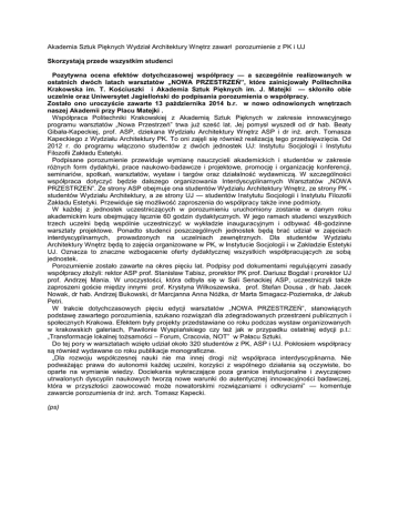 Akademia Sztuk Pięknych Wydział Architektury Wnętrz zawarł porozumienie z PK i UJ Skorzystają przede wszystkim studenci Pozytywna ocena efektów dotychczasowej współpracy — a szczególnie realizowanych w ostatnich dwóch latach warsztatów „NOWA PRZESTRZEŃ”, które zainicjowały Politechnika Krakowska im. T. Kościuszki i Akademia Sztuk Pięknych im. J. Matejki — skłoniło obie uczelnie oraz Uniwersytet Jagielloński do podpisania porozumienia o współpracy. Zostało ono uroczyście zawarte 13 października 2014 b.r. w nowo odnowionych wnętrzach naszej Akademii przy Placu Matejki . Współpraca Politechniki Krakowskiej z Akademią Sztuk Pięknych w zakresie innowacyjnego programu warsztatów „Nowa Przestrzeń” trwa już sześć lat. Jej pomysł wyszedł od dr hab. Beaty Gibała-Kapeckiej, prof. ASP, dziekana Wydziału Architektury Wnętrz ASP i dr inż. arch. Tomasza Kapeckiego z Wydziału Architektury PK. To oni zajęli się również realizacją tego przedsięwzięcia. Od 2012 r. do programu włączono studentów z dwóch jednostek UJ: Instytutu Socjologii i Instytutu Filozofii Zakładu Estetyki. Podpisane porozumienie przewiduje wymianę nauczycieli akademickich i studentów w zakresie różnych form dydaktyki, prace naukowo-badawcze i projektowe, promocję i organizację konferencji, seminariów, spotkań, warsztatów, wystaw i targów oraz działalność wydawniczą. W szczególności współpraca dotyczyć będzie dalszego organizowania Interdyscyplinarnych Warsztatów „NOWA PRZESTRZEŃ”. Ze strony ASP obejmuje ona studentów Wydziału Architektury Wnętrz, ze strony PK studentów Wydziału Architektury, a ze strony UJ — studentów Instytutu Socjologii i Instytutu Filozofii Zakładu Estetyki. Przewiduje się możliwość zaproszenia do współpracy także inne podmioty. W każdej z jednostek uczestniczących w porozumieniu uruchomiony zostanie w danym roku akademickim kurs obejmujący łącznie 60 godzin dydaktycznych. W jego ramach studenci wszystkich trzech uczelni będą wspólnie uczestniczyć w wykładzie inauguracyjnym i odbywać 48-godzinne warsztaty projektowe. Ponadto studenci poszczególnych jednostek będą brać udział w zajęciach interdyscyplinarnych, prowadzonych na uczelniach zewnętrznych. Dla studentów Wydziału Architektury Wnętrz będą to zajęcia organizowane w PK, w Instytucie Socjologii i w Zakładzie Estetyki UJ. Oznacza to znaczne wzbogacenie oferty dydaktycznej wszystkich współpracujących ze sobą jednostek. Porozumienie zostało zawarte na okres pięciu lat. Podpisy pod dokumentami regulującymi zasady współpracy złożyli: rektor ASP prof. Stanisław Tabisz, prorektor PK prof. Dariusz Bogdał i prorektor UJ prof. Andrzej Mania. W uroczystości, która odbyła się w Sali Senackiej ASP, uczestniczyli także zaproszeni goście między innymi prof. Krystyna Wilkoszewska, prof. Stefan Dousa , dr hab. Jacek Nowak, dr hab. Andrzej Bukowski, dr Marcjanna Anna Nóżka, dr Marta Smagacz-Poziemska, dr Jakub Petri. W trakcie dotychczasowych pięciu edycji warsztatów „NOWA PRZESTRZEŃ”, stanowiących podstawę zawartego porozumienia, szukano rozwiązań dla zdegradowanych przestrzeni publicznych i społecznych Krakowa. Efektem były projekty przedstawiane co roku podczas wystaw organizowanych w krakowskich galeriach, Pawilonie Wyspiańskiego czy też jak w przypadku ostatniej edycji p.t.: „Transformacje lokalnej tożsamości – Forum, Cracovia, NOT” w Pałacu Sztuki. Do tej pory w warsztatach wzięło udział około 320 studentów z PK, ASP i UJ. Pokłosiem współpracy są również wydawane co roku publikacje monograficzne. „Dla rozwoju współczesnej nauki nie ma innej drogi niż współpraca interdyscyplinarna. Nie podważając prawa do autonomii każdej uczelni, korzyści z wspólnego działania są oczywiste, bo oparte na wymianie wiedzy. Dociekania wykraczające poza granice instytucjonalne i zwyczajowo utrwalonych dyscyplin naukowych tworzą nowe warunki do autentycznej innowacyjności badawczej, która w przyszłości zaowocować może nowatorskimi rozwiązaniami i odkryciami” — komentuje zawarcie porozumienia dr inż. arch. Tomasz Kapecki. (ps)