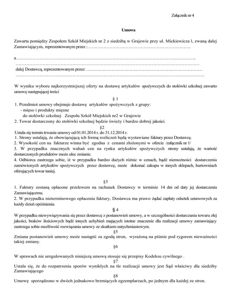 Załącznik nr 4 Umowa Zawarta pomiędzy Zespołem Szkół Miejskich nr 2 z siedzibą w Grajewie przy ul. Mickiewicza l, zwaną dalej Zamawiającym, reprezentowanym przez :……………………………………………………………. a………………………………………………………………………………………………………….. …………………………………………………………………………………………………………… dalej Dostawcą, reprezentowanym przez: …………………………………………………………………… ………………………………………………………………………………………………………………. W wyniku wyboru najkorzystniejszej oferty na dostawę artykułów spożywczych do stołówki szkolnej zawarto umowę następującej treści §1 1. Przedmiot umowy obejmuje dostawę artykułów spożywczych z grupy: - mięso i produkty mięsne do stołówki szkolnej Zespołu Szkół Miejskich nr2 w Grajewie 2. Towar dostarczony do stołówki szkolnej będzie świeży i bardzo dobrej jakości. §2 Ustala się termin trwania umowy od 01.01.2014 r. do 31.12.2014 r. 1. Strony ustalają, że obowiązującą ich formą rozliczeń będą wystawiane faktury przez Dostawcę. 2. Wysokość cen na fakturze winna być zgodna z cenami złożonymi w ofercie /załącznik nr 1/ 3. W przypadku znacznych wahań cen na rynku artykułów spożywczych strony ustalają, że wartość dostarczonych produktów może ulec zmianie. 4. Odbiorca zastrzega sobie, iż w przypadku bardzo dużych różnic w cenach, bądź niemożności dostarczenia zamówionych artykułów spożywczych przez dostawcę, może dokonać zakupu w innych sklepach, hurtowniach oferujących towar taniej. §3 1. Faktury zostaną opłacone przelewem na rachunek Dostawcy w terminie 14 dni od daty jej dostarczenia Zamawiającemu. 2. W przypadku nieterminowego opłacenia faktury, Dostawca ma prawo żądać zapłaty odsetek ustawowych za każdy dzień opóźnienia. §4 W przypadku niewywiązywania się przez dostawcę z postanowień umowy, a w szczególności dostarczania towaru złej jakości, braków ilościowych bądź innych uchybień mających istotne znaczenie dla realizacji umowy zamawiający zastrzega sobie możliwość rozwiązania umowy ze skutkiem natychmiastowym. §5 Zmiana postanowień umowy może nastąpić za zgodą stron, wyrażoną na piśmie pod rygorem nieważności takiej zmiany. §6 W sprawach nie uregulowanych niniejszą umową stosuje się przepisy Kodeksu cywilnego . §7 Ustala się, że do rozpatrzenia sporów wynikłych na tle realizacji umowy jest Sąd właściwy dla siedziby Zamawiającego §8 Umowę sporządzono w dwóch jednakowo brzmiących egzemplarzach, po jednym dla każdej ze stron. Zamawiający : Dostawca :