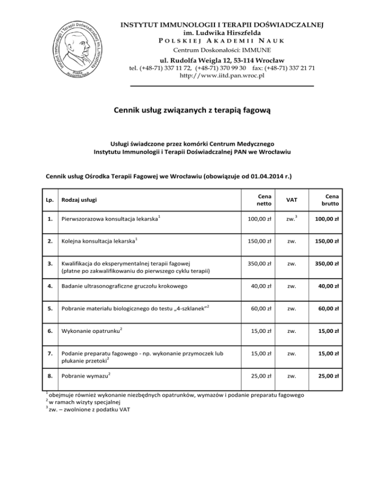 cenników - Instytut Immunologii i Terapii Doświadczalnej PAN