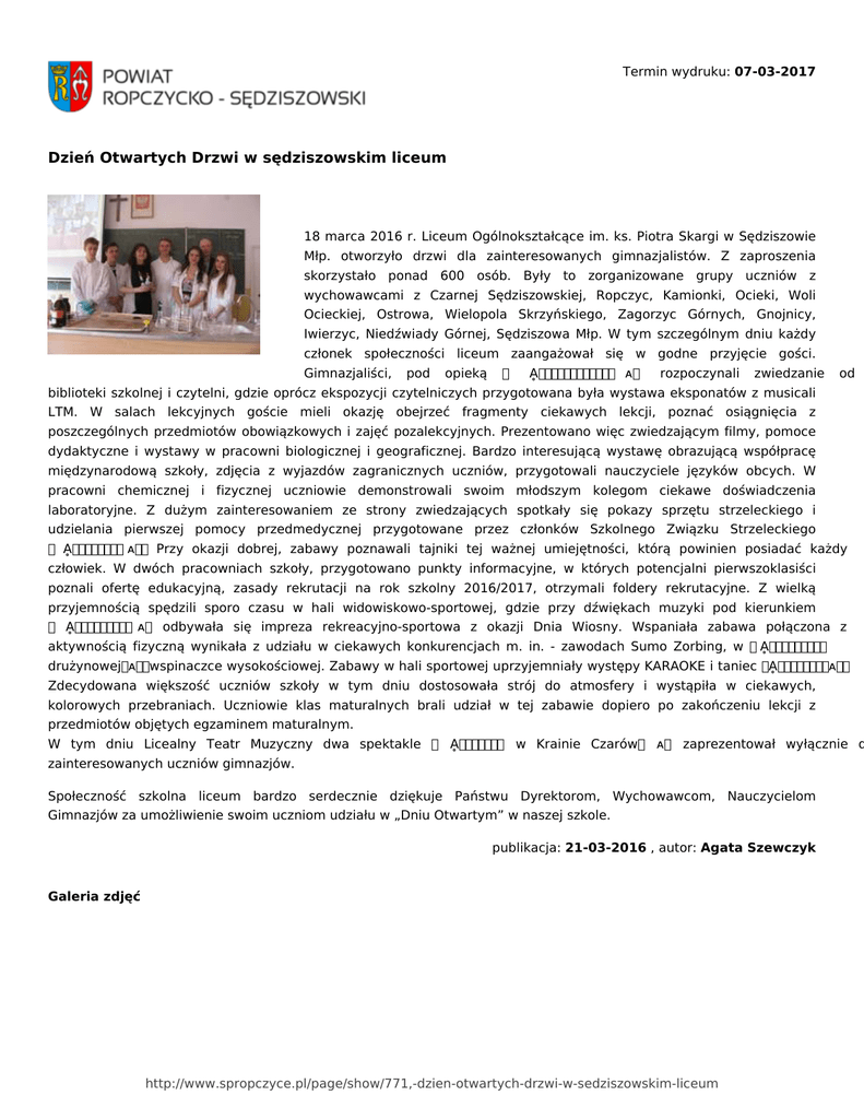 Termin wydruku: 07-03-2017 Dzień Otwartych Drzwi w sędziszowskim liceum 18 marca 2016 r. Liceum Ogólnokształcące im. ks. Piotra Skargi w Sędziszowie Młp. otworzyło drzwi dla zainteresowanych gimnazjalistów. Z zaproszenia skorzystało ponad 600 osób. Były to zorganizowane grupy uczniów z wychowawcami z Czarnej Sędziszowskiej, Ropczyc, Kamionki, Ocieki, Woli Ocieckiej, Ostrowa, Wielopola Skrzyńskiego, Zagorzyc Górnych, Gnojnicy, Iwierzyc, Niedźwiady Górnej, Sędziszowa Młp. W tym szczególnym dniu każdy członek społeczności liceum zaangażował się w godne przyjęcie gości. Gimnazjaliści, pod opieką Ḁ瀀爀稀攀眀漀搀渀椀欀眠 ᴀ rozpoczynali zwiedzanie od biblioteki szkolnej i czytelni, gdzie oprócz ekspozycji czytelniczych przygotowana była wystawa eksponatów z musicali LTM. W salach lekcyjnych goście mieli okazję obejrzeć fragmenty ciekawych lekcji, poznać osiągnięcia z poszczególnych przedmiotów obowiązkowych i zajęć pozalekcyjnych. Prezentowano więc zwiedzającym filmy, pomoce dydaktyczne i wystawy w pracowni biologicznej i geograficznej. Bardzo interesującą wystawę obrazującą współpracę międzynarodową szkoły, zdjęcia z wyjazdów zagranicznych uczniów, przygotowali nauczyciele języków obcych. W pracowni chemicznej i fizycznej uczniowie demonstrowali swoim młodszym kolegom ciekawe doświadczenia laboratoryjne. Z dużym zainteresowaniem ze strony zwiedzających spotkały się pokazy sprzętu strzeleckiego i udzielania pierwszej pomocy przedmedycznej przygotowane przez członków Szkolnego Związku Strzeleckiego Ḁ匀琀爀稀攀氀攀挠 ᴀ⸀ Przy okazji dobrej, zabawy poznawali tajniki tej ważnej umiejętności, którą powinien posiadać każdy człowiek. W dwóch pracowniach szkoły, przygotowano punkty informacyjne, w których potencjalni pierwszoklasiści poznali ofertę edukacyjną, zasady rekrutacji na rok szkolny 2016/2017, otrzymali foldery rekrutacyjne. Z wielką przyjemnością spędzili sporo czasu w hali widowiskowo-sportowej, gdzie przy dźwiękach muzyki pod kierunkiem Ḁ眀漀搀稀椀爀攀樀愠 ᴀ odbywała się impreza rekreacyjno-sportowa z okazji Dnia Wiosny. Wspaniała zabawa połączona z aktywnością fizyczną wynikała z udziału w ciekawych konkurencjach m. in. - zawodach Sumo Zorbing, w Ḁ猀欀愀欀愀渀挀攀 drużynowej ᴀⰀ wspinaczce wysokościowej. Zabawy w hali sportowej uprzyjemniały występy KARAOKE i taniec Ḁ䈀攀氀最椀樀欀愠ᴀ⸀ Zdecydowana większość uczniów szkoły w tym dniu dostosowała strój do atmosfery i wystąpiła w ciekawych, kolorowych przebraniach. Uczniowie klas maturalnych brali udział w tej zabawie dopiero po zakończeniu lekcji z przedmiotów objętych egzaminem maturalnym. W tym dniu Licealny Teatr Muzyczny dwa spektakle Ḁ䄀氀椀挀樀愀 w Krainie Czarów ᴀ zaprezentował wyłącznie d zainteresowanych uczniów gimnazjów. Społeczność szkolna liceum bardzo serdecznie dziękuje Państwu Dyrektorom, Wychowawcom, Nauczycielom Gimnazjów za umożliwienie swoim uczniom udziału w „Dniu Otwartym” w naszej szkole. publikacja: 21-03-2016 , autor: Agata Szewczyk Galeria zdjęć http://www.spropczyce.pl/page/show/771,-dzien-otwartych-drzwi-w-sedziszowskim-liceum http://www.spropczyce.pl/page/show/771,-dzien-otwartych-drzwi-w-sedziszowskim-liceum