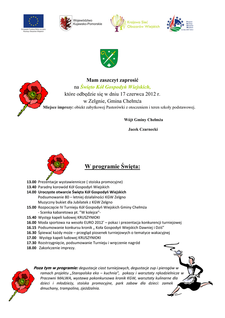 Mam zaszczyt zaprosić na Święto Kół Gospodyń Wiejskich, które odbędzie się w dniu 17 czerwca 2012 r. w Zelgnie, Gmina Chełmża Miejsce imprezy: obiekt zabytkowej Pastorówki z otoczeniem i teren szkoły podstawowej. Wójt Gminy Chełmża Jacek Czarnecki W programie Święta: 13.00 Prezentacje wystawiennicze ( stoiska promocyjne) 13.40 Paradny korowód Kół Gospodyń Wiejskich 14.00 Uroczyste otwarcie Święta Kół Gospodyń Wiejskich Podsumowanie 80 – letniej działalności KGW Zelgno Muzyczny bukiet dla Jubilatek z KGW Zelgno 15.00 Rozpoczęcie IV Turnieju Kół Gospodyń Wiejskich Gminy Chełmża - Scenka kabaretowa pt. ”W kolejce”15.40 Występ kapeli ludowej KRUSZYNIOKI 16.00 Moda sportowa na wesoło EURO 2012’ – pokaz i prezentacja konkurencji turniejowej 16.15 Podsumowanie konkursu kronik „ Koła Gospodyń Wiejskich Dawniej i Dziś” 16.30 Śpiewać każdy może – przegląd piosenek turniejowych o tematyce wakacyjnej 17.00 Występ kapeli ludowej KRUSZYNIOKI 17.30 Rozstrzygnięcie, podsumowanie Turnieju i wręczenie nagród 18.00 Zakończenie imprezy. Poza tym w programie: degustacje ciast turniejowych, degustacje zup i pierogów w ramach projektu „Staropolska eko – kuchnia”, pokazy i warsztaty rękodzielnicze w Pracowni MALWA, wystawa pokonkursowa kronik KGW, warsztaty kulinarne dla dzieci i młodzieży, stoiska promocyjne, park zabaw dla dzieci: zamek dmuchany, trampolina, zjeżdżalnia.