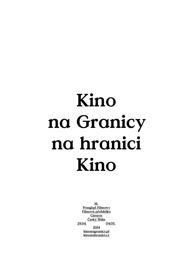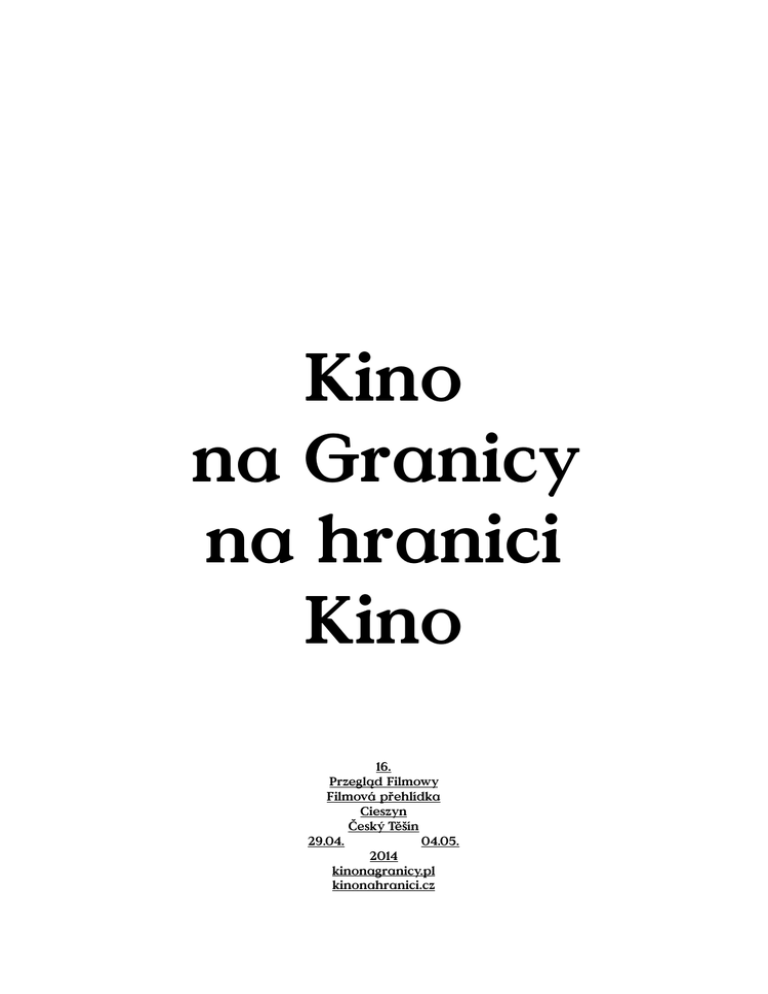Kino na Granicy na hranici Kino 16. Przegląd Filmowy Filmová přehlídka Cieszyn Český Těšín 29.04. 04.05. 2014 kinonagranicy.pl kinonahranici.cz Drodzy Widzowie! 16. Przegląd Filmowy Kino na Granicy 16. Filmová přehlídka Kino na hranici www.kinonagranicy.pl www.kinonahranici.cz wydawcy vydavatelé Stowarzyszenie Kultura na Granicy Szymanowskiego 5/9 43-400 Cieszyn www.kinonagranicy.pl Občanské sdružení EducationTalentCulture Hlavní třída 1a/147 737 01 Český Těšín www.edutacu.eu redaktor Maciej Gil współpraca spolupráce Katarzyna Płachta tłumaczenia překlady Magdalena Domaradzka Natálie Raclavská Izabela Zając korekta korektura Gabriela Gańczarczyk Maciej Gil Tereza Italová projekt graficzny i skład s láskou graficky při/upravili Sacrish Blessinskij Viktor Hnátek František Talíř Roman Tyčka Bohdan Heblík druk tisk fulloutdoorprintservice ISBN 978-83-932940-3-9 A zatem 16. edycja! Pamiętacie jeszcze 15.? My pamiętamy już jak przez mgłę. A w dodatku przypomniano nam jeszcze 14., gdy we wrześniu zeszłego roku odbieraliśmy Nagrodę Polskiego Instytutu Sztuki Filmowej dla najlepszego Międzynarodowego wydarzenia filmowego 2012 roku. Takie wyróżnienie uskrzydla, cieszy, daje satysfakcję i zapewne dodaje splendoru. Ale czy jakoś wpływa na organizację i kształt kolejnej edycji? Nie bardzo. Wciąż ten sam wysiłek podczas długich przygotowań i ta sama radość, że znów spotykamy się z Wami nad Olzą! W tym roku zapraszamy na przegląd dorobku filmowego i wystawę fotografii słowackiego klasyka Dušana Hanáka. Wypadki za wschodnią granicą spowodowały, że postanowiliśmy przyjrzeć się współczesnemu kinu ukraińskiemu. Oglądając te filmy, myślmy o niepewnym losie Ukrainy. Mamy tam wielu przyjaciół. Na część programu wielki wpływ miał 2014 rok, a właściwie 100. rocznica roku 1914, w którym świat wokół zaczął się gwałtownie zmieniać. To symboliczna data końca XIX i początku XX wieku. Wtedy rozpoczęła się Wielka Wojna (z czasem nazwana I światową), wtedy też Franz Kafka rozpoczął pisanie „Procesu”, a Jaroslav Hašek wyruszył na front, skąd przywiózł inspirację dla „Przygód dobrego wojaka Szwejka podczas wojny światowej”. Wojennym wydarzeniom i twórczości (ale i biografiom) tych wielkich pisarzy poświęciliśmy cykle filmowe. Także nasze ukochane miasto po raz kolejny dostarczyło inspiracji. W Cieszynie urodził się znakomity operator Kurt Weber. Przypomnimy filmy, które zrealizował wspólnie z Januszem Majewskim, skądinąd najlepszym portrecistą Wielkiej Wojny w polskim kinie. (Wypada tu też przypomnieć, że z Cieszynem związany był – i tu jest pochowany – Paweł HulkaLaskowski, autor pierwszego i najpopularniejszego przekładu arcydzieła Haška na język polski). Wiosna w tym roku przyszła nad wyraz wcześnie, więc na spacer szlakiem kwitnących magnolii już nie mamy co liczyć. Liczmy więc na letnią pogodę, byśmy nie marzli podczas plenerowych projekcji i w festiwalowym klubie. Dziękujemy, że znów nam zaufaliście i przyjechaliście! Witajcie w Cieszynie! Organizatorzy Drazí diváci! Je tady 16. ročník! Pamatujete si ještě ten 15.? My si ho pamatujeme už jen mlhavě. A navíc jsme si připomněli ještě 14. ročník –v říjnu minulého roku jsme získali ocenění Polského institutu filmového umění za nejlepší mezinárodní filmovou událost roku 2012. Takové ocenění potěší, dodá sebevědomí, díky takovým oceněním rostou křídla. Ale ovlivní nějak organizaci a formu dalších ročníků? Ani ne. Znovu stejné úsilí během dlouhé přípravy a stejná radost, že se s Vámi opět můžeme u Olše setkat! V tomto roce Vás zveme na přehlídku kinematografického díla a výstavu fotografií slovenského klasika Dušana Hanáka. Události na Východě nás vedly k tomu, že jsme se rozhodli zaměřit na současný ukrajinský film. Při sledování těchto filmů se zamysleme nad nejistým osudem Ukrajiny. Máme tam mnoho přátel. Na část programu měl značný vliv rok 2014, tedy 100. výročí roku 1914, ve kterém se svět začal prudce měnit. Jedná se o symbolický konec 19. a začátek 20. století. Tehdy vypukla první světová válka (známá také jako velká válka), Franz Kafka začal psát svůj „Proces“ a Jaroslav Hašek vyrazil na frontu, ze které si přinesl inspiraci pro napsání „Osudů dobrého vojáka Švejka za světové války“. Válečným událostem, ale i tvorbě a biografii těchto dvou velkých spisovatelů, jsme věnovali filmové cykly. Také naše milované město nás, jako již mnohokrát, inspirovalo. V Těšíně se narodil významný kameraman Kurt Weber. Připomeneme si filmy, které natočil společně s Januszem Majewským, mimochodem nejlepším portrétistou první světové války v polské kinematografii. (Musíme na tomto místě také připomenout, že s Těšínem byl spojen – a na zdejším hřbitově je pochovaný – i Paweł Hulka-Laskowski – autor prvního a nejoblíbenějšího překladu Haškova veledíla do polštiny). Jaro v tomto roce přišlo velice brzy, proto je už na procházku pod kvetoucími magnoliemi trochu pozdě. Přejme si tedy letní počasí, abychom při venkovních projekcích a ve festivalovém klubu nemrzli. Děkujeme, že jste nám opět projevili důvěru a přijeli jste! Vítejte v Těšíně! Organizátoři sztab štáb dyrektor ředitelka Jolanta Dygoś dyrektorzy programowi programoví ředitelé Maciej Gil Martin Novosad dyrektor finansowy finanční ředitelka Petra Slováček Rypienová kopie filmowe filmové kopie Piotr Kumor Milada Ślusarczyková transport Krzysztof Howikowicz wystawy i dekoracje výstavy a výzdoba Bogusław Dziadzia Veronika Křístková Magdalena Szadkowska strona www webové stránky Przemysław Kurzacz koordynatorzy koordinátoři Jakub Gajdica Anna Gańczarczyk Dominika Miklošíková dokumentacja fo