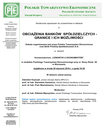 POLSKIE TOWARZYSTWO EKONOMICZNE POLISH ECONOMIC SOCIETY Zarząd Krajowy Prezes ELŻBIETA MĄCZYŃSKA Wiceprezesi BOGUSŁAW FIEDOR BOGDAN ŚLUSARZ Sekretarz Generalny BEATA MAJECKA Członkowie Prezydium ELŻBIETA CHABOWSKA BOGUSŁAWA DRELICH-SKULSKA RYSZARD KAMIŃSKI JAROSŁAW MARCZAK ALEKSANDER PANASIUK ANDRZEJ PRUSEK ANDRZEJ SZPLIT ORGANIZACJA POŻYTKU PUBLICZNEGO Serdecznie zapraszam do uczestnictwa w debacie pt. OBCIĄŻENIA BANKÓW SPÓŁDZIELCZYCH GRANICE I ICH MOŻLIWOŚCI Debata organizowana jest przez Polskie Towarzystwo Ekonomiczne oraz Bank Polskiej Spółdzielczości S.A. w ramach Konwersatorium „CZWARTKI U EKONOMISTÓW” w siedzibie Polskiego Towarzystwa Ekonomicznego przy ul. Nowy Świat 49 w Warszawie, wyjątkowo w środę 20 stycznia 2016 r. o godz.16:30 W debacie udział wezmą: Zdzisław Kupczyk, prezes Zarządu Banku BPS S.A. prof. dr hab. Stanisław Kasiewicz, Szkoła Główna Handlowa w Warszawie prof. dr hab. Piotr Masiukiewicz, Szkoła Główna Handlowa w Warszawie Moderator: prof. dr hab. Elżbieta Mączyńska, prezes Polskiego Towarzystwa Ekonomicznego ul. Nowy Świat 49 00-042 Warszawa tel.: (48) 22 551 54 01, 551 54 05 fax: (48) 22 551 54 44 Debata będzie transmitowana online, rejestrowana elektronicznie i publikowana. Zapisy stenograficzne zamieszczone zostaną na stronie internetowej PTE (http:/www.pte.pl/konferencje). e-mail: [email protected] www.pte.pl Prezes PTE Konto/Bank a/c Millennium Elżbieta Mączyńska 38116022020000000060847735 KRS 0000099464 REGON 007022016 NIP 526-03-00-196 Instrukcja dla uczestników spotkań online organizowanych przez Polskie Towarzystwo Ekonomiczne 1. Uczestnictwo w transmisji online wymaga dostępu do komputera oraz łącza internetowego. 2. Z transmisją wydarzenia łączymy się za pomocą adresu WWW: https://pte.clickwebinar.com/debata 3. Transmisja rozpocznie się na 20 min. przed właściwym spotkaniem. 4. Po otworzeniu linku proszę postępować według poniższej instrukcji: 5. Program przed odtworzeniem transmisji sprawdzi aktualność Państwa oprogramowania. W zależności od wyniku, może powstać potrzeba aktualizacji wybranych komponentów (testowanie można przeprowadzić w każdym momencie, nawet gdy spotkanie nie jest jeszcze rozpoczęte). 6. Po wejściu do pokoju transmisji powinien pokazać się zbliżony ekran: 7. W przypadku problemów z połączeniem, proszę o kontakt na adres mailowy: [email protected]