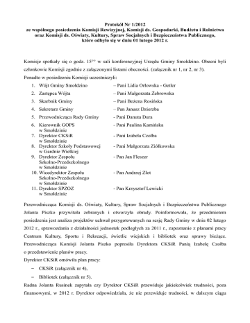 Protokół Nr 1/2012 ze wspólnego posiedzenia Komisji Rewizyjnej, Komisji ds. Gospodarki, Budżetu i Rolnictwa oraz Komisji ds. Oświaty, Kultury, Spraw Socjalnych i Bezpieczeństwa Publicznego, które odbyło się w dniu 01 lutego 2012 r. Komisje spotkały się o godz. 15°° w sali konferencyjnej Urzędu Gminy Smołdzino. Obecni byli członkowie Komisji zgodnie z załączonymi listami obecności. (załącznik nr 1, nr 2, nr 3). Ponadto w posiedzeniu Komisji uczestniczyli: 1. Wójt Gminy Smołdzino – Pani Lidia Orłowska - Getler 2. Zastępca Wójta – Pani Małgorzata Żebrowska 3. Skarbnik Gminy – Pani Bożena Rosińska 4. Sekretarz Gminy – Pan Janusz Dzierzba 5. Przewodnicząca Rady Gminy - Pani Danuta Dura 6. Kierownik GOPS w Smołdzinie 7. Dyrektor CKSiR w Smołdzinie 8. Dyrektor Szkoły Podstawowej w Gardnie Wielkiej 9. Dyrektor Zespołu Szkolno-Przedszkolnego w Smołdzinie 10. Wicedyrektor Zespołu Szkolno-Przedszkolnego w Smołdzinie 11. Dyrektor SPZOZ w Smołdzinie - Pani Paulina Kamińska - Pani Izabela Czołba - Pani Małgorzata Ziółkowska - Pan Jan Fleszer - Pan Andrzej Zlot - Pan Krzysztof Lewicki Przewodnicząca Komisji ds. Oświaty, Kultury, Spraw Socjalnych i Bezpieczeństwa Publicznego Jolanta Piszko przywitała zebranych i otworzyła obrady. Poinformowała, że przedmiotem posiedzenia jest analiza projektów uchwał przygotowanych na sesję Rady Gminy w dniu 02 lutego 2012 r., sprawozdania z działalności jednostek podległych za 2011 r., zapoznanie z planami pracy Centrum Kultury, Sportu i Rekreacji, świetlic wiejskich i bibliotek oraz sprawy bieżące. Przewodnicząca Komisji Jolanta Piszko poprosiła Dyrektora CKSiR Panią Izabelę Czołba o przedstawienie planów pracy. Dyrektor CKSiR omówiła plan pracy: – CKSiR (załącznik nr 4), – Bibliotek (załącznik nr 5). Radna Jolanta Rusinek zapytała czy Dyrektor CKSiR przewiduje jakiekolwiek trudności, poza finansowymi, w 2012 r. Dyrektor odpowiedziała, że nie przewiduje trudności, w dalszym ciągu będzie aplikowała o fundusze unijne. Poinformowała, że już w marcu br. będzie składała dokumenty o pozyskanie pieniędzy. Radna Jolanta Rusinek poprosiła o więcej informacji na temat świetlic. Dyrektor CKSiR powiedziała, że zastanawia się czy nie ograniczyć funkcjonowania świetlic w okresie zimowym tylko do 2 dni (piątek, sobota), ponieważ otrzymywała sygnały od mieszkańców, że lepiej gdyby świetlice były czynne przez większą ilość godzin, ale w dni kiedy młodzież może przyjść, czyli dni wolne. Dodała, że świetlice byłyby czynne w godzinach popołudniowych. Przewodnicząca Komisji Jolanta Piszko zapytała czy Pani Dyrektor myślała o tym, aby CKSiR było również czynne w soboty. Dyrektor odpowiedziała, że ma przewidzianą pracę w soboty, ale od maja do września. Powiedziała, że słyszała o tym, że mieszkańcy chcą, aby Centrum było czynne w soboty, ale kiedy pracowała w soboty w miesiącu czerwcu to widziała, że przychodziły tylko 2-3 osoby, a czasami tylko turyści. Radny Ryszard Romanowski zapytał czy jest ułożony plan zajęć dla młodzieży na okres ferii zimowych. Dyrektor odpowiedziała, że taki plan został ułożony. Radny Ryszard Romanowski powiedział, że lepiej byłoby gdyby świetlice w okresie ferii były otwarte od rana, a nie dopiero w godzinach popołudniowych, żeby młodzież mogła już rano iść do świetlicy. Dyrektor powiedziała, że jeżeli jest taka potrzeba to oczywiście świetlice będą czynne od rana. Następnie Przewodnicząca Komisji Jolanta Piszko poprosiła zaproszonych gości o przedstawienie sprawozdań z działalności ich jednostek za 2011 r. Jako pierwsza głos zabrała Kierownik GOPS Pani Paulina Kamińska. Przedstawiła sprawozdanie z działalności GOPS za 2011 r. (załącznik nr 6). Radny Adam Koszutowski zapytał ilu jest pracowników socjalnych w GOPS. Kierownik odpowiedziała, że zgodnie z ustawą jest minimalna liczba, czyli 3. Ustawa nakazuje, aby na 2000 mieszkańców było nie mniej niż 3 pracowników socjalnych. Poinformowała, że jeden pracownik jest w 100% finansowany z pieniędzy unijnych. Następnie sprawozdanie z działalności jednostki za 2011 r. przedstawił Dyrektor Zespołu Szkolno – Przedszkolnego Pan Jan Fleszer (załącznik nr 7). Wicedyrektor Zespołu Szkolno - Przedszkolnego Pan Andrzej Zlot poinformował, że w szkole od 2 lat, w miesiącu sierpniu, jest prowadzony cykl edukacyjny ,,Przyroda na dotyk” we współpracy ze Słowińskim Parkiem Narodowym. Dzięki temu młodzież spaceruje po parku ucząc się przyrody ,,dotykając jej”. Następnie uczą się pisać sprawozdania z takiej wyprawy, robią fotoreportaże, a także prezentacje multimedialne. Kolejne sprawozdanie przedstawiła Dyrektor Szkoły Podstawowej w Gardnie Wielkiej Pani Małgorzata Ziółkowska (załącznik nr 8). Następnie sprawozdanie z działalności jednostki podległej za 2011 r. omówił Dyrektor SPZOZ Pan Krzysztof Lewicki (załącznik nr 9). Ostatnie sprawozdanie przedstawiła dyrektor CKSiR Pani Izabela Czołba (załącznik nr 10). Po omówieniu sprawozdania Wójt Gminy Pani Lidia Orłowska – Getler zaproponowała, aby impreza pn. Dzień bibliotek, która odbyła się w 2011 r. została zamieniona na imprezę pn. Noc muzeów, która odbywa się co roku w maju. Dodała, że na terenie gminy Smołdzino są 2 muzea i warto taką imprezę wprowadzić do stałego kalendarza Centrum. Radna Jolanta Rusinek zapytała jakie zajęcia, w każdy dzień tygodnia, proponuje Centrum dla osób w średnim wieku. Dyrektor odpowiedziała, że w ofercie jest język angielski i zajęcia fitness. Radna Jolanta Rusinek zapytała jakie zajęcia prowadzone są w miejscowości Gardna Wielka. Dyrektor odpowiedziała, że zajęcia fitness również mogłyby być prowadzone w Gardnie Wielkiej, ale nie ma takiej możliwości ze względu na brak odpowiedniej sali do tego typu ćwiczeń. Radna Jolanta Rusinek zapytała czy 