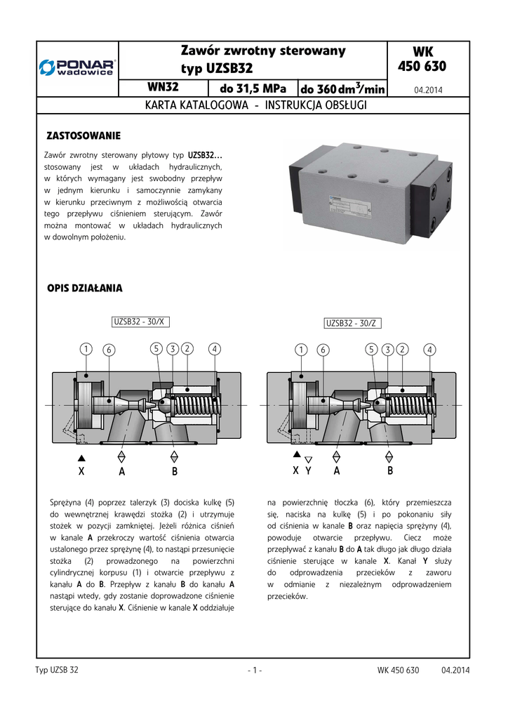 Zawór zwrotny sterowany typ UZSB32 WK 450 630 WN32 do 31,5 MPa do 360 dm3/min KART ARTA KATALOGOWA - INSTRUK RUKCJA OBS OBSŁUGI 04.2014 ZASTOSOWANIE Zawór zwrotny sterowany płytowy typ UZSB32… UZSB32… stosowany jest w układach hydraulicznych, w których wymagany jest swobodny przepływ w jednym kierunku i samoczynnie zamykany w kierunku przeciwnym z możliwością otwarcia tego przepływu ciśnieniem sterującym. Zawór można montować w układach hydraulicznych w dowolnym położeniu. OPIS DZIAŁANIA UZSB32 - 30/X 1 X 5 6 A UZSB32 - 30/Z 3 2 4 1 X Y B Sprężyna (4) poprzez talerzyk (3) dociska kulkę (5) do wewnętrznej krawędzi stożka (2) i utrzymuje stożek w pozycji zamkniętej. Jeżeli różnica ciśnień w kanale A przekroczy wartość ciśnienia otwarcia ustalonego przez sprężynę (4), to nastąpi przesunięcie stożka (2) prowadzonego na powierzchni cylindrycznej korpusu (1) i otwarcie przepływu z kanału A do B. Przepływ z kanału B do kanału A nastąpi wtedy, gdy zostanie doprowadzone ciśnienie sterujące do kanału X. Ciśnienie w kanale X oddziałuje Typ UZSB 32 5 6 A 3 2 4 B na powierzchnię tłoczka (6), który przemieszcza się, naciska na kulkę (5) i po pokonaniu siły od ciśnienia w kanale B oraz napięcia sprężyny (4), powoduje otwarcie przepływu. Ciecz może przepływać z kanału B do A tak długo jak długo działa ciśnienie sterujące w kanale X. Kanał Y służy do odprowadzenia przecieków z zaworu w odmianie z niezależnym odprowadzeniem przecieków. -1- WK 450 630 04.2014 DANE TECHNICZNE Ciecz hydrauliczna olej mineralny Wymag Wymaga agana klasa czyst c zysto zyst ości oleju lej u Lepkość nominalna cieczy I S O 4 4 0 6 k l a s a 2 0 / 1 8 /1 5 37 mm2 /s w temperaturze 55 o C Zakres lepkości 2,8 do 380 mm 2/s zalecany Zakres temperatury cieczy (w zbiorniku) max - 20 oC do +70 oC Zakres temperatury otoczenia Max ciś ci śnien ienie pracy pr acy Ciśnienie max. sterowania 31,5 1, 5 MPa Ciśnienie otwarcia zaworu zwrotnego 0,05 MPa Masa 10 kg 40 oC do + 55oC -20 oC do +70 oC 31,5 MPa Powierzc ierzch zchnia oddz odd ziaływ ływania ci c iśnien ienia Wersja zaworu F1 [cm 2 ] F2 [cm 2 ] F3 [cm 2 ] F4 [cm 2 ] C [MPa] UZSB 20...X... 7,06 1,51 18,87 - 0,022 UZSB 20...Z... 7,06 1,51 18,87 3,14 0,022 F - powierzchnia wyznaczona średnicą uszczelniającą stożka (2) 1 F2 - powierzchnia wyznaczona średnicą kulki (5) pomocniczego zaworu zwrotnego F3- powierzchnia oddziaływania ciśnienia sterującego na tłoczek (6) F4 - powierzchnia tłoczyska tłoczka (6) odwrotna powierzchni F 3 C - ciśnienie działające na powierzchnię F3 potrzebne do pokonania siły sprężyny (4) WYMAGANIA MONTAŻU I EKSPLOATACJI 1. Podczas eksploatacji należy utrzymać zalecaną w kontaktu z nim podczas podczas eksploatacji lub należy niniejszej Karcie Katalogowej - Instrukcji Obsługi przewidzieć odpowiednie osłony zgodnie z lepkość cieczy roboczej. wymaganiami norm europejskich: roboczej europejskich PNPN-EN ISO 1373213732-1 2. Aby zapewnić bezawaryjną i bezpieczną pracę zaworu i PNPN-EN 982 należy systematycznie sprawdzać: sprawdzać 4. Dla zapewnienia szczelności bloku zaworu należy • działanie zaworu przestrzegać wymiarów pierścieni uszczelniających, uszczelniających, • czystość cieczy hydraulicznej momentów dokręcenia śrub śrub mocujących i parametrów 3. Ze względu na możliwość nagrzewania się oraz pracy zaworu podanych w niniejszej Karcie Katalogowej przekroczenie dopuszczalnych, ustalonych temperatur - Instrukcji Obsługi powierzchniowych, zawór powinien być umiejscowiony 5. Obsługujący zawór musi być zapoznany z treścią tak, niniejszej Karty Katalogowej - Instrukcji Obsługi. tak aby wyeliminować możliwość przypadkowego Obsługi WK 450 630 04.2014 -2- Typ UZSB 32 SCHEMATY Symbol graficzny zaworu typ UZSB 32... 3 2... B B A Y X A X wersja UZSB32...Z... wersja UZSB32...X... WYMIARY GABARYTOWE I PRZYŁĄCZENIOWE 75 O 1 X 6 16,7 Ø 32 (max) 2 otw. (A A, B) 24,6 42,1 59,5 62,7 67,5 84,1 155 (min) Ø11 - 6 otw. r 120 B 96,8 Y* A B 4 2 A 3,8 48,4 Y 3 92,9 96,8 120 (min) Ø6 -2 otw. (X X, Y) M10 gł. 25 - 6 otw. Ø7 gł. 6 0,01/100 mm 0,63 4 X 25 32 Typ UZSB 32 84,1 195 1 - Pierścień uszcz. o-ri -ring 36 x 3 - 2 szt/kpl (A, B) 2 - Pierścień uszcz. o-r o -ri -ring 8,3 8, 3 x 2,4 2,4 1 szt/kpl (X) dla wersji UZSB 32.../X... 2 szt/kpl (X, Y) dla wersji UZSB 32.../Z... 3 - Konfiguracja otworów powierzchni płyty przyłączeniowej zgodna normami: • C E T O P - R P 1 21 H • PNPN -ISO 5781 śruby mocujące M10 x 90 -10.9 0. 9 wg PN -E - E N I S O 4 76 2 (PN/M-82302) - szt. 6 /kpl moment dokręcenia Md = 73 Nm . 4 - Wymagany stan powierzchni płyty przyłączeniowej Uwaga: aga: (*) - kanał Y występuje tylko w wersji UZSB32.../Z... -3- WK 450 630 04.2014 CHARAKTERYSTYKI o dla lepkości cieczy hydraulicznej v = 41 mm 2 /s i temperatury t = 50 C Chara arakterystyk terysty ka przep pr zepły zepływ ływu 0,7 0,7 0,6 0,6 [MPa ] ∆∆pp (MPa) 0,5 0,4 0,3 0,2 A→ B B→ A 0,1 0,1 100 0 200 200 (dm33 /mi /min) QQ[dm /m i n] 400 400 300 300 SPOSÓB ZAMAWIANIA UZSB 32 * Wielkość nominalna (WN) WN32 = 32 Numer serii konstrukcyjnej (30 - 39) - niezmienne wymiary przyłącza i zabudowy seria 30 = 3X = 30 Sposób odprowadzania przecieków wspólne odprowadzenia przecieków niezależne odprowadzenie przecieków =X =Z Rodzaj uszczelnienia NBR (dla cieczy na bazie olejów mineralnych) FKM (dla cieczy na bazie estrów fosforanowych) = bez oznaczenia =V Ewentualne dodatkowe wymagania określone w sposób opisowy (do uzgodnienia z producentem) UWA UWAGI: Zawór powinien być zamawiany zgodnie z kodem opisanym w powyższej tabeli. Symbo Symb ole zaznacz aczone dru dr ukiem pogr p ogrub ogrubi ubionym oznacz aczają ają prefero prefer owane wersje wyk wykonania do d ostępne stęp ne w krótk rót kim termi term inie do d osta st awy. Przykład kodu zaworu : UZSB32 - 30/X WK 450 630 04.2014 -4- Typ UZSB 32 PŁYTY PRZYŁĄCZENIO