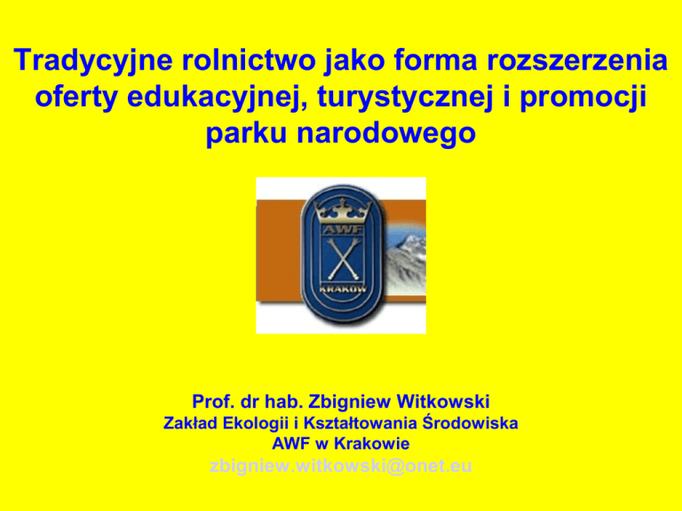 Tradycyjne rolnictwo jako forma rozszerzenia oferty edukacyjnej, turystycznej i promocji parku narodowego Prof. dr hab. Zbigniew Witkowski Zakład Ekologii i Kształtowania Środowiska AWF w Krakowie [email protected] Parki narodowe w Polsce słyną z bogactwa żywej przyrody. Elementem tego bogactwa są nie tylko zbiorowiska naturalne, głównie leśne. Istotne znaczenie dla bioróżnorodności tych obszarów mają również zbiorowiska nieleśne: łąki, pastwiska, sady i pola uprawne, które znajdują się we wszystkich parkach narodowych. Wiele z nich utrzymywanych jest na gruntach skarbu państwa, inne na gruntach prywatnych, wspólnotowych i innych. Wiele parków na swoich gruntach wprowadza rozmaite formy ochrony aktywnej biocenoz nieleśnych, żaden natomiast nie prowadzi czynnej ochrony na gruntach prywatnych, przy czym służby parków zdają sobie sprawę ze znaczenia utrzymania tych biocenoz dla bogactwa i atrakcyjności turystycznej przyrody w parku. Przedstawione niżej przykłady w kilku parkach narodowych pokazują jak wielkie bogactwo przyrodnicze wiąże się z biocenozami upraw, łąk i pastwisk. Dalej przedstawię propozycje jak zagospodarować to bogactwo dla celów ochrony przyrody, edukacji i turystyki. Struktura użytkowania gruntów w Ojcowskim Parku Narodowym Typy zbiorowisk roślinnych w rezerwacie biosfery Babia Góra Liczba zbiorow isk roślinnych 0 5 10 15 20 25 30 Muraw y w ysokogórskie Wyleżyska śnieżne Krzew inkow e Traw oroślow e Ziołoroślow e i okrajkow e Zaroślow e Leśne Młaki, turzycow iska i torfow iska Porębow e Łąkow e Tłoki w rzosow e i psiary Upraw rolnych Ruderalne Piętro roślinne Alpejskie Subalpejskie Regiel górny Regiel dolny Jedynie w dwóch parkach narodowych w Ojcowskim PN, i Babiogórskim PN znalazłem Informacje na temat udziału procentowego lub liczby zbiorowisk nieleśnych (we władaniu parku lub w rękach prywatnych) w powierzchni parku. Stan informacji na ten temat jest zadziwiająco skąpy, zważywszy, że niemal wszystkie parki narodowe dysponują dokładnymi mapami cyfrowymi roślinności, wykonanymi w ramach prac nad planami ochrony. Sprawa dostępu do tych podstawowych informacji była przedmiotem badań NIK, w którego raporcie pt. Informacja o wynikach kontroli Funkcjonowanie parków narodowych w zakresie zachowania, zrównoważonego użytkowania oraz odnawiania zasobów przyrody z 2006 r. znalazły się następujące stwierdzenia: W toku kontroli stwierdzono, że Departament Ochrony Przyrody Ministerstwa Środowiska nie dysponował danymi dotyczącymi powierzchni gruntów leżących w granicach parków narodowych, nie będących własnością Skarbu Państwa, których wykup był lub będzie niezbędny ze względu na walory przyrodnicze, w celu objęcia ich ochroną ścisłą, czynną lub krajobrazową. Ministerstwo nie określiło też szacunkowej wielkości środków potrzebnych na wykup gruntów w tym celu. Powstaje pytanie: Czy administracje parków narodowych w ogóle zdają sobie sprawę z wartości przyrodniczej obszarów nieleśnych w obrębie parku narodowego, w tym wartości przyrodniczej gruntów ornych znajdujących się w granicach parku ? Z informacji na oficjalnej stronie internetowej Poleskiego PN: Na terenie Poleskiego PN można spotkać wiele miejsc gdzie występują pola i ugory. Wiążą się z nimi cenne zespoły i gatunki roślin synantropijnych, w wielu wypadkach rzadkie w kraju lub stopniowo zanikające z uwagi na zmianę sposobu zagospodarowania rolniczego. Aby chronić te obszary wskazane jest dalsze zagospodarowanie tradycyjnymi metodami użytkowania niektórych fragmentów takich zbiorowisk. Z informacji na stronie internetowej Wigierskiego PN: Na przydrożach, ugorach, polach i ogrodach, po przypłociach i wśród zabudowań występuje roślinność synantropijna zróżnicowana na kilkanaście zespołów. W związku z coraz powszechniejszym stosowaniem herbicydów wiele gatunków zanika. Dotyczy to szczególnie chwastów pól uprawnych. Takie gatunki jak kąkol, maki, chaber, dawniej pospolite, obecnie należą do rzadkości. Na terenie parku narodowego również one powinny być zachowane, przynajmniej w niektórych miejscach. Wigierski PN Pola, łąki i pastwiska W Pienińskim PN łąki na gruntach skarbu państwa podlegają ochronie czynnej dla utrzymania bogactwa gatunkowego, roślin, bezkręgowców i grzybów. Łąki na gruntach prywatnych są opuszczone i zarastają, zaś resztki prywatnych gruntów rolnych są w parku niemile widziane. Pieniński PN Łąka na przełęczy Szopka W Bieszczadzkim PN na gruntach skarbu państwa prowadzi się hodowlę rasowych koni huculskich. Pozwala to na utrzymanie dużych kompleksów łąk i pastwisk. Bieszczadzki PN Hodowla zarodowa koni huculskich Ojcowski PN Przejażdżki dorożką Ojcowski PN posiada na swojej powierzchni największy procent pól uprawnych. Tutaj też prywatni właściciele gruntów przejawiają inicjatywę w kierunku rozwoju biznesu turystycznego Tatrzański PN to domena tradycyjnego wypasu owiec. Park obok Pienińskiego PN prowadzi tzw. wypas kulturowy zarówno na gruntach prywatnych jak i na gruntach skarbu państwa. Tatrzański PN Wypas owiec Łąki i pastwiska są również znaczącym typem ekosystemów w nadmorskich parkach narodowych. W słowińskim PN ekosystemy te na gruntach skarbu państwa są wykaszane przy pomocy maszyn Słowiński PN Użytkowanie łąk w Klukach W Roztoczańskim PN podobnie jak w Bieszczadzkim PN prowadzona jest hodowla koni. W tym parku na gruntach skarbu państwa hodowane są koniki polskie. Roztoczański PN Koniki polskie A co mówi na ten temat wspomniany raport NIK z 2006 r.? Szczególnej troski wymagają … cenne przyrodniczo ekosystemy nieleśne, powstałe wskutek wcześniejszej działalności człowieka, w ostatnich latach zanikłej z powodów przemian cywilizacyjnych. Ekosystemy te, usytuowane na obrzeżach lasów, podlegają naturalnej sukcesji, ulegając wpierw zakrzaczeniu, a n
