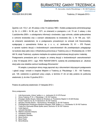 ROS.6220.39.6.2012.MM. Trzebnica, 21 listopada 2012 r. Zawiadomienie Zgodnie z art. 10 § 1, art. 49 ustawy z dnia 14 czerwca 1960 r. Kodeks postępowania administracyjnego (tj. Dz. U. z 2000 r. Nr 98, poz. 1071, ze zmianami) w powiązaniu z art. 74 ust. 3 ustawy z dnia 3 października 2008 r. o udostępnianiu informacji o środowisku i jego ochronie, udziale społeczeństwa w ochronie środowiska oraz o ocenach oddziaływania na środowisko (Dz. U. Nr 199, poz. 1227, ze zmianami) zawiadamiam, że w postępowaniu prowadzonym na wniosek Lidii Kaczorowskiej, występującej z upoważnienia Krokus sp. z o. o., ul. Janikowska 33, 61 – 070 Poznań, w sprawie wydania decyzji o środowiskowych uwarunkowaniach dla przedsięwzięcia polegającego na budowie stacji paliw wraz z infrastrukturą pomocniczą w Trzebnicy przy ul. Wrocławskiej (dz. nr 55/5 AM 16, obręb Trzebnica), uzyskano niezbędne do wydania przedmiotowej decyzji opinie i materiały. Postępowanie prowadzone jest w związku ze zmianą decyzji o środowiskowych uwarunkowaniach z dnia 18 listopada 2010 r. sygn. ROS 7625/39/13/09/10, wydanej dla przedsięwzięcia pn. „Budowa stacji paliw oraz obiektów centrum handlowego Bricomarche”. W związku z powyższym strony mogą zapoznać się z dokumentami dotyczącymi postępowania i zgłosić uwagi i wnioski w Urzędzie Miejskim w Trzebnicy pl. Piłsudskiego 1, 55 - 100 Trzebnica, pok. 129, codziennie w godzinach pracy urzędu, w terminie 21 dni od daty podania do publicznej wiadomości, tj. do dnia 12 grudnia 2012 r. Podano do publicznej wiadomości: 21 listopada 2012 r. Strony postępowania: 1. 2. 3. 4. 5. 6. 7. 8. 9. 10. 11. 12. 13. 14. 15. Lidia Kaczorowska; „Krokus” spółka z o. o., Janikowska 33, 61-070 Poznań Gmina Trzebnica; Pl. M. J. Piłsudskiego 1, 55-100 Trzebnica Energiapro Spółka Akcyjna, Oddział we Wrocławiu; pl. Powstańców Śląskich 5, 53-329 Wrocław Powiat Trzebnicki; Ks. Dz. W. Bochenka 6, 55-100 Trzebnica Specjalny Ośrodek Szkolno – Wychowawczy; Wrocławska 10, 55-100 Trzebnica Przedsiębiorstwo Produkcyjno-Handlowo-Usługowe „POM” Spółka z o. o.; Wrocławska 10, 55-100 Trzebnica Triada-Dom Wachowiak Śliwiak Spółka Jawna; Obornicka 19, 55-100 Trzebnica Liniak Zygmunt; Jurkowski Stanisław; Miękinia-Jurkowska Grażyna; Azaralewicz Danuta; Azaralewicz Stanisław; Baran Paulina; Baran Paweł; Bernat Bożena; 16. 17. 18. 19. 20. 21. 22. 23. 24. 25. 26. 27. 28. 29. 30. 31. 32. 33. 34. 35. 36. 37. 38. 39. 40. 41. 42. 43. 44. 45. 46. 47. 48. 49. 50. 51. 52. 53. 54. 55. 56. 57. 58. 59. 60. 61. 62. 63. 64. 65. 66. 67. 68. 69. 70. 71. 72. 73. 74. 75. 76. Bernat Stanisław; Biarda Agnieszka; Biarda Krzysztof; Biarda Marcin; Biegańska Alina; Biegański Marcin; Błaszczyk Alicja; Błaszczyk Marcin; Borusiak Jarosław; Boruszewska Adrianna; Boruszewska Teresa; Cecot-Flaka Wiesława; Chabiński Andrzej; Chaładaj Łukasz; Chrobak Anna; Chrobak Rafał; Cichoń Marta; Ciesielska Edyta; Czajkowski Rafał; Czwartosz Bogusława; Czwartosz Ryszard; Dawczak Krzysztof; Dawczak Marta; Dobrowolski Tomasz; Domagała Halina; Dorabiała Alina; Dorabiała Maciej; Duzinkiewicz Ewa; Duzinkiewicz Piotr; Farganus Ewelina; Farganus Łukasz; Fedeczko Edyta; Frączek Anna; Frączek Piotr; Gołębiowski Paweł; Grys Marcin; Grzesik Alicja; Guziak Agnieszka; Guziak Ryszard; Hawryliszyn Joanna; Hermanowicz Wojciech; Janicka Seweryna; Janicki Mariusz; Janicki Robert; Jankowska Marta; Jankowski Bartłomiej; Jarosz Mariusz; Jarosz Monika; Jaworek Ewelina; Kaczmarek Iwona; Kaczmarek Zbigniew; Kalka Katarzyna; Kalka Łukasz; Karcz Katarzyna; Kawaliło Felicja; Kazana Jacek; Knura Katarzyna; Knura Przemysław; Kocik Kamila; Kociuba Alfreda; Kociuba Bogdan; 77. Koller Anna; 78. Kożuszek Bernadetta; 79. Król Małgorzata; 80. Król Stefan; 81. Krysa Alfreda; 82. Krysa Jacek; 83. Krzus Damian; 84. Krzywicki Łukasz; 85. Kubacka Wioletta; 86. Kubacki Krzysztof; 87. Kurzeja Anna; 88. Łaskarzewska Dorota; 89. Lassek Marek; 90. Lenartowicz-Czajkowska Anna; 91. Łopąg Ewa; 92. Łopąg Tomasz; 93. Łuczyszyn Hanna; 94. Łuczyszyn Tomasz; 95. Małecki Tadeusz; 96. Marciszewska Małgorzata; 97. Masztalerz Piotr; 98. Masztalerz Sylwia; 99. Matysiak Katarzyna; 100. Matysiak Łukasz; 101. Mazur Bożena; 102. Mazur Józef; 103. Mierzwińska Marianna; 104. Mierzwiński Sławomir; 105. Moskwa Łukasz; 106. Moskwa Małgorzata; 107. Motyka Danuta; 108. Nita Zbigniew; 109. Nowaczyk Albert; 110. Nowaczyk Renata; 111. Nowakowska Anna; 112. Nowakowski Dawid; 113. Ojrzeński Bartłomiej; 114. Olechnowski Michał; 115. Oliwa Bolesław; 116. Opałka Grzegorz; 117. Opałka Marta; 118. Pajdzik Izabela; 119. Paterek Krystyna; 120. Pawlik Jerzy; 121. Pawlik Patrycja; 122. Piecyk Katarzyna; 123. Piecyk Marcin; 124. Pietruszka Jolanta; 125. Pisulska Angelika; 126. Płatek Rafał; 127. Pop Łukasz; 128. Proksza Katarzyna; 129. Proksza Marcin; 130. Rainczuk Henryka; 131. Rejek Danuta; 132. Siemińska Małgorzata; 133. Sierżant Janusz; 134. Sierżant Urszula; 135. Śliwiak Helena; 136. Smaś Ewelina; 137. Smaś Paweł; 138. Śmiecińska Ewelina; 139. Smorąg Aneta; 140. Smorąg Robert; 141. Stachera Kamil; 142. Starula Krystyna; 143. Studenny Mirosław; 144. Sudnik Olga; 145. Suszek Małgorzata; 146. Suszek Patryk; 147. Szopa Łukasz; 148. Sztadilów Agnieszka; 149. Sztadilów Tomasz; 150. Szwarc Agnieszka; 151. Szwarc Piotr; 152. Tabor Paulina; 153. Wacławek Katarzyna; 154. Wacławek Piotr; 155. Walczak Anna; 156. Walczak Grzegorz; 157. Wałejko Agnieszka; 158. Wałejko Wojciech; 159. Wapińska Anna; 160. Wapiński Paweł; 161. Wąż Dorota; 162. Widurski Arkadiusz; 163. Wieczorek Zofia; 164. Wojtas Emilia; 165. Wolar Anna; 166. Wolar Marcel; 167. Wołoszyn-Chaładaj Iwona; 168. Wolska Dagmara; 169. Wolski Jarosław; 170. Wolski Paweł; 171. Woźniak Jadwiga; 172. Wróbel Małgorzata; 173. Wróbel Piotr; 174. Żabińska Katarzyna; 175. Żabiński Grzegorz; 176. Zaczyńska Grażyna; 177. Zaczyńska Monika; 178.