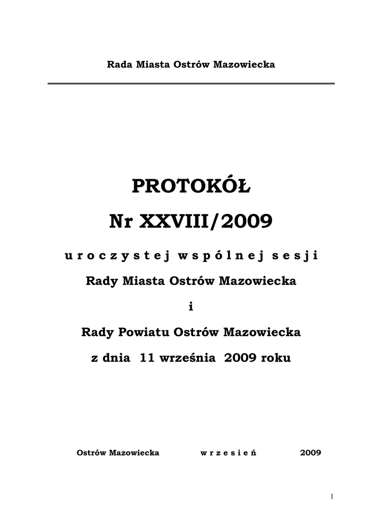 Rada Miasta Ostrów Mazowiecka PROTOKÓŁ Nr XXVIII/2009 uroczystej wspólnej sesji Rady Miasta Ostrów Mazowiecka i Rady Powiatu Ostrów Mazowiecka z dnia 11 września 2009 roku Ostrów Mazowiecka wrzesień 2009 1 PROTOKÓŁ ze wspólnej uroczystej Sesji Rady Powiatu Ostrów Mazowiecka i Rady Miasta Ostrów Mazowiecka odbytej w dniu 11 września 2009 r. w Liceum Ogółnokształcącym im. Mikołaja Kopernika w Ostrowi Mazowieckiej. Sesję rozpoczęto o godz. 10.30 a zakończono o godz.12.30. Stan Radnych Rady Powiatu Liczba Radnych obecnych na Sesji - 19 - 17 Stan Radnych Rady Miasta Liczba Radnych obecnych na Sesji - 21 - 20 (lista obecności Radnych Miasta w załączeniu do protokołu) Porządek obrad: 1. Otwarcie Sesji. 2. Wystąpienie Starosty i wręczenie medalu 10-lecia Powiatu Ostrowskiego. 3. Wystąpienie Burmistrza Miasta i wręczenie medalu Mieczkowskiego. 4. Wystąpienie Dyrektora Liceum Ogólnokształcącego im. Mikołaja Kopernika w Ostrowi Mazowieckiej. 5. Przyjęcie stanowiska dla uczczenia Jubileuszu Stulecia Liceum Ogólnokształcącego im. Mikołaja Kopernika w Ostrowi Mazowieckiej. 6. Wręczenie nagród Zarządu Powiatu. 7. Zakończenie obrad Sesji. Sesję rozpoczęto wprowadzeniem Sztandaru Szkoły oraz odegraniem hymnu państwowego. Przewodnicząca Rady Powiatu BoŜena Kordek zwracając się do zebranych na obradach sesji powiedziała, Ŝe Liceum Ogólnokształcące im. Mikołaja Kopernika w Ostrowi Mazowieckiej świętuje Jubileusz 100-lecia istnienia. Rada Powiatu w Ostrowi Mazowieckiej i Rada Miasta w Ostrowi Mazowieckiej w podjętych stanowiskach uznały rok 2009 jako rok Jubileuszu Szkoły. Obchody Jubileuszowe powiązane zostały ze Zjazdem Wychowanków oraz uroczystą Sesją Rady Powiatu i Miasta, aby wszyscy, których losy przeplatały się z historią tej szkoły mogli wziąć w nich udział. Ten szczególny dzień dla szkoły, jej pracowników, uczniów i wychowanków naleŜy przeŜyć uroczyście. Następnie wraz z Przewodniczącym Rady Miasta p Krzysztofem Laką otworzyła uroczystą sesję Rady Powiatu i Rady Miasta. 2 Przewodniczący Rady Miasta p. Krzysztof Laska poinformował o tym, Ŝe Rada Miasta w dniu 11 lutego 2009r. uznając historyczną pozycję Liceum Ogólnokształcącego im. Mikołaja Kopernika w Ostrowi Mazowieckiej, ogłosiła rok 2009 - Rokiem Jubileuszu Stulecia Liceum Ogólnokształcącego im. Mikołaja Kopernika w Ostrowi Mazowieckiej. Natomiast w dniu 30 czerwca 2009r. Rada Miasta Ostrów Mazowiecka nadała honorowe obywatelstwo miasta księdzu prałatowi Józefowi Obrębskiemu, najstarszemu wychowankowi Szkoły. Następnie podkreślił, Ŝe Liceum Ogólnokształcące wpisało się i wpisuje w dzieje miasta. Osiągnięcia Szkoły mierzy się osiągnięciami jej absolwentów a te są imponujące. Podkreślił, Ŝe realizowali oni swoje marzenia i aspiracje, czerpiąc ze swoich sukcesów zawodowych ogromną satysfakcję Ŝyciową a mieszkańcom dając powody do dumy. Zaapelował aby święto Szkoły, jej Absolwentów i Wychowanków, było równieŜ świętem wszystkich ostrowian i zaproszonych gości. W dalszej kolejności Przewodniczący Rady Miasta p. Krzysztof Laska przywitał przybyłych na sesje: - Panią Danutę Janusz i Pana Mariana Krupińskiego Radnych Sejmiku Województwa Mazowieckiego, - Pana Zbigniewa Kamińskiego Starostę Ostrowskiego, Pana Józefa Polaka Wicestarostę i Panią Annę Aldonę Zalewską, Pana Waldemara Wojtkowskiego, Pana Witolda Zadrogę Członków Zarządu Powiatu, - Panią Jolantę Ugniewską Sekretarza Powiatu, Panią Małgorzatę Konrad Skarbnika Powiatu oraz Panie i Panów Kierowników jednostek organizacyjnych powiatu oraz Naczelników wydziałów Starostwa Powiatowego - Panie i Panów Radnych Powiatu Ostrowskiego, - Pana Mieczysława Szymalskiego Burmistrza Miasta Ostrów Mazowiecka, - Pana Tomasza Skibickiego Sekretarza Miasta Ostrów Mazowiecka oraz Panie i Panów Kierowników jednostek organizacyjnych miasta, - Panie i Panów Radnych Miasta Ostrów Mazowiecka, - Panią Burmistrz Broku i Panów Wójtów Gmin Powiatu Ostrowskiego, - Dyrekcję, Radę pedagogiczną, pracowników i uczniów Liceum Ogólnokształcącego, - Przedstawicieli Komitetu Honorowego Obchodów Jubileuszu Szkoły, - Przedstawicieli Koła Wychowanków Liceum, - Radę Rodziców Liceum, - Przedstawicieli instytucji współpracujących ze szkołą i wspierających jej działalność, - Dyrektorów przedszkoli, szkół podstawowych, gimnazjów i szkół średnich, - Koordynatora MłodzieŜowej Rady Miasta i Powiatu, - wszystkich obecnych na obradach sesji. Przewodnicząca Rady Powiatu BoŜena Kordek stwierdziła quorum do prawomocnych obrad, w sesji wzięło udział 17 Radnych Powiatu Ostrowskiego i 20 Radnych Miasta Ostrów Mazowiecka. 3 Punkt 2. Wystąpienie Ostrowskiego. Starosty i wręczenie medalu 10-lecia Powiatu Pan Zbigniew Kamiński Starosta Ostrowski odczytał okolicznościowe wystąpienie. Następnie wspólnie z Przewodniczącą Rady Powiatu złoŜył gratulacje i wręczył Dyrektorowi Włodzimierzowi Kazimierskiemu medal 10-lecia Powiatu Ostrowskiego dla Liceum Ogólnokształcącego im. Mikołaja Kopernika w Ostrowi Mazowieckiej. Punkt 3. Wystąpienie Burmistrza Miasta i wręczenie medalu im. Ludwika Mieczkowskiego. Pan Mieczysław Szymalski Burmistrz Miasta Ostrów Mazowiecka złoŜył gratulacje z okazji Jubileuszu szkoły, podkreślił rangę szkoły oraz rozsławianie miasta w kraju i poza jego granicami przez wychowanków Liceum. Burmistrz wspólnie z Przewodniczącym Rady Miasta wręczył na ręce Dyrektora Włodzimierza Kazimierskiego przyznany Liceum medal imienia Ludwika Mieczkowskiego. Na wniosek Przewodniczącego Rady Miasta Krzysztofa Laski zebrami uczcili minutą ciszy pamięć wszystkich zmarłych dyrektorów, nauczycieli i pracowników Liceum Ogólnokształcącego w Ostrowi Mazowieckiej. Punkt 4. Wystąpienie Dyrektora Liceum Ogólnokształcącego im. Mikołaja Kopernika w Ostrowi Mazowieckiej. Dyrektor Wło