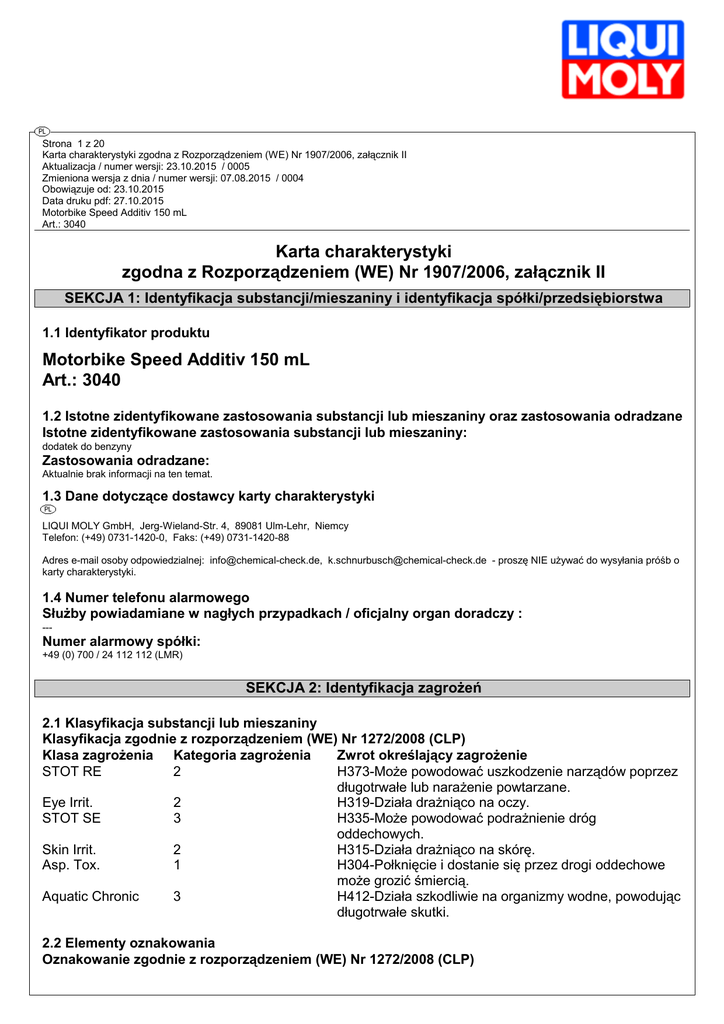 Strona 1 z 20 Karta charakterystyki zgodna z Rozporządzeniem (WE) Nr 1907/2006, załącznik II Aktualizacja / numer wersji: 23.10.2015 / 0005 Zmieniona wersja z dnia / numer wersji: 07.08.2015 / 0004 Obowiązuje od: 23.10.2015 Data druku pdf: 27.10.2015 Motorbike Speed Additiv 150 mL Art.: 3040 Karta charakterystyki zgodna z Rozporządzeniem (WE) Nr 1907/2006, załącznik II SEKCJA 1: Identyfikacja substancji/mieszaniny i identyfikacja spółki/przedsiębiorstwa 1.1 Identyfikator produktu Motorbike Speed Additiv 150 mL Art.: 3040 1.2 Istotne zidentyfikowane zastosowania substancji lub mieszaniny oraz zastosowania odradzane Istotne zidentyfikowane zastosowania substancji lub mieszaniny: dodatek do benzyny Zastosowania odradzane: Aktualnie brak informacji na ten temat. 1.3 Dane dotyczące dostawcy karty charakterystyki LIQUI MOLY GmbH, Jerg-Wieland-Str. 4, 89081 Ulm-Lehr, Niemcy Telefon: (+49) 0731-1420-0, Faks: (+49) 0731-1420-88 Adres e-mail osoby odpowiedzialnej: [email protected], [email protected] - proszę NIE używać do wysyłania próśb o karty charakterystyki. 1.4 Numer telefonu alarmowego Służby powiadamiane w nagłych przypadkach / oficjalny organ doradczy : --- Numer alarmowy spółki: +49 (0) 700 / 24 112 112 (LMR) SEKCJA 2: Identyfikacja zagrożeń 2.1 Klasyfikacja substancji lub mieszaniny Klasyfikacja zgodnie z rozporządzeniem (WE) Nr 1272/2008 (CLP) Klasa zagrożenia Kategoria zagrożenia Zwrot określający zagrożenie STOT RE 2 H373-Może powodować uszkodzenie narządów poprzez długotrwałe lub narażenie powtarzane. Eye Irrit. 2 H319-Działa drażniąco na oczy. STOT SE 3 H335-Może powodować podrażnienie dróg oddechowych. Skin Irrit. 2 H315-Działa drażniąco na skórę. Asp. Tox. 1 H304-Połknięcie i dostanie się przez drogi oddechowe może grozić śmiercią. Aquatic Chronic 3 H412-Działa szkodliwie na organizmy wodne, powodując długotrwałe skutki. 2.2 Elementy oznakowania Oznakowanie zgodnie z rozporządzeniem (WE) Nr 1272/2008 (CLP) Strona 2 z 20 Karta charakterystyki zgodna z Rozporządzeniem (WE) Nr 1907/2006, załącznik II Aktualizacja / numer wersji: 23.10.2015 / 0005 Zmieniona wersja z dnia / numer wersji: 07.08.2015 / 0004 Obowiązuje od: 23.10.2015 Data druku pdf: 27.10.2015 Motorbike Speed Additiv 150 mL Art.: 3040 Niebezpieczeństwo H373-Może powodować uszkodzenie narządów poprzez długotrwałe lub narażenie powtarzane. H319-Działa drażniąco na oczy. H335-Może powodować podrażnienie dróg oddechowych. H315-Działa drażniąco na skórę. H304-Połknięcie i dostanie się przez drogi oddechowe może grozić śmiercią. H412-Działa szkodliwie na organizmy wodne, powodując długotrwałe skutki. P101-W razie konieczności zasięgnięcia porady lekarza należy pokazać pojemnik lub etykietę. P102-Chronić przed dziećmi. P260-Nie wdychać par i rozpylonej cieczy. P280-Stosować rękawice ochronne i ochronę oczu/twarzy. P301+P310+P331-W PRZYPADKU POŁKNIĘCIA: natychmiast skontaktować się z OŚRODKIEM ZATRUĆ/lekarzem. NIE wywoływać wymiotów. P314-W przypadku złego samopoczucia zasięgnąć porady/zgłosić się pod opiekę lekarza. P405-Przechowywać pod zamknięciem. P501-Zawartość/pojemnik usuwać do zakładu utylizacji odpadów specjalnych. Ksylen (mieszanina izomerów) Węglowodory, C11-C14, n-alkanay, izoalkany, cykloalkany, < 2% związki aromatyczne Węglowodory, C10-C13, n-alkanay, izoalkany, cykloalkany, < 2% związki aromatyczne Węglowodory, C11-C14, n-alkanay, izoalkany, cykloalkany, związki aromatyczne (2-25%) 2.3 Inne zagrożenia Mieszanina nie zawiera substancji vPvB (vPvB = very persistent, very bioaccumulative) bądź nie jest wykazana w załączniku XIII rozporządzenia (WE) 1907/2006. Mieszanina nie zawiera substancji PBT (PBT = persistent, bioaccumulative, toxic) bądź nie jest wykazana w załączniku XIII rozporządzenia (WE) 1907/2006. Zagrożenie wody pitnej już przy wycieku niewielkich ilości. SEKCJA 3: Skład/informacja o składnikach 3.1 Substancja n.s. 3.2 Mieszanina Węglowodory, C10-C13, n-alkanay, izoalkany, cykloalkany, < 2% związki aromatyczne Numer rejestracji (REACH) Index EINECS, ELINCS, NLP CAS Stęż.% Klasyfikacja zgodnie z rozporządzeniem (WE) Nr 1272/2008 (CLP) Ksylen (mieszanina izomerów) Numer rejestracji (REACH) Index EINECS, ELINCS, NLP CAS Stęż.% 01-2119457273-39-XXXX --918-481-9 (REACH-IT List.No.) --40-60 Asp. Tox. 1, H304 Substancja, dla której obowiązuje wartość graniczna ekspozycji UE. 01-2119488216-32-XXXX 601-022-00-9 215-535-7 1330-20-7 20-<25 Strona 3 z 20 Karta charakterystyki zgodna z Rozporządzeniem (WE) Nr 1907/2006, załącznik II Aktualizacja / numer wersji: 23.10.2015 / 0005 Zmieniona wersja z dnia / numer wersji: 07.08.2015 / 0004 Obowiązuje od: 23.10.2015 Data druku pdf: 27.10.2015 Motorbike Speed Additiv 150 mL Art.: 3040 Klasyfikacja zgodnie z rozporządzeniem (WE) Nr 1272/2008 (CLP) Węglowodory, C11-C14, n-alkanay, izoalkany, cykloalkany, związki aromatyczne (2-25%) Numer rejestracji (REACH) Index EINECS, ELINCS, NLP CAS Stęż.% Klasyfikacja zgodnie z rozporządzeniem (WE) Nr 1272/2008 (CLP) Węglowodory, C10, związki aromatyczne, <1% naftalen Numer rejestracji (REACH) Index EINECS, ELINCS, NLP CAS Stęż.% Klasyfikacja zgodnie z rozporządzeniem (WE) Nr 1272/2008 (CLP) Węglowodory, C10, związki aromatyczne, >1% naftalen Numer rejestracji (REACH) Index EINECS, ELINCS, NLP CAS Stęż.% Klasyfikacja zgodnie z rozporządzeniem (WE) Nr 1272/2008 (CLP) Naftalen Numer rejestracji (REACH) Index EINECS, ELINCS, NLP CAS Stęż.% Klasyfikacja zgodnie z rozporządzeniem (WE) Nr 1272/2008 (CLP) Flam. Liq. 3, H226 Asp. Tox. 1, H304 Acute Tox. 4, H312 Skin Irrit. 2, H315 Eye Irrit. 2, H319 Acute Tox. 4, H332 STOT SE 3, H335 STOT RE 2, H373 01-2119458869-15-XXXX --925-653-7 (REACH-IT List-No.) (64742-81-0) 1-5 Asp. Tox. 1, H304 Aquatic Chronic 3, H412 01-2119463583-34-XXXX --918-811-1 (REACH-IT List-No.) (64742-94-5) 1-2,5 Asp. Tox. 1, H304 STOT SE 