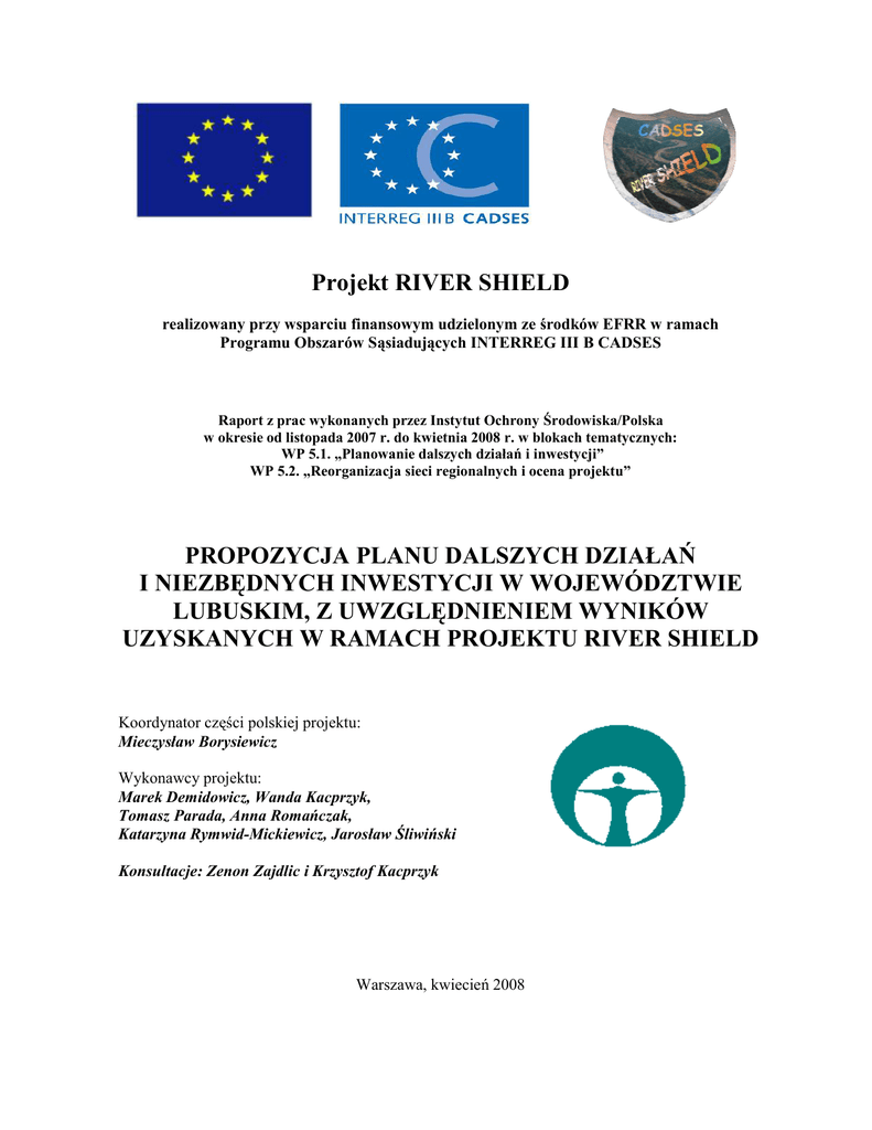 Projekt RIVER SHIELD realizowany przy wsparciu finansowym udzielonym ze środków EFRR w ramach Programu Obszarów Sąsiadujących INTERREG III B CADSES Raport z prac wykonanych przez Instytut Ochrony Środowiska/Polska w okresie od listopada 2007 r. do kwietnia 2008 r. w blokach tematycznych: WP 5.1. „Planowanie dalszych działań i inwestycji” WP 5.2. „Reorganizacja sieci regionalnych i ocena projektu” PROPOZYCJA PLANU DALSZYCH DZIAŁAŃ I NIEZBĘDNYCH INWESTYCJI W WOJEWÓDZTWIE LUBUSKIM, Z UWZGLĘDNIENIEM WYNIKÓW UZYSKANYCH W RAMACH PROJEKTU RIVER SHIELD Koordynator części polskiej projektu: Mieczysław Borysiewicz Wykonawcy projektu: Marek Demidowicz, Wanda Kacprzyk, Tomasz Parada, Anna Romańczak, Katarzyna Rymwid-Mickiewicz, Jarosław Śliwiński Konsultacje: Zenon Zajdlic i Krzysztof Kacprzyk Warszawa, kwiecień 2008 Niniejszy raport opracowano w Instytucie Ochrony Środowiska w ramach projektu „Ochrona wód przed awaryjnymi zanieczyszczeniami przemysłowymi” (RIVER SHIELD), który jest realizowany dzięki wsparciu finansowemu z Europejskiego Funduszu Rozwoju Regionalnego (EFRR) w ramach Programu Obszarów Sąsiadujących INTERREG III B CADSES. Zaprezentowane w tym raporcie informacje odzwierciedlają poglądy autorów. Instytucja Zarządzająca CADSES nie ponosi prawnej odpowiedzialności za jakiekolwiek skutki wynikające z ich wykorzystania. 2 Spis treści Str. Streszczenie ..............................................................................................................................................5 Wprowadzenie........................................................................................................................................7 1. Podstawa i cel opracowania planu działań .............................................................................9 2. Cele szczegółowe i priorytety planu działań ...........................................................................9 3. Proponowane działania i inwestycje......................................................................................11 Priorytet I. Zapobieganie awariom przemysłowym i ograniczanie ich skutków .........................11 Działanie I.1. Wzmocnienie etatowe PSP i WIOŚ (działanie kluczowe) ...............................14 Działanie I.2. Kontrola zakładów przemysłowych (działanie kluczowe)...............................14 Działanie I.3. Wdrożenie środków z zakresu planowania przestrzennego w kontekście ograniczania ryzyka awarii (działanie kluczowe)...........................................15 Działanie I.4. Zapobieganie wtórnym zanieczyszczeniom wód w wyniku zagrożeń powodziowych ................................................................................................16 Działanie I.5. Zapobieganie awariom u źródła (działanie kluczowe) .....................................17 Priorytet II. Gotowość na zdarzenia awaryjne ............................................................................19 Działanie II.1. Ustanowienie Centrum Powiadamiania Ratunkowego w Gorzowie Wielkopolskim................................................................................................21 Działanie II.2. Dalsza rozbudowa systemu łączności, alarmowania i ostrzegania ludności (działanie kluczowe) .......................................................................................22 Działanie II.3. Szkolenia i ćwiczenia w zakresie reagowania na awarie (działanie kluczowe) ........................................................................................................................23 Działanie II.4. Wzmocnienie zaplecza badawczego wspierającego system reagowania na awarie (działanie kluczowe) ...........................................................................24 Działanie II.5. Kontynuowanie współpracy bilateralnej z Niemcami w dziedzinie awarii transgranicznych (działanie kluczowe)...........................................................25 Priorytet III. Reagowanie na awarie z udziałem substancji niebezpiecznych .............................25 Działanie III.1. Wzmocnienie możliwości technicznych służb włączonych w akcję ratowniczą (działanie kluczowe) .......................................................................................28 Działanie III.2. Sporządzenie wojewódzkiego planu zarządzania ryzykiem...........................30 Działanie III.3. Wdrażanie Wojewódzkiego Planu Reagowania Kryzysowego (działanie kluczowe)........................................................................................................31 Priorytet IV. Ochrona wód i uporządkowanie gospodarki ściekowej..........................................32 Działanie IV.1. Wzmocnienie możliwości laboratoryjnych WIOŚ (działanie kluczowe) .......34 Działanie IV.2. Uporządkowanie gospodarki ściekowej w aglomeracjach powyżej 15 tys. RLM (działanie kluczowe) .............................................................................34 3 Działanie IV.3. Uporządkowanie gospodarki ściekowej w aglomeracjach od 2 tys. do 15 tys. RLM................................................................................................................35 Działanie IV.4. Uporządkowanie gospodarki ściekowej w zakładach przemysłowych ..........35 Priorytet V. Informowanie społeczeństwa i podnoszenie poziomu świadomości społecznej.....35 Działanie V.1. Wdrożenie programów szkoleniowych i informacyjnych dla zainteresowanych grup docelowych (działanie kluczowe) ..........................................................37 Działanie V.2. Prowadzenie powszechnej edukacji społeczeństwa w zakresie zagrożeń i ochrony wód w ramach edukacji nieformalnej i formalnej (działanie kluczowe)........................................................................................................37 Działanie V.3. Upowszechnianie wyników projektu RIVER SHIELD (działanie kluczowe) 38 Działanie V.