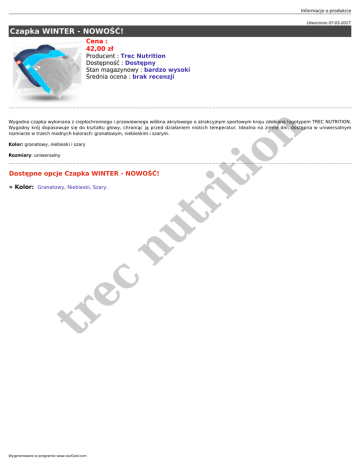 Informacje o produkcie Utworzono 07-03-2017 Czapka WINTER - NOWOŚĆ! Cena : 42,00 zł Producent : Trec Nutrition Dostępność : Dostępny Stan magazynowy : bardzo wysoki Średnia ocena : brak recenzji Kolor: granatowy, niebieski i szary Rozmiary: uniwersalny Dostępne opcje Czapka WINTER - NOWOŚĆ! tr ec nu tr i » Kolor: Granatowy, Niebieski, Szary. Wygenerowano w programie www.oscGold.com ti on Wygodna czapka wykonana z ciepłochronnego i przewiewnego włókna akrylowego o atrakcyjnym sportowym kroju zdobiona logotypem TREC NUTRITION. Wygodny krój dopasowuje się do kształtu głowy, chroniąc ją przed działaniem niskich temperatur. Idealna na zimne dni, dostępna w uniwersalnym rozmiarze w trzech modnych kolorach: granatowym, niebieskim i szarym.
