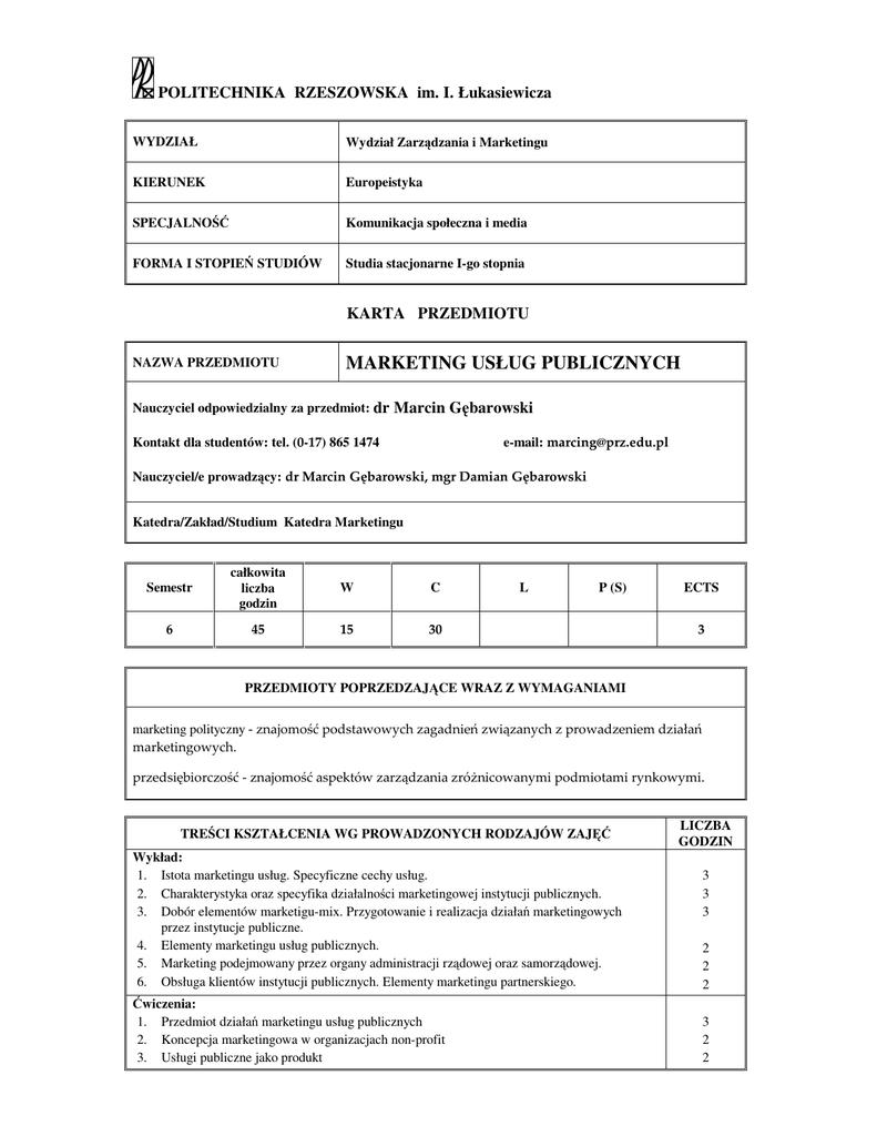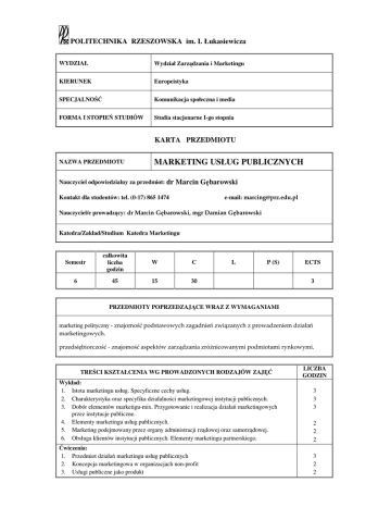 POLITECHNIKA RZESZOWSKA im. I. Łukasiewicza WYDZIAŁ Wydział Zarządzania i Marketingu KIERUNEK Europeistyka SPECJALNOŚĆ Komunikacja społeczna i media FORMA I STOPIEŃ STUDIÓW Studia stacjonarne I-go stopnia KARTA PRZEDMIOTU NAZWA PRZEDMIOTU MARKETING USŁUG PUBLICZNYCH Nauczyciel odpowiedzialny za przedmiot: dr Marcin Gębarowski Kontakt dla studentów: tel. (0-17) 865 1474 e-mail: [email protected] Nauczyciel/e prowadzący: dr Marcin Gębarowski, mgr Damian Gębarowski Katedra/Zakład/Studium Katedra Marketingu Semestr całkowita liczba godzin W C 6 45 15 30 L P (S) ECTS 3 PRZEDMIOTY POPRZEDZAJĄCE WRAZ Z WYMAGANIAMI marketing polityczny - znajomość podstawowych zagadnień związanych z prowadzeniem działań marketingowych. przedsiębiorczość - znajomość aspektów zarządzania zróżnicowanymi podmiotami rynkowymi. TREŚCI KSZTAŁCENIA WG PROWADZONYCH RODZAJÓW ZAJĘĆ Wykład: 1. Istota marketingu usług. Specyficzne cechy usług. 2. Charakterystyka oraz specyfika działalności marketingowej instytucji publicznych. 3. Dobór elementów marketigu-mix. Przygotowanie i realizacja działań marketingowych przez instytucje publiczne. 4. Elementy marketingu usług publicznych. 5. Marketing podejmowany przez organy administracji rządowej oraz samorządowej. 6. Obsługa klientów instytucji publicznych. Elementy marketingu partnerskiego. Ćwiczenia: 1. Przedmiot działań marketingu usług publicznych 2. Koncepcja marketingowa w organizacjach non-profit 3. Usługi publiczne jako produkt LICZBA GODZIN 3 3 3 2 2 2 3 2 2 4. Badanie potrzeb i preferencji klientów administracji publicznej 5. Segmentacja rynku usług administracji publicznej 6. Tworzenie oferty na rynku usług publicznych 7. Strategie cenowe na rynku usług publicznych 8. Koncepcja promocji usług publicznych. Instrumenty i środki promocji usług publicznych 9. Innowacyjność usług publicznych - wykorzystanie 10. Internetu w marketingu instytucji publicznych Laboratoria: 1. Projekty: 1. Łącznie liczba godzin: 4 4 3 4 2 2 4 15/30 Dyżury dydaktyczne (konsultacje): w terminach podanych w harmonogramie pracy jednostki EFEKTY KSZTAŁCENIA - UMIEJĘTNOŚCI KSZTAŁCENIA Rozumienie istoty działań marketingowych w sektorze publicznym. Umiejętność praktycznego stosowania instrumentów marketingowych przez zróżnicowane instytucje publiczne. FORMA I WARUNKI ZALICZENIA PRZEDMIOTU (RODZAJU ZAJĘĆ) Uzyskanie pozytywnej oceny z kolokwium zaliczeniowego oraz aktywność w ramach ćwiczeń. Uzyskanie pozytywnej oceny z egzaminu pisemnego. WYKAZ LITERATURY PODSTAWOWEJ 1. 2. Kotler Ph., Lee N., Marketing w sektorze publicznym. Mapa drogowa wyższej efektywności, Wyd. Akademickie i Profesjonalne, Wyższa Szkoła Przedsiębiorczości i Zarządzania im. L. Koźmińskiego Warszawa, 2008. Sargeant A., Marketing w organizacjach non profit, Wyd. Wolters Kluwer Polska, Kraków 2005. WYKAZ LITERATURY UZUPEŁNIAJĄCEJ 1. 2. 3. Czubała A, Jonas A., Smoleń T., Wiktor J.W., Marketing usług, Wolters Kluwer Polska, Kraków 2006. Gilmore A., Usługi: marketing i zarządzanie, PWE, Warszawa 2006. Kożuch B., Zarządzanie publiczne. W teorii i praktyce polskich organizacji, Wyd. Placet, Warszawa 2005. Podpis nauczyciela odpowiedzialnego za przedmiot Podpis kierownika (zakładu/studium) katedry Data i podpis dziekana właściwego wydziału