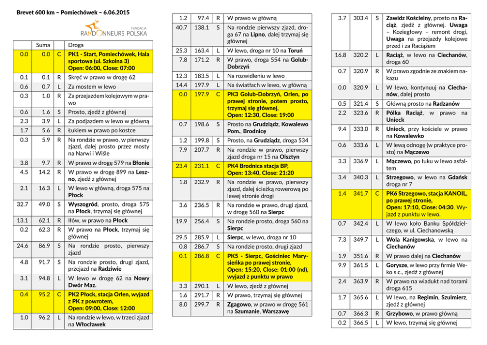 Brevet 600 km – Pomiechówek – 6.06.2015 RA D Suma FUNDACJA NNEURS POLSKA Droga 1.2 97.4 R W prawo w główną 40.7 138.1 S Na rondzie pierwszy zjazd, droga 67 na Lipno, dalej trzymaj się głównej 25.3 163.4 L W lewo, droga nr 10 na Toruń 7.8 171.2 R W prawo, droga 554 na GolubDobrzyń 3.7 303.4 S Zawidz Kościelny, prosto na Raciąż, zjedź z głównej. Uwaga – Koziegłowy – remont drogi, Uwaga na przejazdy kolejowe przed i za Raciążem 16.8 320.2 L Raciąż, w lewo na Ciechanów, droga 60 0.7 320.9 R W prawo zgodnie ze znakiem nakazu 0.0 0.0 C PK1 - Start, Pomiechówek, Hala sportowa (ul. Szkolna 3) Open: 06:00, Close: 07:00 0.1 0.1 R Skręć w prawo w drogę 62 12.3 183.5 L Na rozwidleniu w lewo 0.6 0.7 L Za mostem w lewo 14.4 197.9 L Na światłach w lewo, w główną 0.0 320.9 L 0.0 197.9 C PK3 Golub-Dobrzyń, Orlen, po prawej stronie, potem prosto, trzymaj się głównej, Open: 12:30, Close: 19:00 W lewo, kontynuuj na Ciechanów, dalej prosto 0.5 321.4 S Główną prosto na Radzanów 2.2 323.6 R Pólka Raciąż, w prawo na Unieck 9.4 333.0 R Unieck, przy kościele w prawo na Kowalewko 0.6 333.6 L W lewą odnogę (w praktyce prosto) na Mączewo 3.3 336.9 L Mączewo, po łuku w lewo asfaltem 3.4 340.3 L Strzegowo, w lewo na Gdańsk droga nr 7 1.4 341.7 C PK6 Strzegowo, stacja KANOIL, po prawej stronie, Open: 17:10, Close: 04:30. Wyjazd z punktu w lewo. 0.3 1.0 R Za przejazdem kolejowym w prawo 0.6 1.6 S Prosto, zjedź z głównej 2.3 3.9 L Za podjazdem w lewo w główną 1.7 5.6 R Łukiem w prawo po kostce 0.3 5.9 R Na rondzie w prawo, w pierwszy zjazd, dalej prosto przez mosty na Narwi i Wiśle 3.8 9.7 R W prawo w drogę 579 na Błonie 4.5 14.2 R W prawo w drogę 899 na Leszno, zjedź z głównej 2.1 16.3 L W lewo w główną, droga 575 na Płock 32.7 49.0 S Wyszogród, prosto, droga 575 na Płock, trzymaj się głównej 13.1 62.1 R 0.2 62.3 R S Prosto, na Grudziądz, droga 534 7.9 207.7 R Na rondzie w prawo, pierwszy zjazd droga nr 15 na Olsztyn 23.4 231.1 C PK4 Brodnica stacja BP, Open: 13:40, Close: 21:20 1.8 232.9 R Na rondzie w prawo, pierwszy zjazd, dalej ścieżką rowerową po lewej stronie drogi 19.9 256.4 S 0.7 342.4 L W prawo na Płock, trzymaj się głównej Na rondzie prosto, droga 560 na Sierpc W lewo koło Banku Spółdzielczego, w ul. Ciechanowską 29.5 285.9 L Sierpc, w lewo, droga nr 10 7.3 349.7 L 0.8 286.7 S Na rondzie prosto, drugi zjazd Wola Kanigowska, w lewo na Ciechanów 0.1 286.8 C PK5 - Sierpc, Gościniec Marysieńka po prawej stronie, Open: 15:20, Close: 01:00 (nd), wyjazd z punktu w prawo 1.9 351.6 R W prawo dalej na Ciechanów 9.9 361.5 L Gorysze, w lewo przy firmie Weko s.c., zjedź z głównej 2.4 363.9 R W prawo na wiadukt nad torami droga 615 91.7 S Na rondzie prosto, drugi zjazd, przejazd na Radziwie 3.1 94.8 L W lewo w drogę 62 na Nowy Dwór Maz. L 199.8 Iłów, w prawo na Płock 4.8 96.2 1.2 Na rondzie w prawo, drugi zjazd, w drogę 560 na Sierpc Na rondzie prosto, pierwszy zjazd 1.0 Prosto na Grudziądz, Kowalewo Pom., Brodnicę R S C S 236.5 86.9 95.2 198.6 3.6 24.6 0.4 0.7 PK2 Płock, stacja Orlen, wyjazd z PK z powrotem, Open: 09:00, Close: 12:00 Na rondzie w lewo, w trzeci zjazd na Włocławek 3.3 290.1 L W lewo, zjedź z głównej 1.6 291.7 R W prawo, trzymaj się głównej 1.7 365.6 L 8.0 299.7 R Zgagowo, w prawo w drogę 561 na Szumanie, Warszawę W lewo, na Regimin, Szulmierz, zjedź z głównej 0.7 366.3 R Grzybowo, w prawo główną 0.2 366.5 L W lewo, trzymaj się głównej 3.4 369.9 L Regimin, lekko w lewo, trzymaj się głównej 6.1 490.1 S Dąbrówka, na skrzyżowaniu prosto (za skrzyżowaniem po lewej drewniany kościół) 0.8 370.7 L W lewo na Kątki 0.4 371.1 R 21.4 594.7 C W prawo na Łęg Starościński, zjedź z głównej PK10 - Nasielsk stacja benzynowa bez nazwy po lewej stronie, przed marketem MarcPol Open: 01:30, Close: 21:20 (nd) Na rozwidleniu w prawo, dalej prosto przez Zeńbok, Humięcino 2.3 492.4 R 0.0 594.7 L Wyjazd z punktu w lewo 3.9 496.3 S W prawo, wjazd na główną 1.9 596.6 L Na światłach w lewo na Nowy Dwór Maz., dalej prosto, trzymaj się głównej 14.5 611.1 L W lewo, w drogę 62 na Serock 0.2 611.3 L W lewo, w ulicę Szkolną 0.1 611.4 C PK11 - Meta, Pomiechówek, Hala sportowa (ul. Szkolna 3) Open: 02:00, Close: 22:00 6.5 377.6 R Humięcino, w prawo w główną 2.0 498.3 L 0.2 377.8 L W lewo za figurką w nieoznaczoną drogę, dalej trzymaj się głównej W lewo w drogę na Ostrołękę, na główną 8.5 506.8 L Ostrołęka, skręć w drogę 53 0.7 507.5 R Na rondzie w prawo w drogę 61 na Warszawę 2.6 380.4 L Łysakowo, w lewo na Grudusk 4.5 384.9 L Grudusk, w lewo na Chorzele (616), Mławę (544) 1.3 508.8 S Rondo, pierwszy zjazd w 544 na Przasnysz 0.7 385.6 R Grudusk, w prawo na Chorzele, droga 616 9.4 518.2 L Nowa Wieś, rondo, 3 zjazd na Przasnysz 26.8 412.4 L W lewo w drogę 57 na Szczytno 0.1 518.3 C 2.2 414.6 L Rondo, 4 zjazd 0.0 414.6 C PK7 - Chorzele - zaraz za rondem stacja Huzar po prawej Open: 19:30, Close: 09:20 (nd) PK9 - Nowa Wieś, stacja paliw bez nazwy (żółtawo-niebieska) Open: 23:00, Close: 16:10 (nd) 0.0 518.3 R Wyjazd z punktu w prawo na Maków 14.5 532.8 R Główną na Maków Mazowiecki, dalej 626 1.2 534.0 L Główną na Maków Mazowiecki, dalej 626 17.5 551.5 R W prawo, w drogę 60 na Ciechanów 0.6 552.1 L W lewo na Warszawę, w drogę 57 Łyse, przed kościołem skręcić w prawo w ul. Topolową 16.4 568.5 R W prawo na Warszawę, w drogę 61, trzymaj się głównej C PK8 - Łyse, stacja paliw Stamlar po prawej Open: 21:20, Close: 12:45 2.9 571.4 R Pułtusk, na rondzie w lewo, pierwszy zjazd, na Ciechanów, droga 618 467.4 L Wyjazd z punktu w lewo 0.3 571.7 L W lewo, zjazd z głównej 0.0 467.4 R W prawo w 645 na Ostrołękę 0.7 572.4 R Na rondzie prosto, drugi zjazd 5.2 472.6 R W prawo na Grale, droga bez numeru, dalej trzymaj się głównej 0.4 572.8 S Na rondzie prosto, trzeci zjazd 11.4 484.0 L Grale, w lewo na nieoznakowanym rozjeździe przy sklepie, 