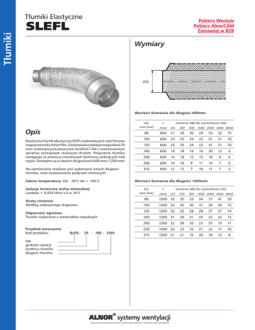 Tłumiki Tłumiki Elastyczne Pobierz Wentyle Pobierz AlnorCAM Zamawiaj w B2B SLEFL Wymiary Æd1 Wartości tłumienia dla długości 600mm Opis Elastyczny tłumik akustyczny SLEFL wykonany jest z perforowanego przewodu Alnor Flex. Zastosowana izolacja ma grubość 25 mm i osłonięta jest płaszczem ALUDUCT AD-L wzmocnionym spiralnie zwinięetym stalowym drutem. Połączenie tłumika następuje za pomocą metalowych kołnierzy pełniących rolę nypla. Dostępne są w dwóch długościach 600 mm i 1200 mm. Na zamówienie możliwe jest wykonanie innych długości tłumika, oraz zastosowanie połączeń mufowych. Zakres temperatury: Od – 20°C do + 140°C Izolacja termiczna wełny mineralnej: Lambda = 0,034 W/m x k w 24°C Straty ciśnienia: Według załączonego diagramu. Odporność ogniowa: Tłumiki wykonane z materiałów niepalnych. Przykład oznaczenia Kod produktu: SLEFL- 25 - 100 - 1200 L tłumienie [dB] dla częstotliwości [Hz] Æd1 nom [mm] [mm] 125 250 500 80 600 21 26 30 29 33 32 15 100 600 23 25 24 22 31 21 10 125 600 23 25 24 22 31 21 10 1000 2000 4000 8000 160 600 19 18 14 14 20 12 6 200 600 14 18 12 13 18 9 6 250 600 14 16 8 11 14 7 6 315 600 12 12 7 10 11 7 3 Wartości tłumienia dla długości 1200mm Æd1 nom [mm] L [mm] tłumienie [dB] dla częstotliwości [Hz] 125 250 500 80 1200 33 35 33 1000 2000 4000 8000 34 37 41 29 100 1200 33 35 30 31 39 30 15 125 1200 32 33 28 28 37 27 14 160 1200 31 29 21 25 32 22 13 200 1200 22 28 20 22 25 15 11 250 1200 24 23 16 21 22 11 10 315 1200 21 21 15 20 18 12 8 typ grubość izolacji średnica tłumika długośc tłumika ALNOR® systemy wentylacji jest prawnie chronionym znakiem i technicznym patentem. Prawo do zmian zastrzeżone. Tłumiki Elastyczne Pobierz Wentyle Pobierz AlnorCAM Zamawiaj w B2B SLEFL Tłumiki Dane techniczne Straty ciśnienia w tłumikach elastycznych SLEFL-25. ćp rze 5 dn ic dk oś 15 5 śre strata ciśnienia [Pa/m] tłumika a1 00 m pr ę przepływ [m3/h] Straty ciśnienia w tłumikach wykonanych z metalowych rur. Długość tłumika = 1,0 m 1 Pa = 0,01 mbar = około 0,1 mm WG ALNOR® systemy wentylacji jest prawnie chronionym znakiem i technicznym patentem. Prawo do zmian zastrzeżone. pł y wu 15 m /s
