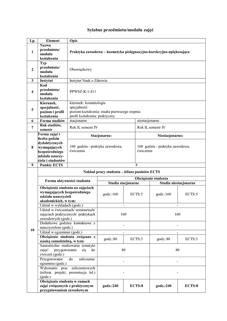 Sylabus przedmiotu/modułu zajęć Lp. 1 2 3 4 5 6 7 8 9 Element Nazwa przedmiotu/ modułu kształcenia Typ przedmiotu/ modułu kształcenia Instytut Kod przedmiotu/ modułu kształcenia Kierunek, specjalność, poziom i profil kształcenia Forma studiów Rok studiów, semestr Forma zajęć i liczba godzin dydaktycznych wymagających bezpośredniego udziału nauczyciela i studentów Punkty ECTS Opis Praktyka zawodowa – kosmetyka pielęgnacyjno-korekcyjno-upiększająca Obowiązkowy Instytut Nauk o Zdrowiu PPWSZ-K-1-411 kierunek: kosmetologia specjalność: poziom kształcenia: studia pierwszego stopnia profil kształcenia: praktyczny stacjonarne niestacjonarne Rok II, semestr IV Rok II, semestr IV Stacjonarne: Niestacjonarne: 160 godzin - praktyka zawodowa, ćwiczenia 160 godzin - praktyka zawodowa, ćwiczenia 8 Nakład pracy studenta – bilans punktów ECTS Forma aktywności studenta 10 Obciążenie studenta na zajęciach wymagających bezpośredniego udziału nauczycieli akademickich, w tym: Udział w wykładach (godz.) Udział w ćwiczeniach/ seminariach/ zajęciach praktycznych/ praktykach zawodowych (godz.) Dodatkowe godziny kontaktowe z nauczycielem (godz.) Udział w egzaminie (godz.) Obciążenie studenta związane z nauką samodzielną, w tym: Samodzielne studiowanie tematyki zajęć/ przygotowanie się do ćwiczeń (godz.) Przygotowanie do zaliczenia/ egzaminu (godz.) Wykonanie prac zaliczeniowych (referat, projekt, prezentacja itd.) (godz.) Obciążenie studenta w ramach zajęć związanych z praktycznym przygotowaniem zawodowym Obciążenie studenta Studia stacjonarne Studia niestacjonarne godz.:160 ECTS:5 ECTS:5 - - 160 160 - - - - godz.:80 godz.:240 godz.:160 ECTS:3 godz.:80 ECTS:3 80 80 - - - - ECTS:8 godz.:240 ECTS:8 11 12 13 14 Suma (obciążenie studenta na zajęciach wymagających bezpośredniego godz.:240 ECTS:8 godz.:240 ECTS:8 udziału nauczycieli akademickich oraz związane z nauką samodzielną) Nauczyciel akademicki odpowiedzialny Opiekun z ramienia zakładu pracy za przedmiot/ moduł (egzaminujący) Nauczyciele akademiccy Opiekun praktyk/ Pełnomocnik Rektora ds. praktyk dr Leszek Kowanetz prowadzący przedmiot/ moduł Wymagania Znajomość podstaw histologii, anatomii , kosmetologii, profesjonalnej diagnostyki (kompetencje) kosmetologicznej oraz kosmetologii pielęgnacyjnej i upiększającej. wstępne Praktyka zawodowa ma na celu zapoznanie studenta z materiałem w rzeczywistych Założenia i cele warunkach przyszłego zatrudnienia. Student powinien posiąść profesjonalną wiedzę z kosmetyki pielęgnacyjnej i upiększającej z elementami kosmetyki korekcyjnej w przedmiotu oparciu o diagnostykę kosmetyczną . Opis efektów kształcenia w zakresie: Odniesienie do kierunkowych efektów kształcenia Odniesienie do efektów kształcenia dla obszaru K_W06 K_W07 K_W08 K_W11 M1_W04 M1_W05 M1_W07 WIEDZY W1 Student wie jak wykonać zabiegi z zakresu kosmetyki pielęgnacyjnej, upiększającej i korekcyjnej w warunkach gabinetowych. UMIEJĘTNOŚCI 15 Efekty kształcenia U1 K_U01 K_U02 K_U04 K_U05 K_U07 K_U08 K_U15 KOMPETENCJI SPOŁECZNYCH Student potrafi poprawnie zdiagnozować skórę w oparciu o badanie wzrokowe, palpacyjne i aparaturowe oraz dobrać i wykonać odpowiedni zabieg z zakresu kosmetyki pielęgnacyjnej, upiększającej lub korekcyjnej. M1_K01 M1_K02 M1_K03 Student nabywa umiejętność pracy z M1_K04 K1 klientem, poznaje jego potrzeby i swoje M1_K05 możliwości. M1_K06 M1_K08 M1_K07 M1_K09 1. Przestrzeganie obowiązujących w gabinecie kosmetycznym przepisów BHP, PPOŻ i zaleceń SANEPID-u; 2. Scharakteryzowanie wyposażenie i organizacji pracy w gabinecie kosmetycznym; 3. Dobranie odpowiedniego zabiegu kosmetycznego po dokonanej wcześniej profesjonalnej diagnozie skóry; 4. Udzielenie fachowej porady kosmetycznej; 5. Wykonanie farbowanie brwi i rzęs; 6. Korekcja kształtu brwi; 7. Przeprowadzenie zabiegu pielęgnacyjnego w obrębie twarzy i okolicy oka; 8. Zastosowanie różnych peelingów i masek kosmetycznych; K_K01 K_K02 K_K03 K_K04 K_K05 K_K06 K_K07 K_K08 16 Treści kształcenia M1_U01 M1_U04 M1_U05 M1_U02 M1_U03 M1_U10 9. Wykonanie różnego rodzaju zabiegi pielęgnacyjnych, upiększających i korekcyjnych w zależności od rodzaju cery; 10. Przeprowadzenie zabiegu w pielęgnacyjnego ramion, łokci i rąk; 11. Wykonanie manicure, french manikure ,lakierowanie paznokci; 12. Wykonanie pedicure; French pedicure i lakierowanie paznokci 13. Przeprowadzenie zabiegu usuwania nadmiernego owłosienia; 14. Zastosowanie zabiegów z wykorzystaniem elektroterapii. 15. Zastosowanie zabiegów z wykorzystaniem światłolecznictwa. 16. Wykonanie zabiegu manualnego oczyszczania. 17. Wykonanie profesjonalnej diagnozy i samodzielny dobór odpowiedniej terapii zabiegowej. Stosowane metody dydaktyczne Metody weryfikacji efektów 18 kształcenia (w odniesieniu do poszczególnych efektów) Kryteria oceny osiągniętych 19 efektów kształcenia Forma i warunki zaliczenia przedmiotu/ modułu, w tym 20 zasady dopuszczenia do egzaminu / zaliczenia z oceną 17 21 Wykaz literatury podstawowej 22 Wykaz literatury uzupełniającej 23 Wymiar, zasady i forma odbywania praktyk zawodowych Instruktaż wstępny, ćwiczenia. Efekt Sposób weryfikacji efektów kształcenia kształcenia W1 Zaliczenie ustne – analiza przypadków. U1 Zaliczenie praktyczne – praca z klientem. K1 Zaliczenie praktyczne – praca z klientem. Uzyskanie pozytywnej oceny za praktyki u opiekuna praktyk z ramienia zakładu (ocena praktykanta). Uzyskanie pozytywnej oceny za prawidłowe i rzetelne prowadzenie dzienniczka praktyk u opiekuna z ramienia uczelni. Zaliczenie z oceną. Zaliczenie praktyk na podstawie 100% frekwencji oraz zaliczenia ustnego i praktycznego. 1. Dylewska - Grzelakowska J., „Kosmetyka stosowana”, WSiP, Warszawa 1999 2. Zygmunt Adamski, Andrzej Kaszuba, „Dermatologia dla kosmetologów”, Wydawnictwo Urban & Partner, Wrocław 2010 3. Braun-Falco „ Dermatologia”, Wydawnictwo Cze