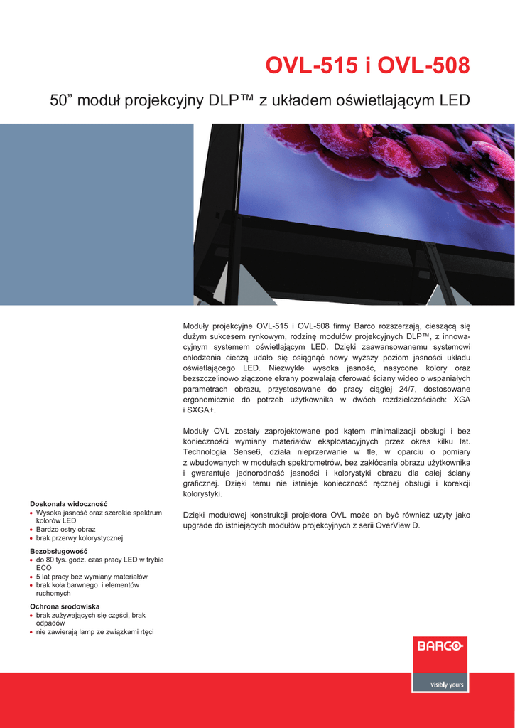 OVL-515 i OVL-508 50” moduł projekcyjny DLP™ z układem oświetlającym LED Moduły projekcyjne OVL-515 i OVL-508 firmy Barco rozszerzają, cieszącą się dużym sukcesem rynkowym, rodzinę modułów projekcyjnych DLP™, z innowacyjnym systemem oświetlającym LED. Dzięki zaawansowanemu systemowi chłodzenia cieczą udało się osiągnąć nowy wyższy poziom jasności układu oświetlającego LED. Niezwykle wysoka jasność, nasycone kolory oraz bezszczelinowo złączone ekrany pozwalają oferować ściany wideo o wspaniałych parametrach obrazu, przystosowane do pracy ciągłej 24/7, dostosowane ergonomicznie do potrzeb użytkownika w dwóch rozdzielczościach: XGA i SXGA+. Moduły OVL zostały zaprojektowane pod kątem minimalizacji obsługi i bez konieczności wymiany materiałów eksploatacyjnych przez okres kilku lat. Technologia Sense6, działa nieprzerwanie w tle, w oparciu o pomiary z wbudowanych w modułach spektrometrów, bez zakłócania obrazu użytkownika i gwarantuje jednorodność jasności i kolorystyki obrazu dla całej ściany graficznej. Dzięki temu nie istnieje konieczność ręcznej obsługi i korekcji kolorystyki. Doskonała widoczność Wysoka jasność oraz szerokie spektrum kolorów LED Bardzo ostry obraz brak przerwy kolorystycznej Bezobsługowość do 80 tys. godz. czas pracy LED w trybie ECO 5 lat pracy bez wymiany materiałów brak koła barwnego i elementów ruchomych Ochrona środowiska brak zużywających się części, brak odpadów nie zawierają lamp ze związkami rtęci Dzięki modułowej konstrukcji projektora OVL może on być również użyty jako upgrade do istniejących modułów projekcyjnych z serii OverView D. Specyfikacja techniczna OVL-515 i OVL-508 Rozdzielczość Napięcie wejściowe Jasność Zasilanie SXGA+, 1400x1050 natywna XGA, 1024x768 (1) Strumień świetlny typ. 1000 lumenów Kontrast dynamiczny / statyczny 1.200.000:1 / 1.500:1 Kolory Punkt bieli max 350 170 typ. max ECO 785 1195 580 Pixel clock Jednorodność 320 MHz Typ. 95% ANSI 13 Częstotliwość sygnału wejściowego Typ ekranu 24-62 Hz <0,8mm ekran modułowy Genlock 49-61 Hz Autokalibracja z wbudowanym spektrometrem – Sense 1 ramka Wymiary (SxWx(G1)G2) Przetwarzanie sygnału 1000 x 750 x (664,5) 735 mm 39,4 x 29,52 x (26,2) 28,9” Przejście sygnału (loop through) do 10 modułów Skalowanie i podział (cropping) Źródło światła Bezpośredni dostęp poprzez sieć 6 redundantnych struktur LED dla każdego koloru R,G,B Wbudowany serwer www Czas życia struktur LED Graficzny interfejs użytkownika GUI 6 >60.000g przy pełnej jasności, >80.000 g w trybie ECO Niezawodność struktur LED MTBF > 500.000 g Zalecany okres międzyobsługowy >5 lat Dożywotnia gwarancja na efekty wypalenia i retencji obrazu Zmiana ustawień i parametrów pracy Integracja ze sprzętem innych producentów Zewnętrzna kontrola ściany graficznej za pomocą innych urządzeń w oparciu o API dostępny poprzez przeglądarkę Gwarancja 2 lata Warunki pracy 10–40°C | 50-104°F wilgotność do 80% bez kondensacji Głośność <27dB (A) w odległości 5m od przodu ekranu Ekran G2 S G1 Typ ekranu BB FXS High gain (2) Kąty 1/2 wzmocnienia H/V 35° | 35° 34° | 33° 35° | 10° Kąty 1/5 wzmocnienia H/V 65° | 65° 46° | 45° 45° | 17° Luminancja w trybie wysokiej jasności 360 Cd/m 2 680 Cd/m 2 1680 Cd/m 2 Luminancja w trybie EBU / REC 709 315 Cd/m 2 595 Cd/m 2 1460 Cd/m 2 Luminancja w trybie ECO 190 Cd/m 2 355 Cd/m 2 875 Cd/m (1) W 2 przy maksymalnym wysyceniu kolorów - diody LED III generacji opcjonalnie na żądanie (2) Barco nv Pres. Kennedypark 35, B-8500 Kortrijk Europe, Middle East, Africa +32 56 26 20 09 Sierpień 2013 Barco jest firmą z certyfikatem ISO 9001 Specyfikacje techniczne mogą ulec zmianie bez wcześniejszego powiadomienia. Najbardziej aktualną wersję ulotki można znaleźć na www.barco.com www.barco.com ECO Minimalne opóźnienie ramki Stabilność kolorów Komunikacja Ekran Wydatek cieplny (BTU/h) typ. 230 3200K, 6500K i 9300K Przerwy ekranu Oświetlenie LED Moc (W) 2 x Dual-link DVI-D we 2 x Dual-link DVI-D wy do 165% EBU BB, FXS i High Gain Praca 90-240 VAC, 60-50 Hz We /wy sygnałowe Sygnał Cechy wyświetlacza OVL-515 OVL-508 Autoryzowany Dystrybutor AB-Micro Sp. z o.o. 02-777 Warszawa, ul. Kulczyńskiego 14 tel. +48 22 545 15 00 www.abmicro.pl