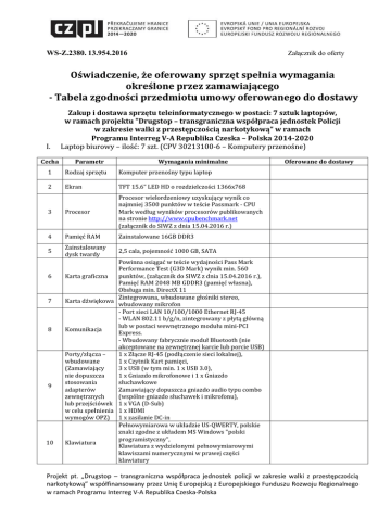 WS-Z.2380. 13.954.2016 Załącznik do oferty Oświadczenie, że oferowany sprzęt spełnia wymagania określone przez zamawiającego - Tabela zgodności przedmiotu umowy oferowanego do dostawy I. Cecha Zakup i dostawa sprzętu teleinformatycznego w postaci: 7 sztuk laptopów, w ramach projektu "Drugstop – transgraniczna współpraca jednostek Policji w zakresie walki z przestępczością narkotykową" w ramach Programu Interreg V-A Republika Czeska – Polska 2014-2020 Laptop biurowy – ilość: 7 szt. (CPV 30213100-6 – Komputery przenośne) Parametr Wymagania minimalne 1 Rodzaj sprzętu Komputer przenośny typu laptop 2 Ekran TFT 15.6” LED HD o rozdzielczości 1366x768 3 Procesor 4 Pamięć RAM 5 6 7 8 9 10 Zainstalowany dysk twardy Oferowane do dostawy Procesor wielordzeniowy uzyskujący wynik co najmniej 3500 punktów w teście Passmark - CPU Mark według wyników procesorów publikowanych na stronie http://www.cpubenchmark.net (załącznik do SIWZ z dnia 15.04.2016 r.) Zainstalowane 16GB DDR3 2,5 cala, pojemność 1000 GB, SATA Powinna osiągać w teście wydajności Pass Mark Performance Test (G3D Mark) wynik min. 560 Karta graficzna punktów, (załącznik do SIWZ z dnia 15.04.2016 r.), Pamięć RAM 2048 MB GDDR3 (pamięć własna), Obsługa min. DirectX 11 Zintegrowana, wbudowane głośniki stereo, Karta dźwiękowa wbudowany mikrofon - Port sieci LAN 10/100/1000 Ethernet RJ-45 - WLAN 802.11 b/g/n, zintegrowany z płytą główną lub w postaci wewnętrznego modułu mini-PCI Komunikacja Express. - Wbudowany fabrycznie moduł Bluetooth (nie akceptowane na zewnętrznej karcie lub porcie USB) Porty/złącza – 1 x Złącze RJ-45 (podłączenie sieci lokalnej), wbudowane 1 x Czytnik Kart pamięci, (Zamawiający 3 x USB (w tym min. 1 x USB 3.0), nie dopuszcza 1 x Gniazdo mikrofonowe i 1 x Gniazdo stosowania słuchawkowe adapterów Zamawiający dopuszcza gniazdo audio typu combo zewnętrznych (wspólne gniazdo słuchawek i mikrofonu), lub przejściówek 1 x VGA (D-Sub) w celu spełnienia 1 x HDMI wymogów OPZ) 1 x zasilanie DC-in Pełnowymiarowa w układzie US-QWERTY, polskie znaki zgodne z układem MS Windows "polski programistyczny", Klawiatura Klawiatura z wydzielonymi pełnowymiarowymi klawiszami numerycznymi w prawej części klawiatury Projekt pt. „Drugstop – transgraniczna współpraca jednostek policji w zakresie walki z przestępczością narkotykową” współfinansowany przez Unię Europejską z Europejskiego Funduszu Rozwoju Regionalnego w ramach Programu Interreg V-A Republika Czeska-Polska WS-Z.2380. 13.954.2016 Cecha Parametr Wymagania minimalne - Touch Pad (płytka wielodotykowa): z minimum dwoma klawiszami wyboru, - Bezprzewodowa mysz optyczna z nadajnikiem na złącze USB, 2 przyciski + rolka, nadajnik typu nano – wystający z portu USB nie więcej niż 1 cm 11 Urządzenia wskazujące 12 Kamera 13 Akumulator Litowo-jonowy, 4-komorowy, min. 2200 mAh 14 Zasilacz Dedykowany do notebooka 15 Ciężar Waga max do 2500g z baterią i napędem optycznym. 16 System operacyjny 17 Oprogramowani e 18 Torba 19 Gwarancja Załącznik do oferty Oferowane do dostawy Wbudowana kamera 1.0 Mpix Zainstalowany system operacyjny gwarantujący poprawną i niezakłóconą pracę z posiadanymi systemami wykorzystywanymi przez zamawiającego (KSIP, SWD), Zamawiający aktualnie korzysta z systemów Windows 2000/XP/7/8, Nie dopuszcza się systemów do zastosowań domowych. - Zainstalowane i aktywowane (jeśli wymagane) oprogramowanie, komplet nośników, niezbędne do prawidłowego funkcjonowania komputera (m.in. sterowniki do elementów składowych komputera). - Zintegrowany, pakiet aplikacji biurowych w najnowszej dostępnej wersji zawierający min: edytor tekstu, arkusz kalkulacyjny, edytor prezentacji, zgodny z formatami: .doc, ,docx, xls, .xlsx, .odt, .ppt, pptx w zakresie poprawnego odczytu i zapisu oraz przetwarzania makr VBA. Licencja wieczysta na jedno stanowisko. Nie dopuszcza się oprogramowania do zastosowań domowych. Zamawiający aktualnie w tym zakresie korzysta z pakietów biurowych Microsoft Office. Torba dostosowana do wymiarów notebooka. 12 miesięcy gwarancji producenta na laptopa, 12 miesięcy gwarancji producenta na baterię, Dysk twardy w razie awarii nie podlega zwrotowi, ani wysyłce do firmy zewnętrznej w celu diagnozy uszkodzenia. Diagnoza uszkodzenia możliwa wyłącznie w miejscu dostawy sprzętu. *Testy wydajnościowe dotyczą wydajności poszczególnych parametrów (procesora lub karty graficznej) i nie odnoszą się do wydajności komputera jako całości. Wydajność komputera może się różnić w zależności od zastosowanych elementów składowych, Wydajność całkowita komputera nie stanowi kryterium oceny danej oferty. BĘDĄC UPRAWNIONY DO REPREZENTACJI WYKONAWCY OŚWIADCZAM, ŻE OFEROWANY SPRZĘT SPEŁNIA WYMAGANIA OKREŚLONE PRZEZ ZAMAWIAJĄCEGO ...................................................................................................................................... (podpis Wykonawcy bądź upełnomocnionego przedstawiciela Wykonawcy) Projekt pt. „Drugstop – transgraniczna współpraca jednostek policji w zakresie walki z przestępczością narkotykową” współfinansowany przez Unię Europejską z Europejskiego Funduszu Rozwoju Regionalnego w ramach Programu Interreg V-A Republika Czeska-Polska