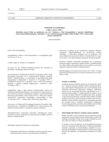 20 Dziennik Urzędowy Unii Europejskiej 19/t. 1 DZIENNIK URZĘDOWY WSPÓLNOT EUROPEJSKICH L 63/2 PL 31996F0196 13.3.1996 WSPÓLNE STANOWISKO z dnia 4 marca 1996 r. określone przez Radę na podstawie art. K.3 Traktatu o Unii Europejskiej w sprawie jednolitego stosowania definicji pojęcia „uchodźca” w art. 1 Konwencji genewskiej z dnia 28 lipca 1951 r. dotyczącej statusu uchodźców (96/196/WSiSW) RADA UNII EUROPEJSKIEJ, uwzględniając Traktat o Unii Europejskiej, w szczególności jego art. K.3 ust. 2 lit. a), a także mając na uwadze, co następuje: na mocy art. K.1 Traktatu polityka azylowa jest uważana za przedmiot wspólnego zainteresowania; na posiedzeniu w Strasburgu w dniach 8 i 9 grudnia 1990 r. Rada Europejska postawiła za cel harmonizację polityki azylowej Państw Członkowskich, co rozwinięto na posiedzeniach Rady Europejskiej w Maastricht w dniach 9 i 10 grudnia 1991 r., w Brukseli w dniach 10 i 11 grudnia 1993 r. oraz w komunikacie Komisji w sprawie polityki imigracyjnej i azylowej z dnia 23 lutego 1994 r.; — Wytyczne te podaje się do wiadomości organów administracyjnych odpowiedzialnych za przyznanie statusu uchodźcy, z zaleceniem przyjęcia ich za podstawę, bez uszczerbku dla orzecznictwa Państw Członkowskich w sprawach azylu i ich odpowiednich przepisów konstytucyjnych. — Niniejsze wspólne stanowisko przyjmuje się w granicach konstytucyjnych uprawnień rządów Państw Członkowskich; nie wiąże władz ustawodawczych ani nie wpływa na decyzje organów sądowych Państw Członkowskich. — Rada przegląda stosowanie wytycznych raz w roku i w miarę potrzeby przystosowuje je do nowych okoliczności we wnioskach o azyl. 1. Ustalenie statusu uchodźcy opiera się na kryteriach, zgodnie z którymi właściwe władze krajowe podejmują decyzję o przyznaniu ubiegającemu się o azyl ochrony przewidzianej Konwencją genewską. Niniejszy dokument odnosi się do stosowania kryteriów określonych w art. 1 Konwencji genewskiej. W żaden sposób nie wpływa on na warunki, na jakich Państwo Członkowskie może, zgodnie z jego prawem krajowym, zezwolić danej osobie na pobyt na jego terytorium, jeżeli jej bezpieczeństwo lub jej nietykalność cielesna byłyby zagrożone w przypadku powrotu do swojego kraju z powodu okoliczności nieobjętych Konwencją genewską, ale które stanowiłyby przeciwwskazania do odesłania jej do jej kraju pochodzenia. podkreślając wagę, z jaką Państwa Członkowskie, wierne ich wspólnej tradycji humanitarnej, przywiązują do zagwarantowania właściwej ochrony uchodźcom zgodnie z postanowieniami Konwencji genewskiej z dnia 28 lipca 1951 r. dotyczącej statusu uchodźców, zmienionej Protokołem nowojorskim z dnia 31 stycznia 1967 r., zwanej dalej „Konwencją genewską”; uznawszy, że Podręcznik Wysokiego Komisarza Narodów Zjednoczonych ds. Uchodźców (UNHCR) jest cenną pomocą dla Państw Członkowskich w określeniu statusu uchodźcy; zharmonizowane stosowanie kryteriów określających status uchodźcy stanowi podstawę do harmonizacji polityki azylowej Państw Członkowskich, PRZYJMUJE NINIEJSZE WSPÓLNE STANOWISKO: — Niniejszym zatwierdza się określone poniżej wytyczne stosowania kryteriów uznania i przyjmowania uchodźców. Uznanie za uchodźcę 2. Indywidualne lub zbiorowe ustalenie statusu uchodźcy Każdy wniosek o azyl rozpatruje się na podstawie przedstawionych stanów faktycznych i okoliczności osobno dla każdego przypadku, biorąc pod uwagę obiektywną sytuację, jaka ma miejsce w kraju pochodzenia. W praktyce może się zdarzyć, że na prześladowania narażona jest cała grupa osób. Również w takich przypadkach wnioski rozpatruje się indywidualnie, jednakże w szczególnych przypadkach rozpatrywanie to może zostać ograniczone do ustalenia, czy jednostka przynależy do takiej grupy. 19/t. 1 3. PL Dziennik Urzędowy Unii Europejskiej — wynikać z powodów wymienionych w art. 1A: rasy, religii, narodowości, przynależności do określonej grupy społecznej lub przekonań politycznych. Powody prześladowań mogą się ze sobą pokrywać i często kumulują się, dotycząc tej samej osoby. Jest obojętne, czy te powody są rzeczywiste, czy tylko przypisane danej osobie przez prześladowcę. Ustanowienie dowodów wymaganych do przyznania statusu uchodźcy Czynnikiem rozstrzygającym o przyznaniu statusu uchodźcy zgodnie z Konwencją genewską jest zaistnienie uzasadnionych obaw przed prześladowaniem z powodów rasy, religii, narodowości, przekonań politycznych lub przynależności do określonej grupy społecznej. Kwestię, czy obawa przed prześladowaniami jest uzasadniona, ocenia się, biorąc pod uwagę okoliczności każdego przypadku. Dowody potrzebne do oceny prawdziwości przedstawionych stanów faktycznych i okoliczności przedstawia ubiegający się o azyl. Należy przez to rozumieć, że gdy tylko wiarygodność deklaracji ubiegającego się o azyl zostanie dostatecznie ustalona, nie ma potrzeby poszukiwania szczegółowego potwierdzenia przedstawionych stanów faktycznych i jeżeli nie ma poważnych powodów, aby postąpić inaczej, wszelkie wątpliwości powinny rozstrzygać się na korzyść ubiegającego się o azyl. Fakt, że jednostka była już przedmiotem prześladowania lub bezpośrednich gróźb prześladowania poważnie wskazuje na ryzyko prześladowania, chyba że od tego czasu w jej kraju pochodzenia lub w jej stosunkach z jej krajem pochodzenia miała miejsce znacząca zmiana okoliczności. Fakt, że jednostka przed jej wyjazdem z jej kraju pochodzenia nie była przedmiotem prześladowania lub bezpośrednio zagrożona prześladowaniem nie oznacza per se, że nie może w postępowaniu azylowym dowodzić istnienia uzasadnionych obaw przed prześladowaniem. 4. „Prześladowanie” w rozumieniu art. 1A Konwencji genewskiej Termin „prześladowanie”, tak jak jest używany w niniejszym dokumencie, pochodzi z art. 1 ust. A Konwencji genewskiej. Termin ten ni