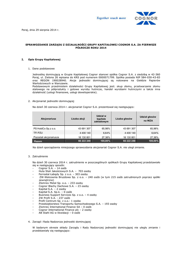 SPRAWOZDANIE ZARZĄDU Z DZIAŁALNOŚCI GRUPY KAPITAŁOWEJ COGNOR S.A. ZA PIERWSZE