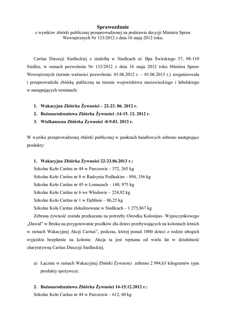 Sprawozdanie z wyników zbiórki publicznej przeprowadzonej na podstawie decyzji Ministra Spraw Wewnętrznych Nr 133/2012 z dnia 16 maja 2012 roku. Caritas Diecezji Siedleckiej z siedzibą w Siedlcach ul. Bpa Świrskiego 57, 08-110 Siedlce, w ramach pozwolenia Nr 133/2012 z dnia 16 maja 2012 roku Ministra Spraw Wewnętrznych (termin ważności pozwolenia: 01.06.2012 r. – 01.06.2013 r.) zorganizowała i przeprowadziła zbiórkę publiczną na terenie województwa mazowieckiego i lubelskiego w następujących terminach: 1. Wakacyjna Zbiórka Żywności – 22-23. 06. 2012 r. 2. Bożonarodzeniowa Zbiórka Żywności -14-15. 12. 2012 r. 3. Wielkanocna Zbiórka Żywności -8-9.03. 2013 r. W wyniku przeprowadzonej zbiórki publicznej w punktach handlowych zebrano następujące produkty: 1. Wakacyjna Zbiórka Żywności 22-23.06.2013 r.: Szkolne Koło Caritas nr 44 w Parczewie – 372, 265 kg Szkolne Koło Caritas nr 8 w Radzyniu Podlaskim – 894, 356 kg Szkolne Koło Caritas nr 45 w Łomazach – 140, 975 kg Szkolne Koło Caritas nr 6 we Włodawie – 224,92 kg Szkolne Koło Caritas nr 1 w Dęblinie – 86,25 kg Szkolne Koła Caritas zlokalizowane w Siedlcach – 1 275,867 kg Zebrana żywność została przekazana na potrzeby Ośrodka Kolonijno- Wypoczynkowego „Dawid” w Broku na przygotowanie posiłków dla dzieci przebywających na koloniach letnich w ramach Wakacyjnej Akcji Caritas”, podczas, której ponad 1000 dzieci z rodzin ubogich wyjeżdża bezpłatnie na kolonie. Akcja ta jest wpisana od wielu lat w działalność charytatywną Caritas Diecezji Siedleckiej. a) Łącznie w ramach Wakacyjnej Zbiórki Żywności zebrano 2 994,63 kilogramów typu produkty spożywcze. 2. Bożonarodzeniowa Zbiórka Żywności 14-15.12.2012 r.: Szkolne Koło Caritas nr 44 w Parczewie – 612, 60 kg Szkolne Koło Caritas nr 38 w Strzyżewie – 80,817 kg Szkolne Koło Caritas nr 24 w Gołąbkach – 68,750 kg Szkolne Koło Caritas nr 21 w Międzyrzecu Podlaskim – 623,56 kg Szkolne Koło Caritas nr 31 w Żelechowie – 237,034 kg Szkolne Koło Caritas nr 2 w Adamowie – 495,591 kg Szkolne Koło Caritas nr 6 we Włodawie – 410,60 kg Szkolne Koło Caritas nr 45 w Łomazach – 372,504 kg Szkolne Koło Caritas nr 60 w Międzyrzecu Podlaskim – 1560 kg Szkolne Koło Caritas nr 57 w Wohyniu – 138 kg Ośrodek „Misericordia” Caritas w Białej Podlaskiej – 2238,50 kg Zebrana żywność została przekazana w postaci paczek świątecznych dla osób znajdujących się w trudnej sytuacji życiowej i materialnej z terenu Diecezji Siedleckiej. Lista osób które skorzystały z takiej formy pomocy w załączeniu Na terenie Białej Podlaskiej, zebrana żywność w postaci paczek trafiła do podopiecznych Ośrodka „Misericordia” Caritas. Szkolne Koła Caritas zlokalizowane w Siedlcach – 2 457 kg Zebrana żywność została przeznaczona na przygotowanie posiłków dla osób znajdujących się w trudnej sytuacji materialnej i życiowej, korzystających z jadłodajni dla ubogich Caritas Diecezji Siedleckiej. a) Łącznie w ramach Bożonarodzeniowej Zbiórki Żywności zebrano kilogramów typu produkty spożywcze; 3. Wielkanocna Zbiórka Żywności 8-9.03.2013 r.: Szkolne Koło Caritas nr 6 we Włodawie – 310 kg Szkolne Koło Caritas nr 51 w Białej Podlaskiej – 1 914 kg Szkolne Koło Caritas nr 21 w Międzyrzecu Podlaskim – 420 kg Szkolne Koło Caritas nr 60 w Międzyrzecu Podlaskim – 443,17 kg Szkolne Koło Caritas nr 31 w Żelechowie – 289 kg Szkolne Koło Caritas nr 3 w Rykach – 500 kg Szkolne Koło Caritas nr 45 w Łomazach – 282 kg Szkolne Koło Caritas nr 44 w Parczewie – 600 kg Szkolne Koło Caritas nr 1 w Dęblinie – 120,305 kg 9 294,956 Zebrana żywność została przekazana w postaci paczek świątecznych dla osób znajdujących się w trudnej sytuacji życiowej i materialnej z terenu Diecezji Siedleckiej. Lista osób, które skorzystały z tej formy pomocy w załączeniu. Na terenie Białej Podlaskiej, zbiórkę koordynował Ośrodek „Misericordia” Caritas i pozyskaną żywność przekazał na paczki swoim podopiecznym. Szkolne Koła Caritas zlokalizowane w Siedlcach – 1 337 kg Zebrana żywność została przeznaczona na przygotowanie posiłków dla osób znajdujących się w trudnej sytuacji materialnej i życiowej, korzystających z jadłodajni dla ubogich Caritas Diecezji Siedleckiej. a) Łącznie w ramach Wielkanocnej Zbiórki żywności 6 215,475 kg typu produkty spożywcze; Łącznie w ramach zbiórki publicznej zebrano: a) 18 505,061 kg darów typu produkty spożywcze Zbiórka została przeprowadzona w formie zbiórki artykułów żywnościowych o przedłużonym terminie ważności tj. makaron, mąka, cukier, konserwy, słodycze, kawa, herbata itp. w pomieszczeniach sklepów, które uprzednio wyraziły zgodę na przeprowadzenie zbiórki. W zbiórce publicznej, łącznie podczas wszystkich akcji wzięło udział 1 235 wolontariuszy z całej Diecezji Siedleckiej. Przekazano paczki w łącznej liczbie 1072 szt., które stanowiły duże wsparcie dla osób najbardziej potrzebujących, znajdujących się w szczególnie ciężkiej sytuacji życiowej i materialnej, chorych, niepełnosprawnych, samotnych matek itp. w okresie przedświątecznym. Koszty przeprowadzenia zbiórki publicznej zostały pokryte ze środków własnych Caritas Diecezji Siedleckiej w kwocie: w tym : paliwo w kwocie: 249,91 zł. plakaty, ulotki, otrzymane nieodpłatnie z Caritas Polska. Zebrane produkty zostały wydatkowane wyłącznie na terytorium Rzeczypospolitej Polskiej. Osoby, które brały udział w zbiórce żywności nie otrzymały wynagrodzenia. Załączniki: 1.Kopia ogłoszenia o wynikach zbiórki publicznej. 2. Listy osób potwierdzające skorzystanie z pomocy w ramach zbiórki publicznej.
